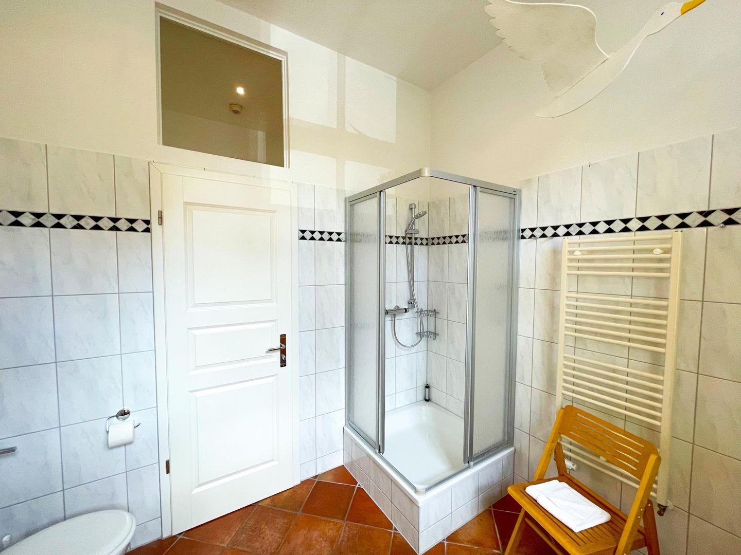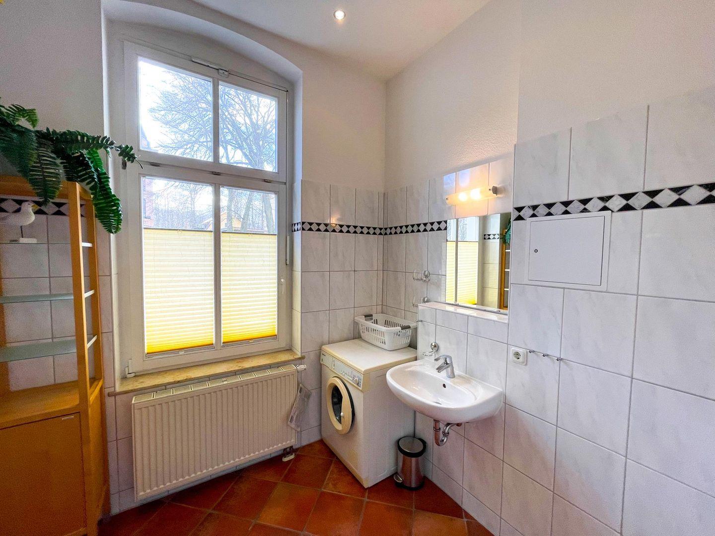 Im Badezimmer stehen dem Gast neben der erwähnten Waschmaschine Dusche, Waschbecken und WC zur Verfügung. Große Fenster sorgen für ausreichend Frischluftzufuhr. Ein Fön ist vorhanden.