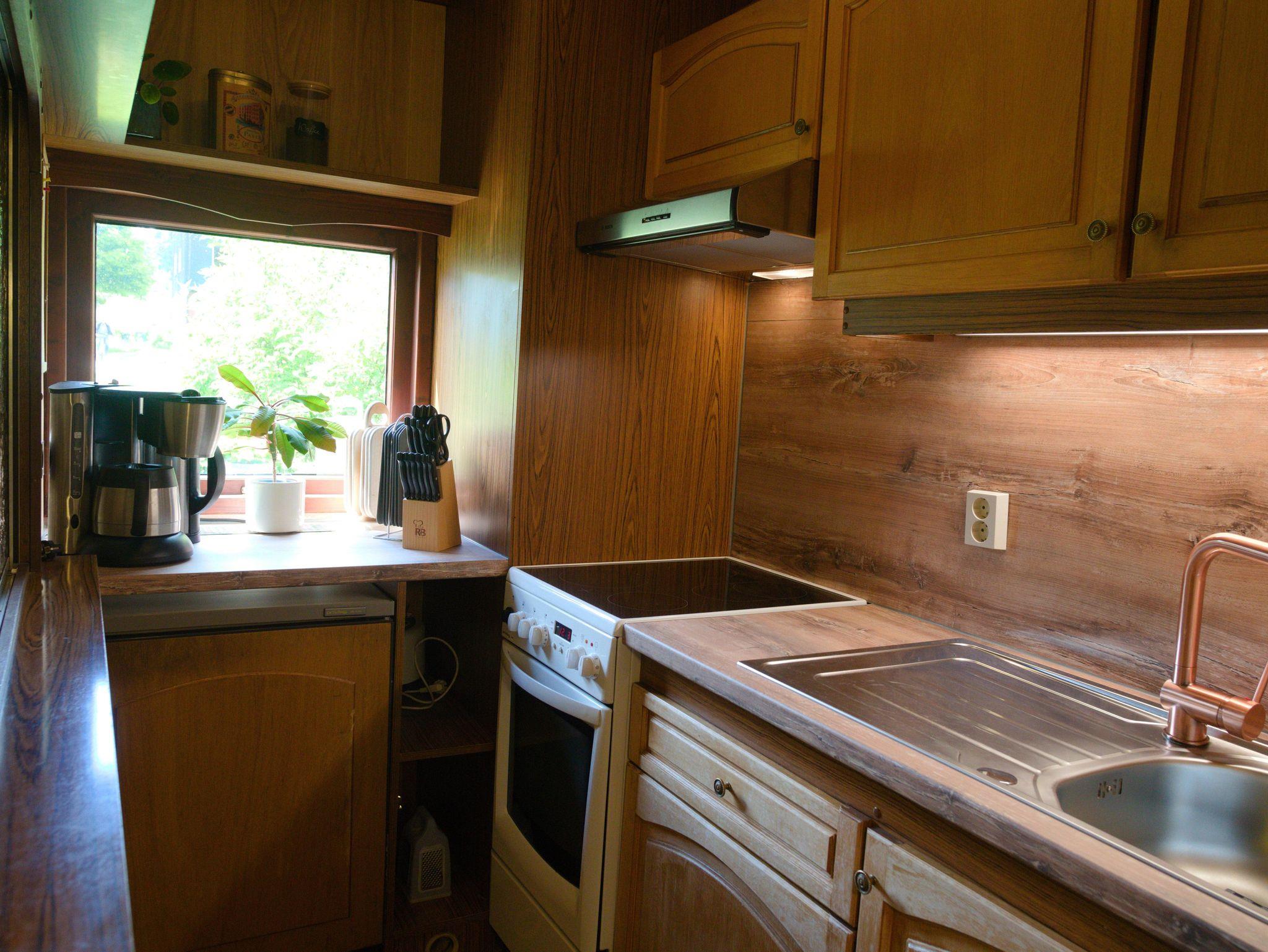 Die Küche ist mit einen vollwertigen Herd mit Backofen, Wasserkocher, Kaffeemaschine, Toaster und ausreichend Geschirr, Töpfen und Besteck ausgestattet.