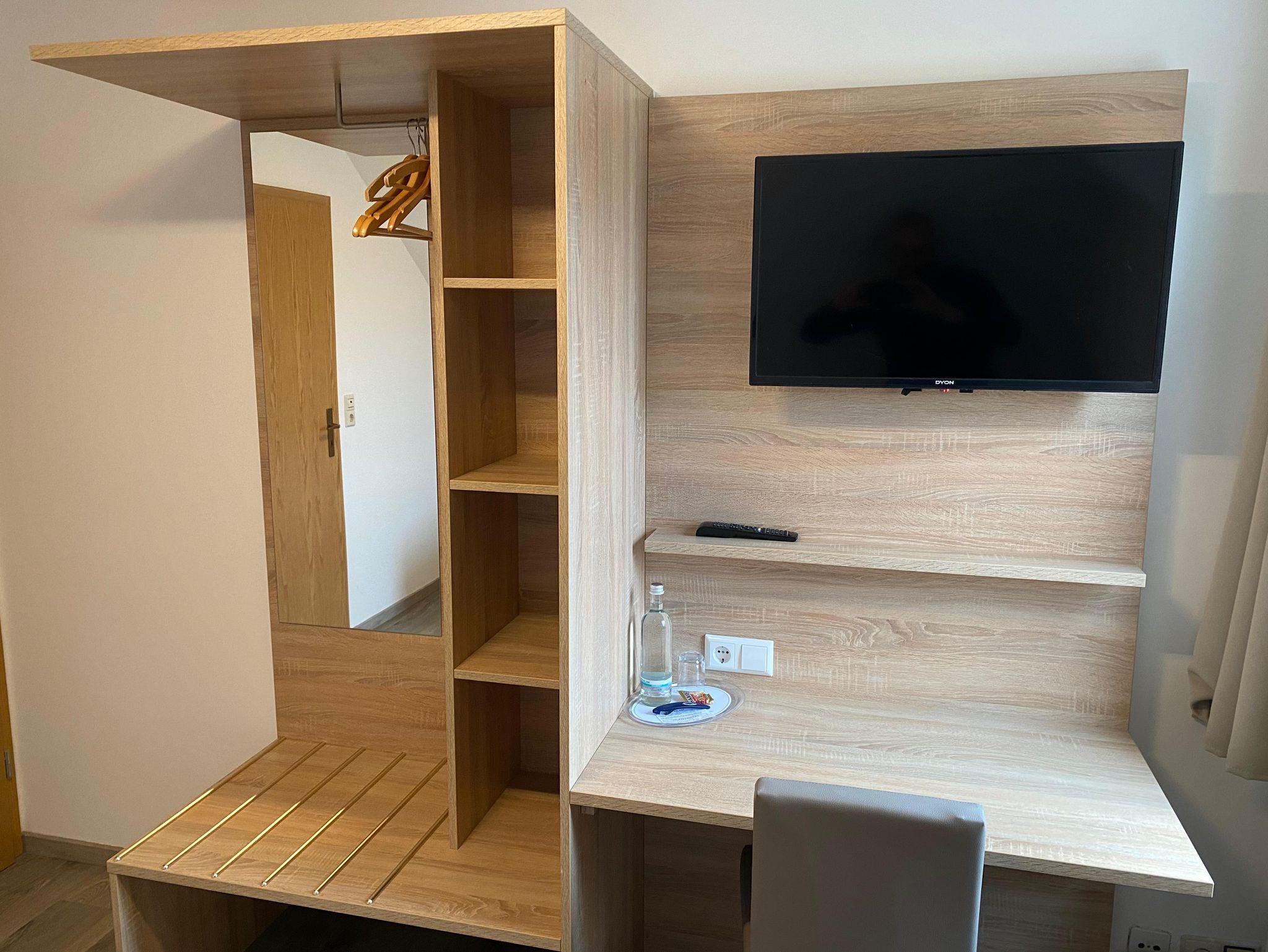 Unsere Klassik-Zimmer sind funktional und gemütlich eingerichtet – ideal für einen entspannten Aufenthalt. Zur Ausstattung gehören ein komfortables Bett sowie ein offener Kleiderschrank, der ausreichend Platz für Ihre Kleidung bietet. Das Badezimmer ist mit Dusche, WC und Föhn ausgestattet.