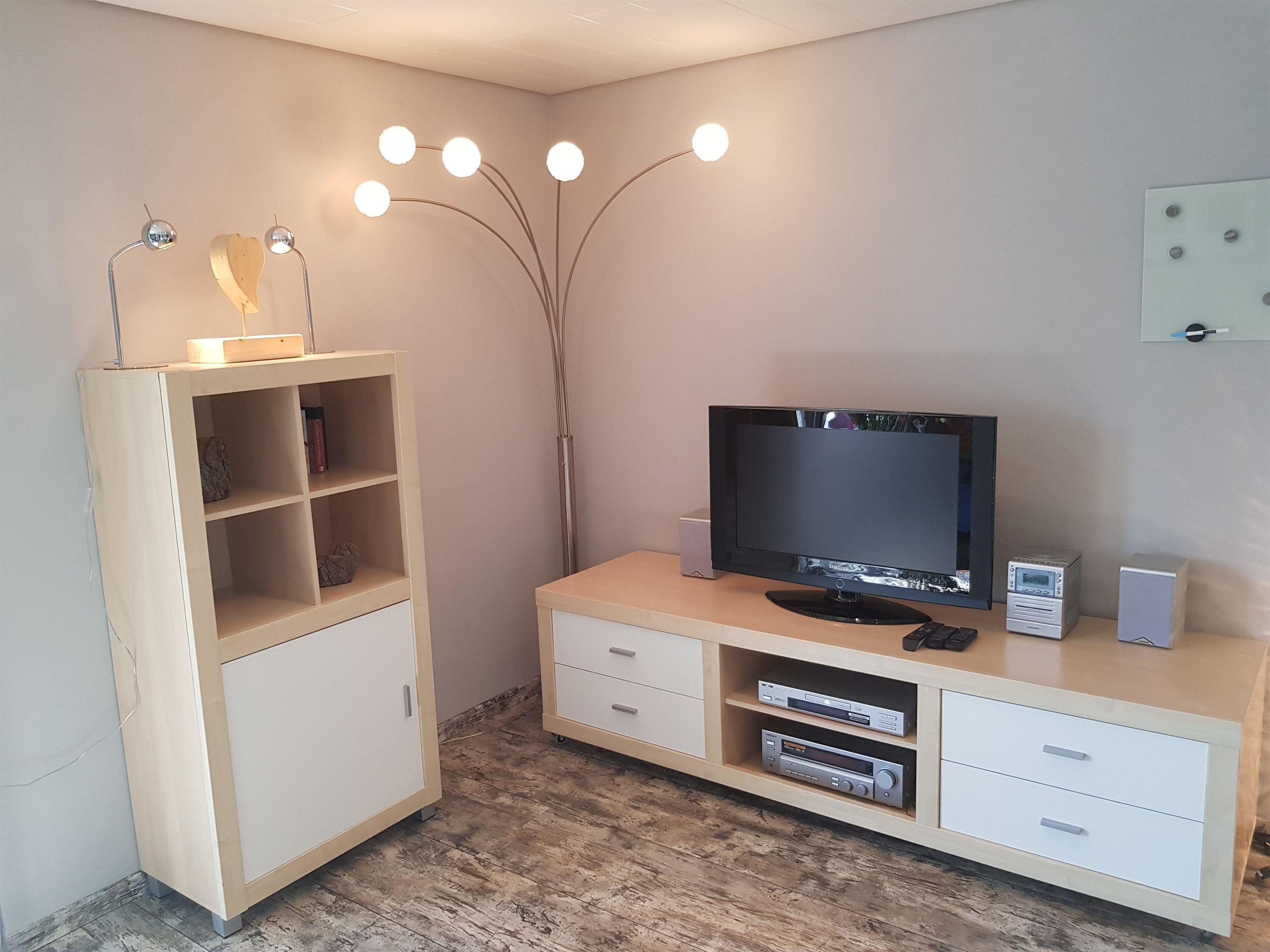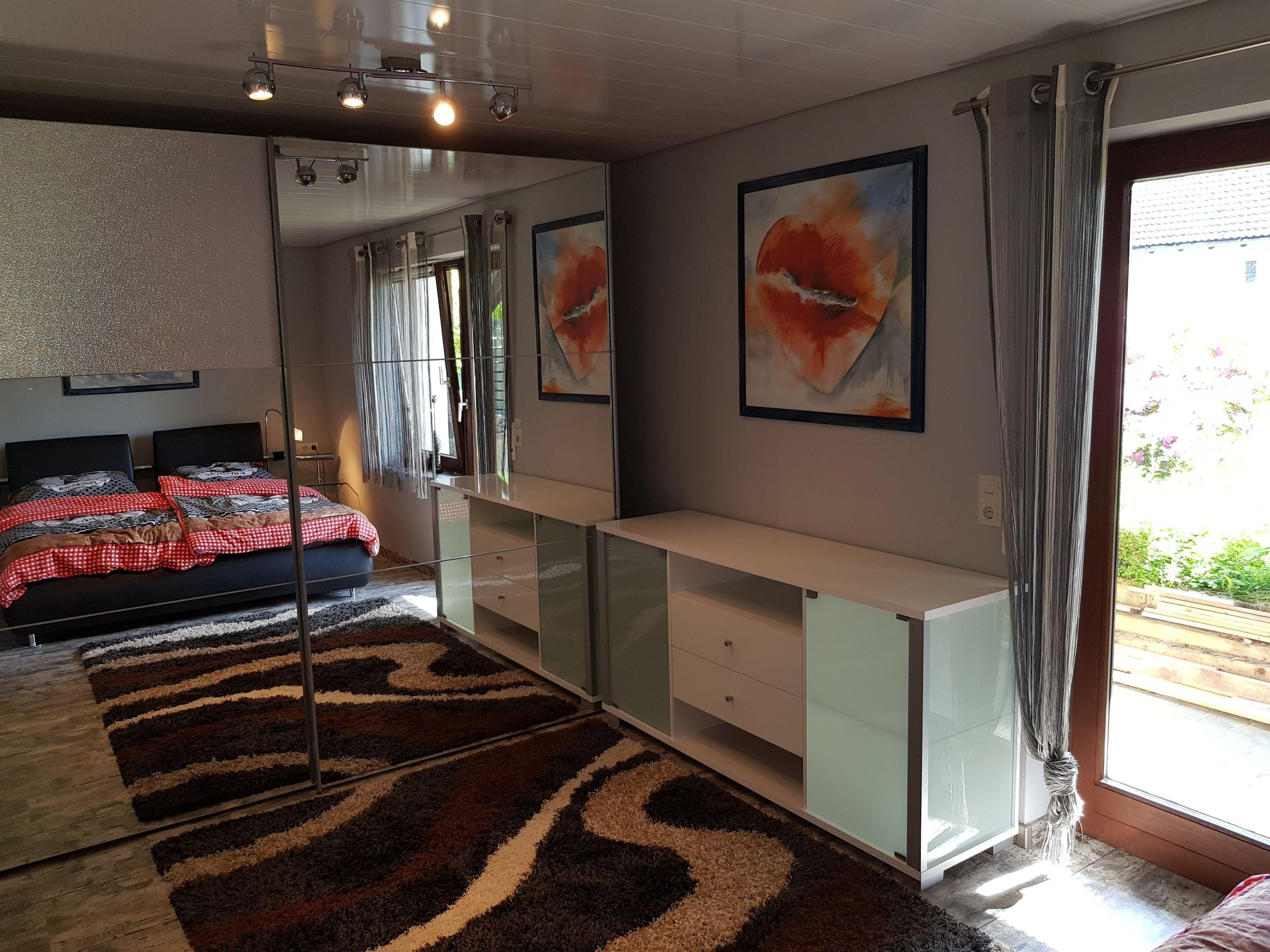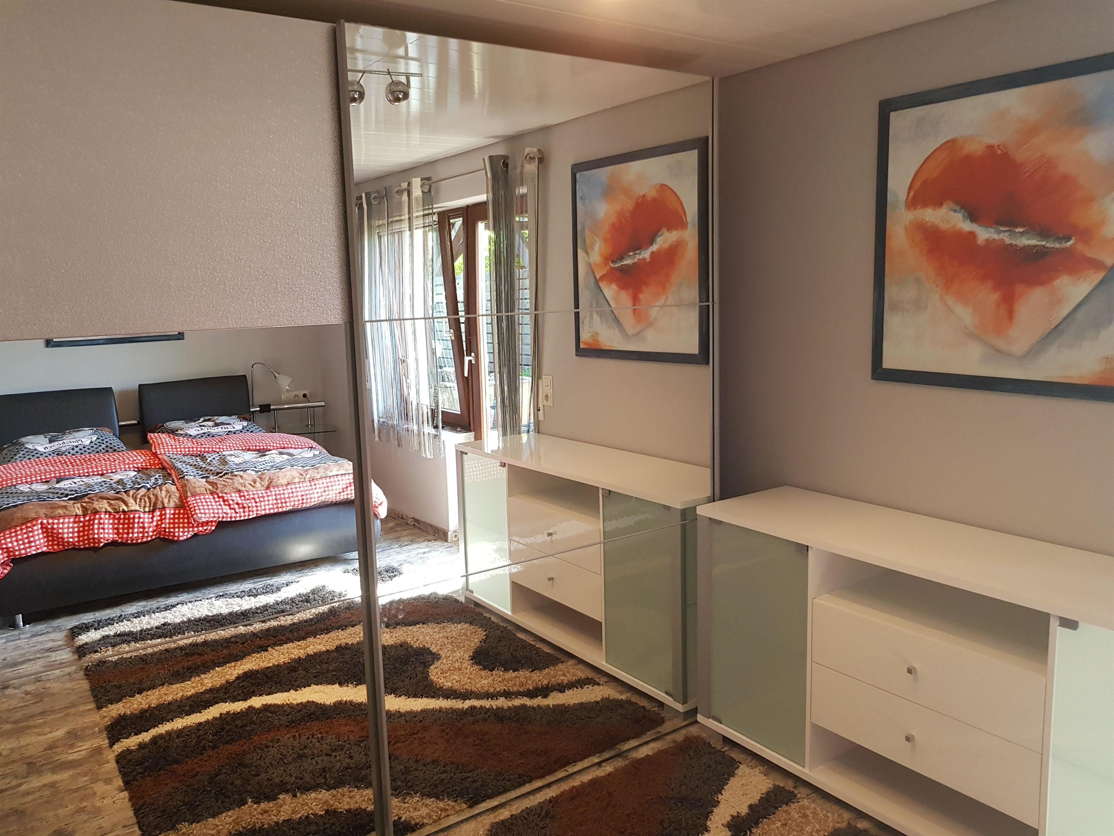 Modern eingerichtete Ferienwohnung mit offener Küche und Flachbildschirm TV. Modernes Doppelbett und großer Kleiderschrank.