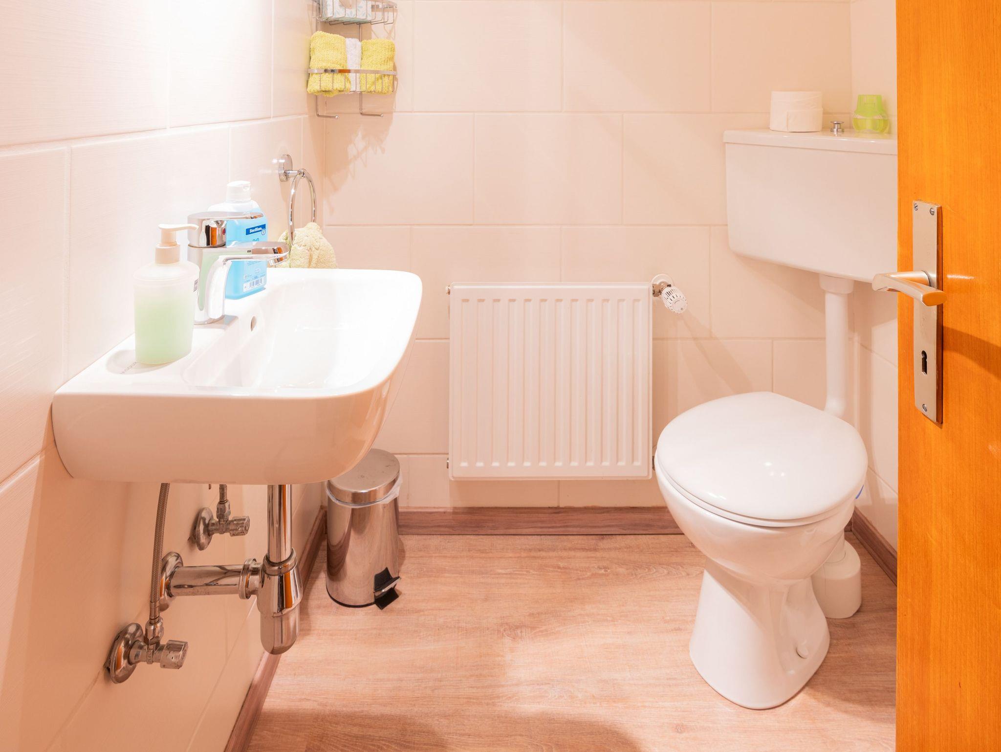 Ein zusätzliches WC mit Waschbecken ist im Obergeschoß vorhanden.