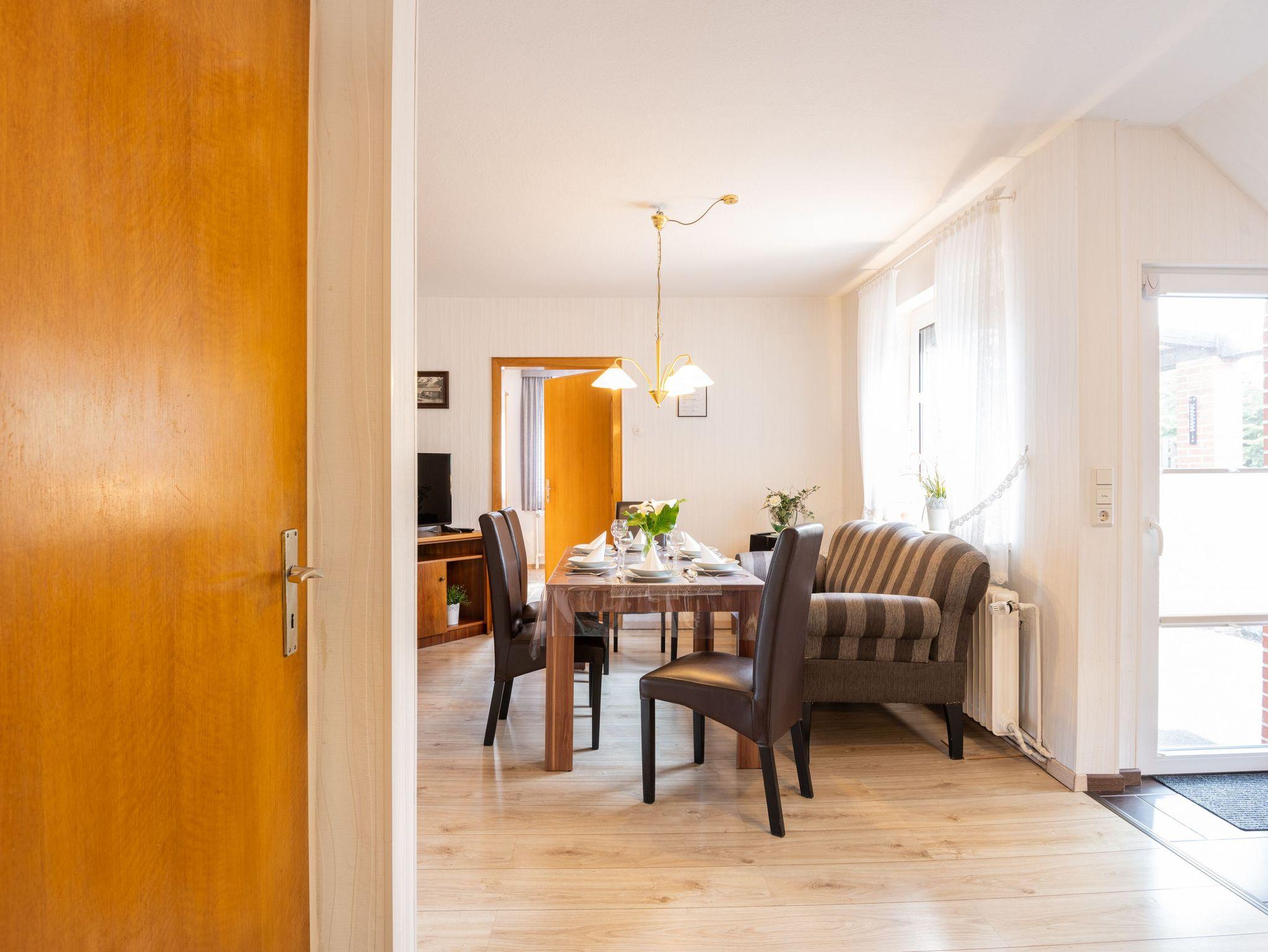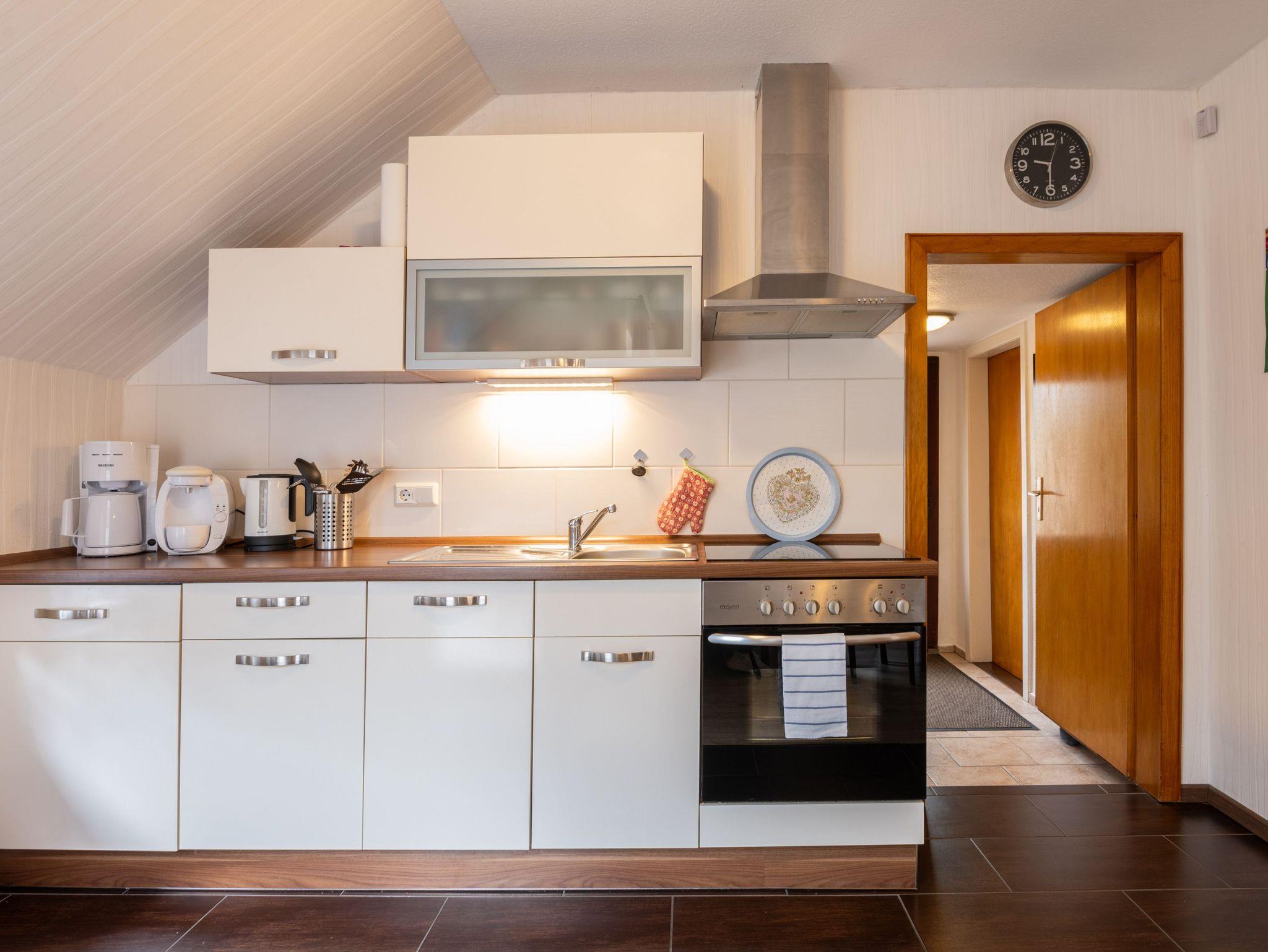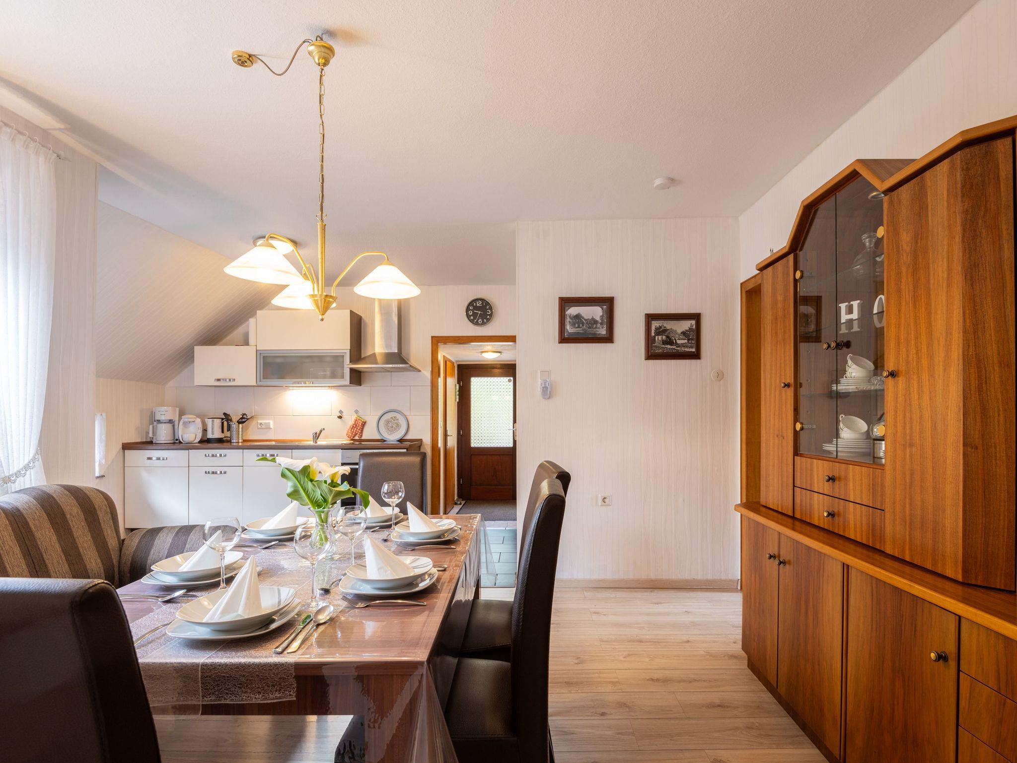Im Erdgeschoss befinden sich eine komplett eingerichtete Wohnküche mit Essbereich: großer Tisch, gemütliches Ostfriesensofa sowie vier Stühle (auch Kinderhochstuhl vorhanden). Eine Einbauküche mit Spülmaschine, Kühlschrank inkl. Gefrierfach, Mikrowelle, Kaffeefiltermaschine, Tassimo, Toaster, Mixer, Küchenmaschine und allem was man benötigt. Ein TV-Flachbildschirm steht in der gemütlichen Wohnküche. Angrenzend das Schlafzimmer mit einem Doppelbett (1,80 m x 2,00 m) und ein 5-türiger Kleiderschrank.