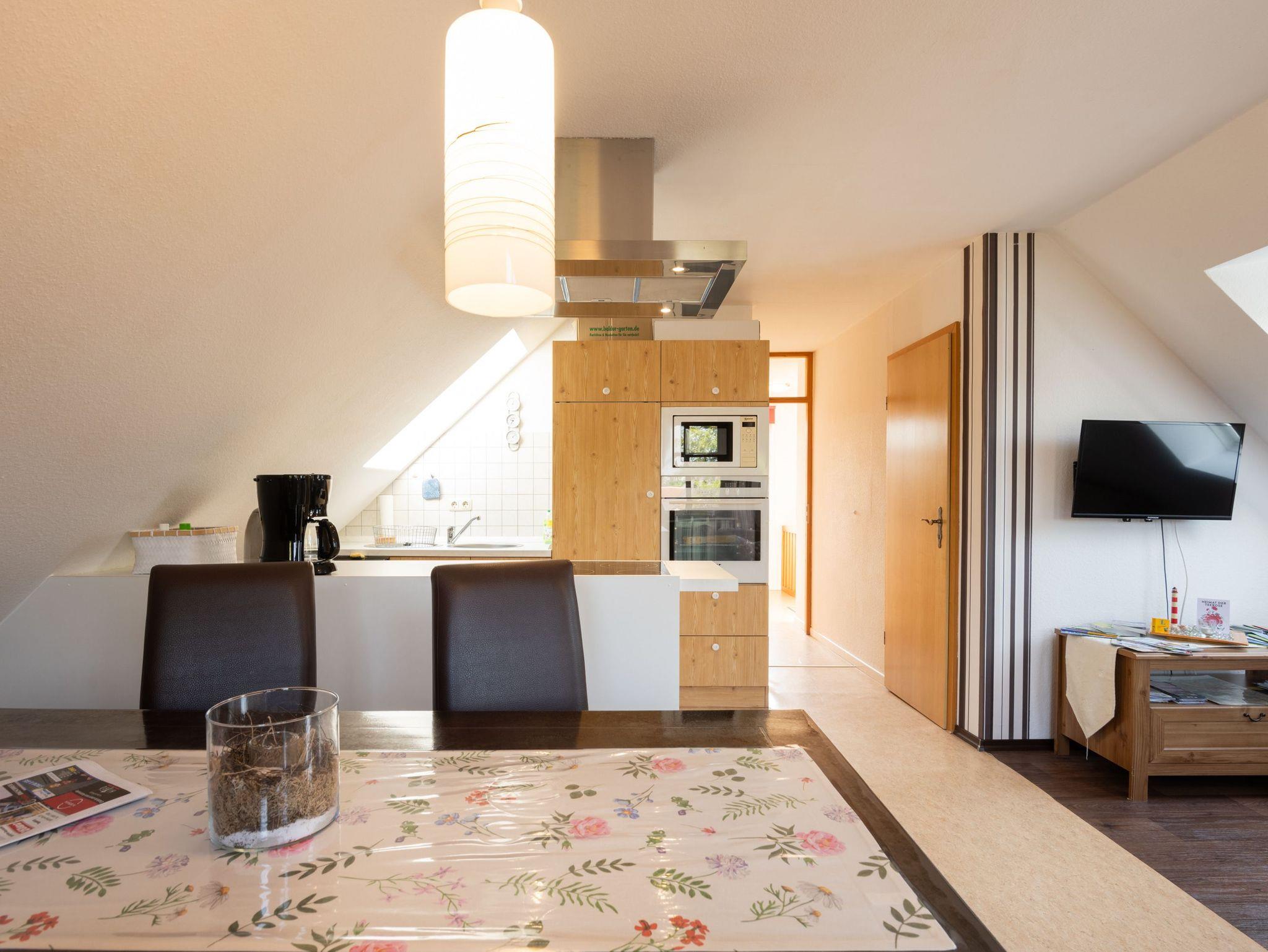 Schöne und geschmackvoll eingerichtete Ferienwohnung auf zwei Etagen am Ortsrand von Hesel (Ort ca. 4.000 Einwohner). Im Obergeschoß der Ferienwohnung befindet sich die Wohnküche mit zwei Schlafräumen. Die Wohnküche ist ausgestattet mit einer Spülmaschine, Wasserkocher, Mikrowelle, Kaffeemaschine, Toaster und Eierkocher. Zur Wohnküchenausstattung gehört eine gemütliche Wohnzimmergarnitur, eine Einbauküche mit einem Esstisch mit vier Stühlen.