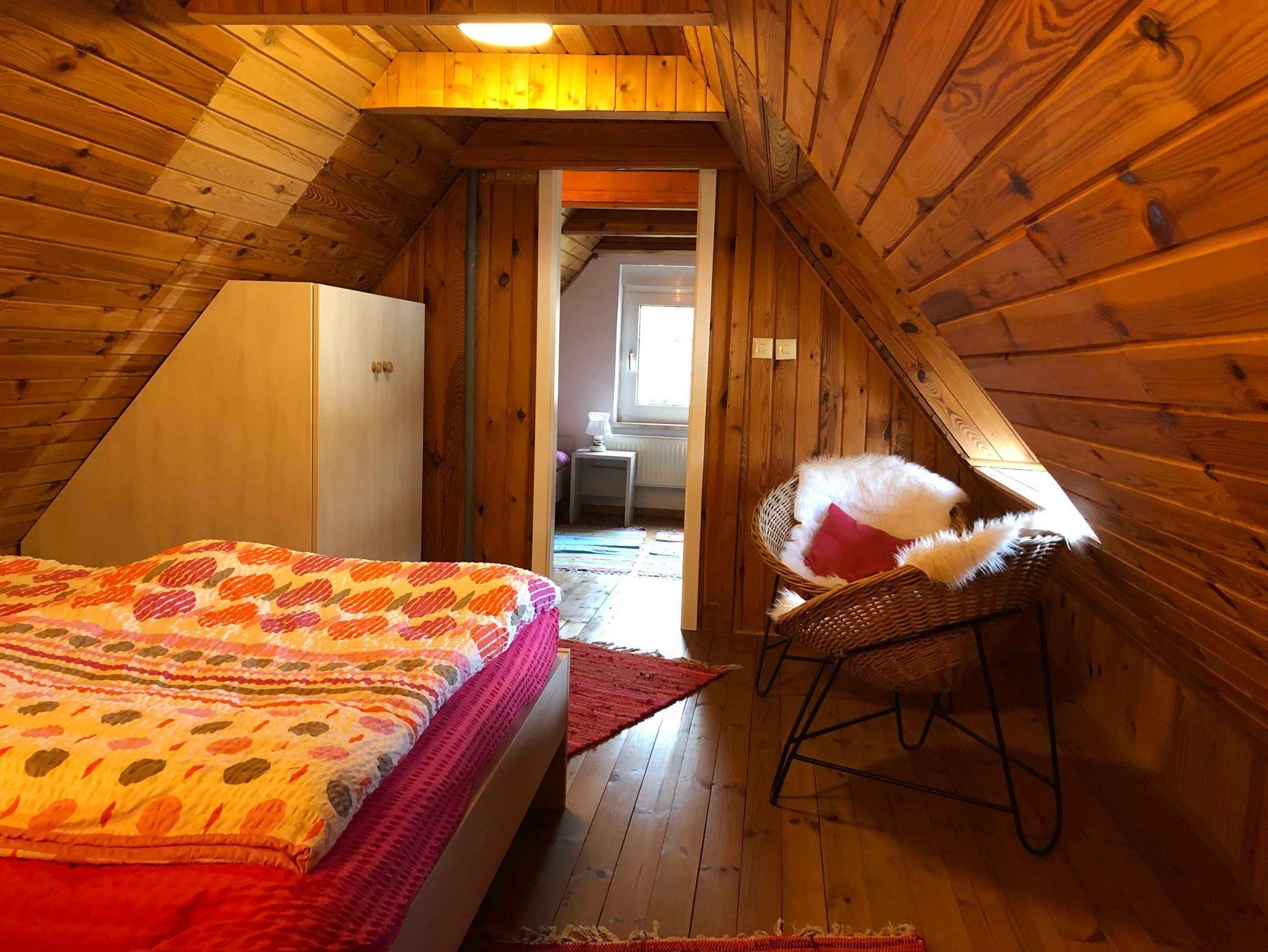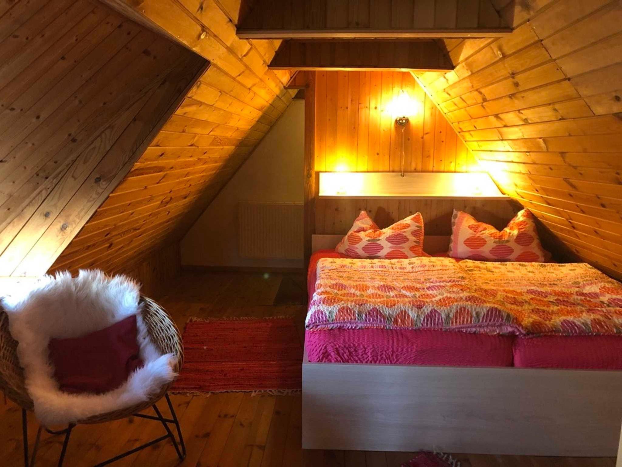 Über eine Treppe gelangen Sie zu den zwei Schlafräumen, welches mit einem Doppelbett und eines mit 2 Einzelbetten ausgestattet ist. Bitte beachten Sie, dass einer der Schlafräume ein Durchgangszimmer ist.