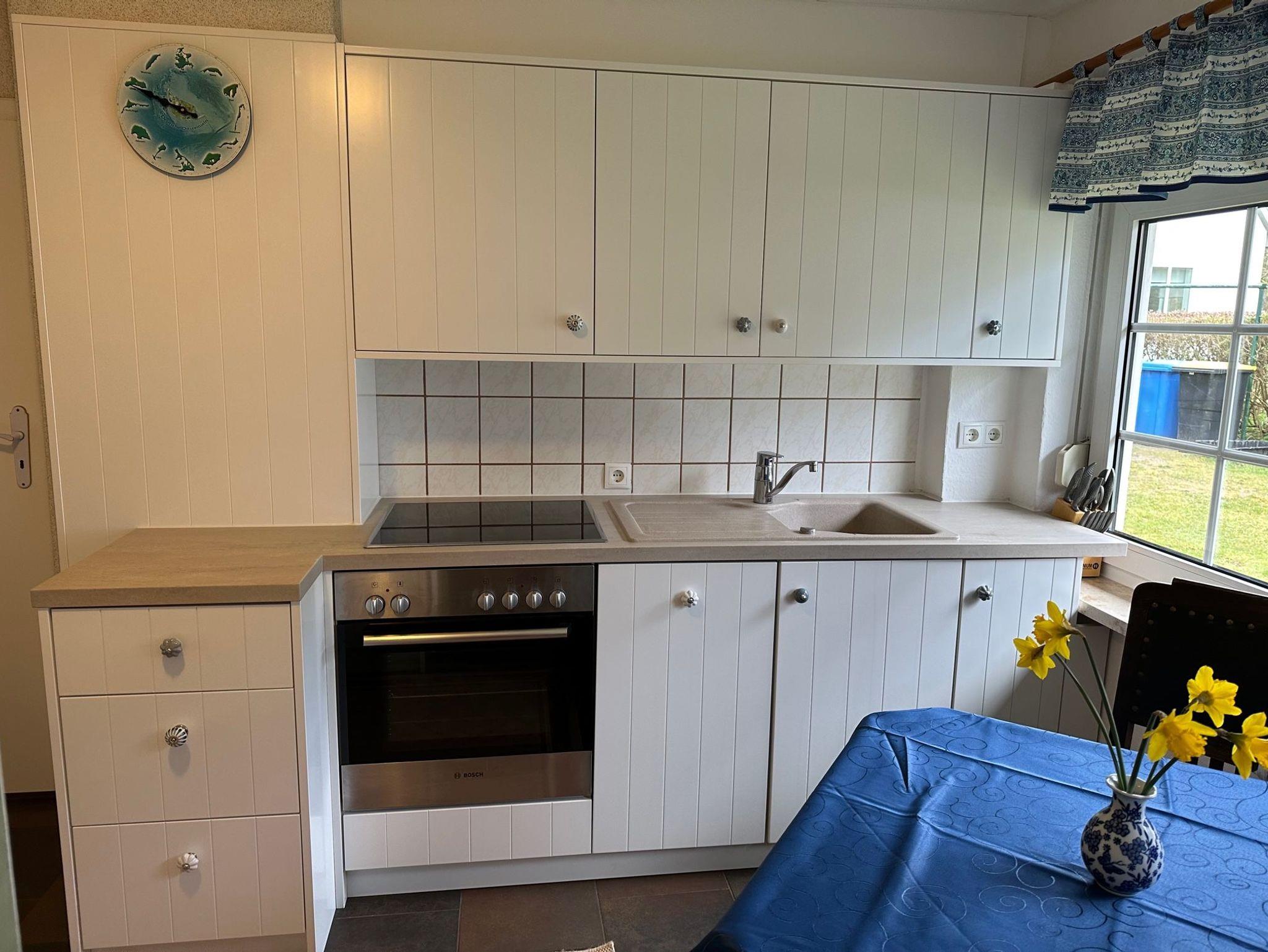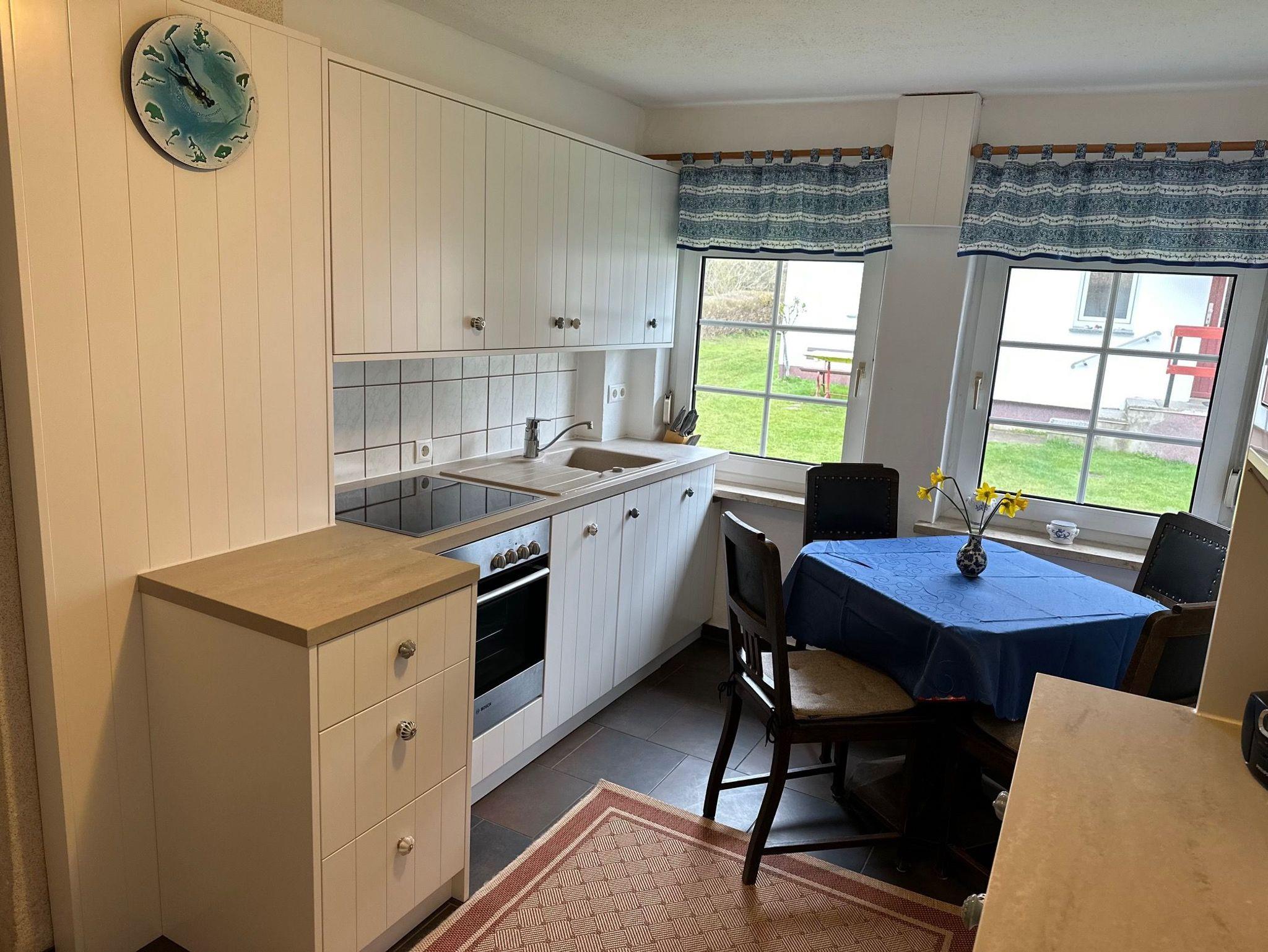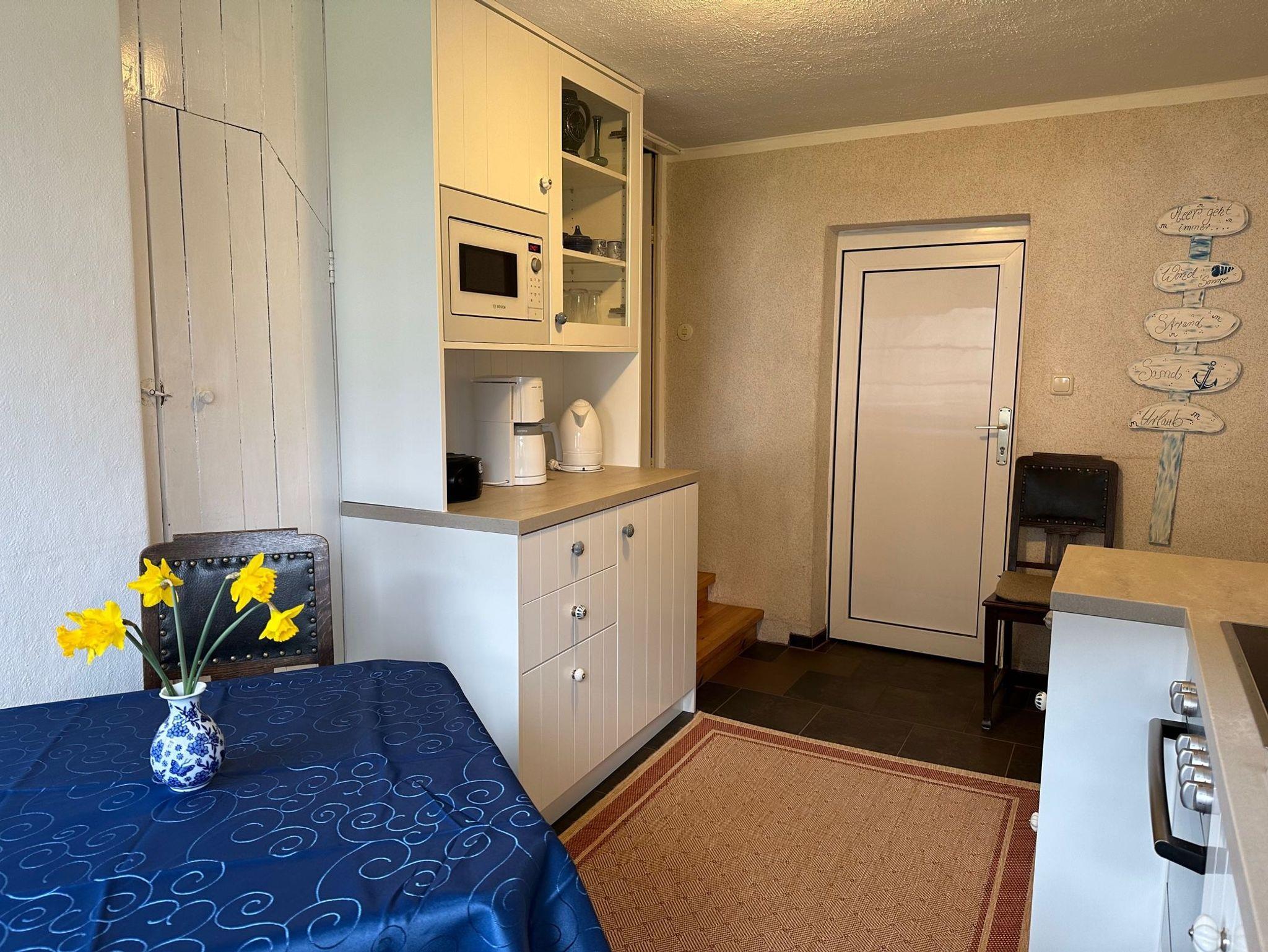 vollausgestattete Küche mit Backofen, Mikrowelle und Essgarnitur