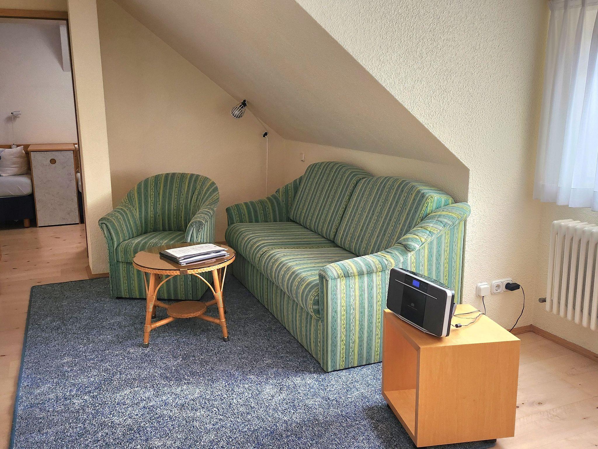 Dieses etwa 30 m² große Apartment im Dachgeschoss bietet viel Charme und eine durchdachte Raumaufteilung für zwei Personen. Der separate Schlafraum ist mit zwei getrennt stehenden Betten ausgestattet und lädt zu erholsamen Nächten ein. Im Wohnbereich sorgen sichtbare Dachbalken und Dachschrägen für eine behagliche Atmosphäre.