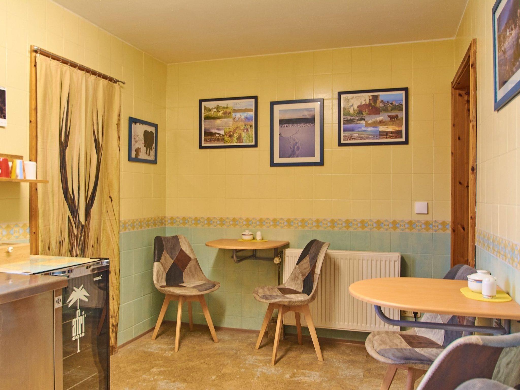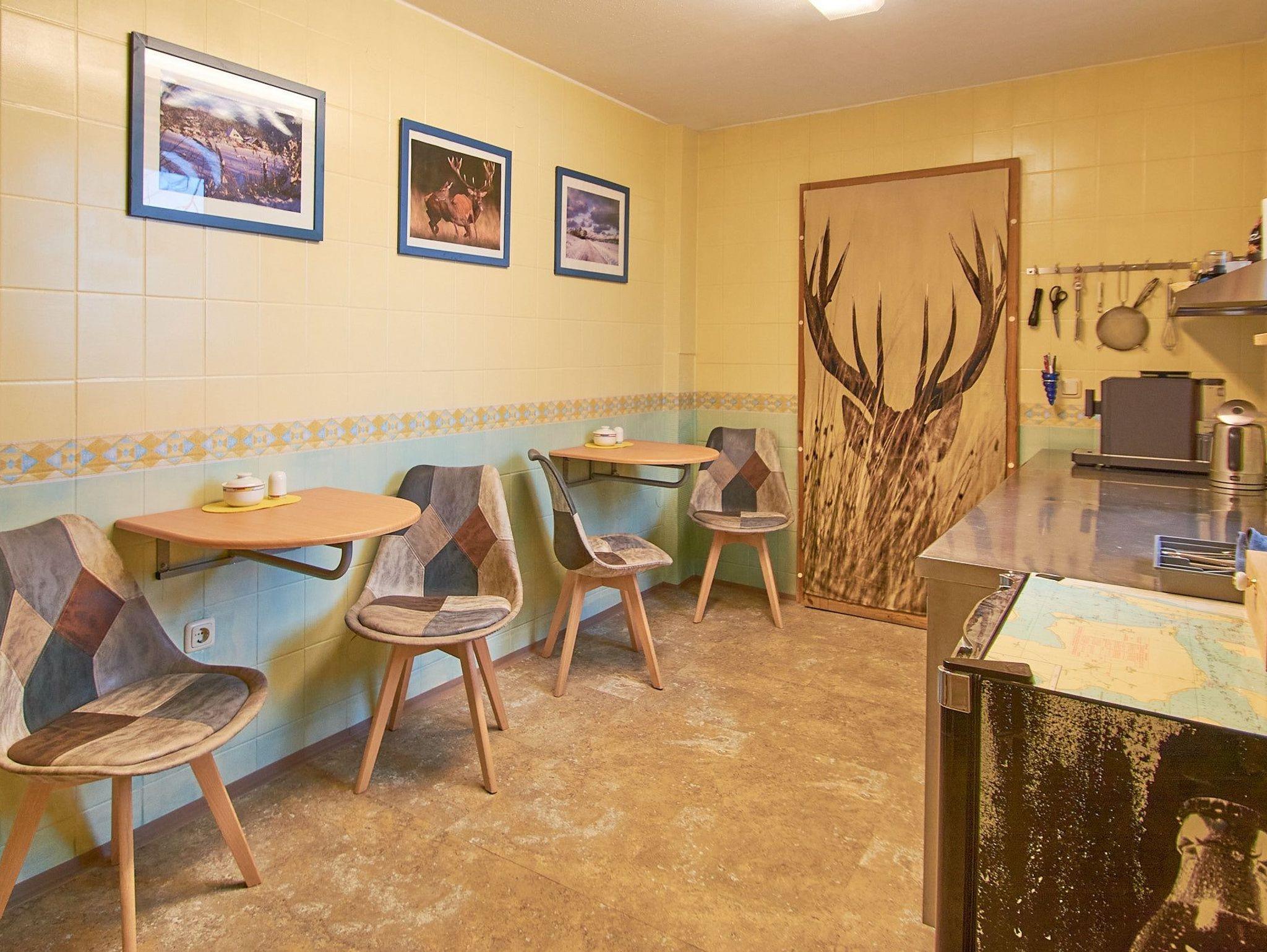 In der Teeküche (6 Sitzgelegenheiten), ausgestattet mit Kühlschrank, Wasserkocher, Kaffeemaschine, Geschirr,Besteck etc. können sie sich Ihr Frühstück zubereiten. Kaffee und Tee werden kostenfrei zur Verfügung gestellt. Der Raum ist ganztägig geöffnet ( Reinigung zwischen 12.30 und 14.00 Uhr).
