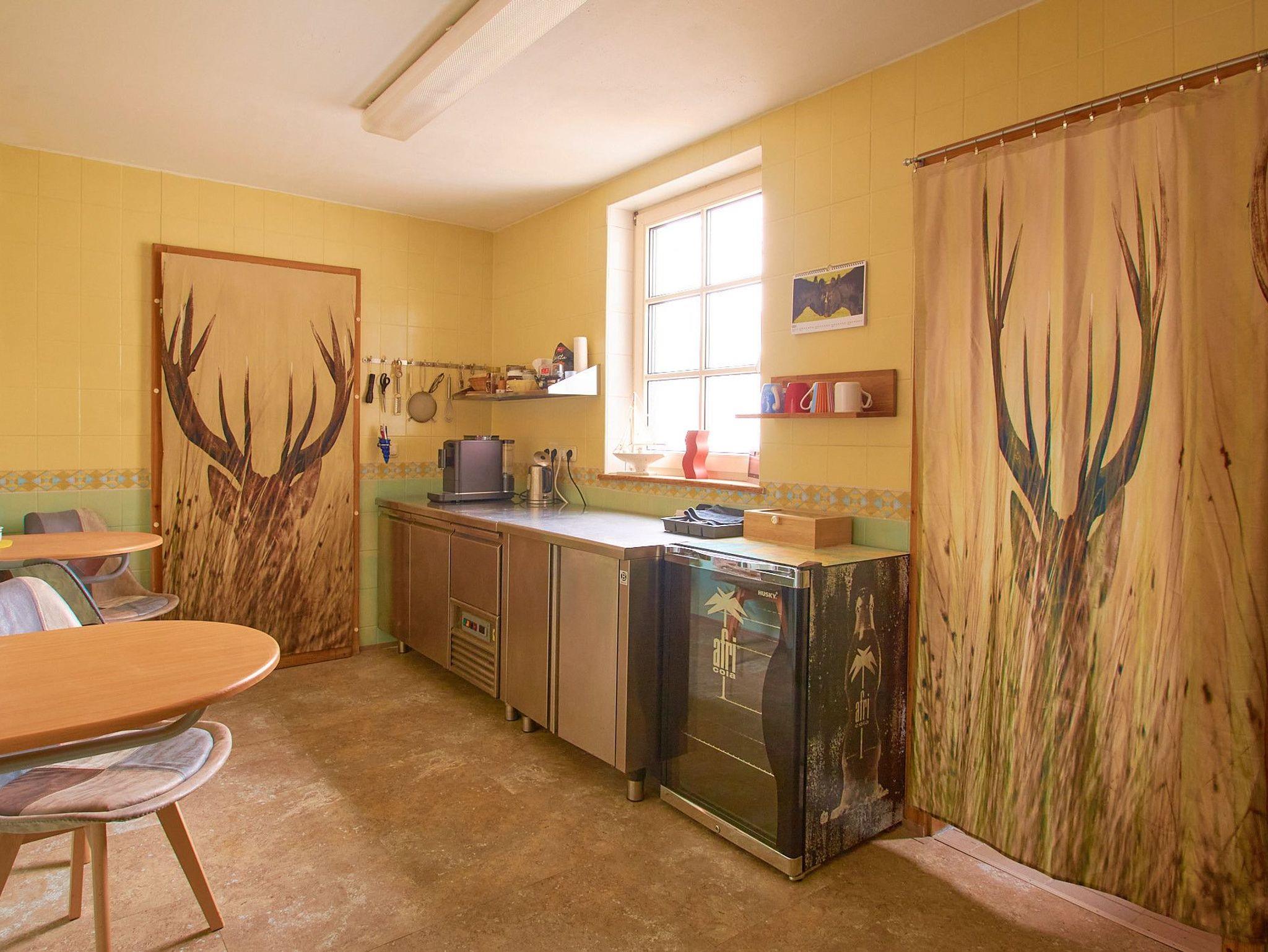 In der Teeküche (6 Sitzgelegenheiten), ausgestattet mit Kühlschrank, Wasserkocher, Kaffeemaschine, Geschirr,Besteck etc. können sie sich Ihr Frühstück zubereiten. Kaffee und Tee werden kostenfrei zur Verfügung gestellt. Der Raum ist ganztägig geöffnet ( Reinigung zwischen 12.30 und 14.00 Uhr).