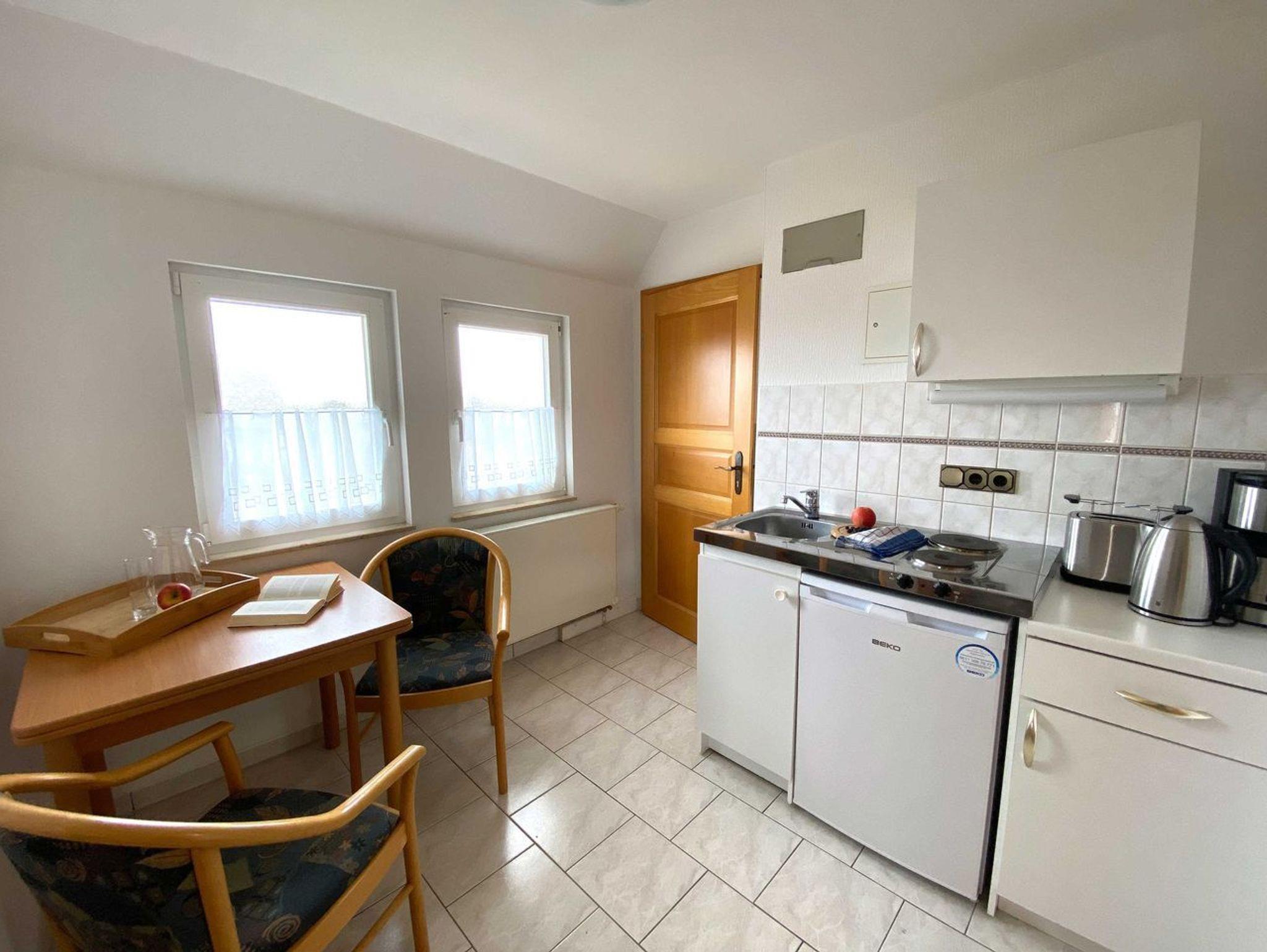 Das 1-Raum-Appartement im 1. Obergeschoss mit seinen 25 Quadratmetern ist ideal für Singles und Paare.[nbsp] Der kombinierte Wohn-, Ess- und Kochbereich lädt zu einem gemütlichen Frühstück zu zweit ein an dem vorhandenen Esstisch. Der kleine Kochbereich ist hierfür bestens ausgestattet (Kühlschrank und 2 Platten, Wasserkocher, Toaster, Kaffeemaschine, Gläser, Besteck, Kochutensilien).[nbsp] Das Schlafzimmer ist mit einen bequemen Doppelbett, Flat TV und einer kleinen Sitzgelegenheit ausgestattet. Im Badzimmer ist eine Dusche, ein WC und ein Haarföhn vorhanden.