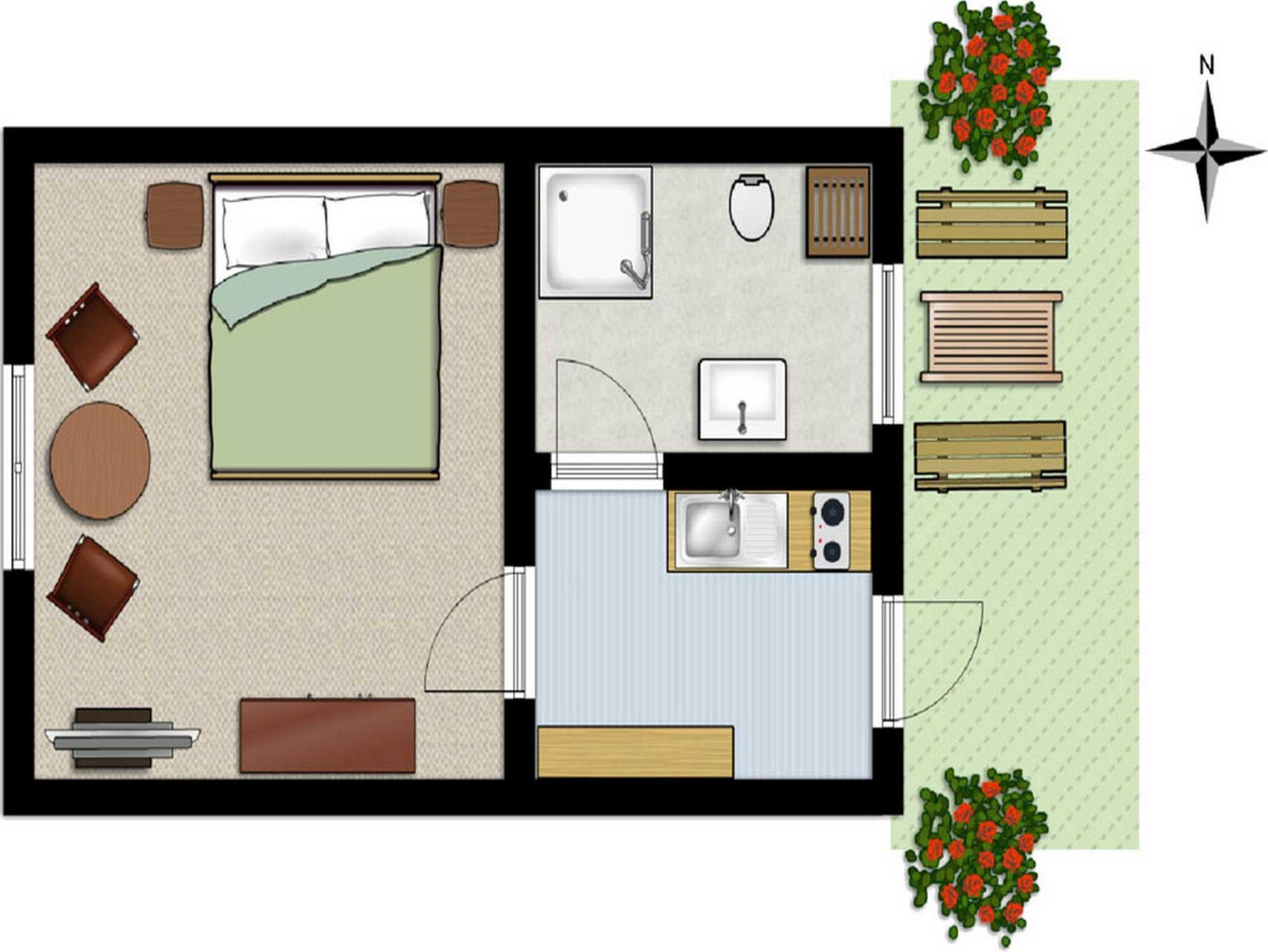 Über einen separaten Hauseingang erreichen Sie unser 25 Quadratmeter großes Appartement für 2 Personen mit Küche sowie Bad mit Dusche und WC.