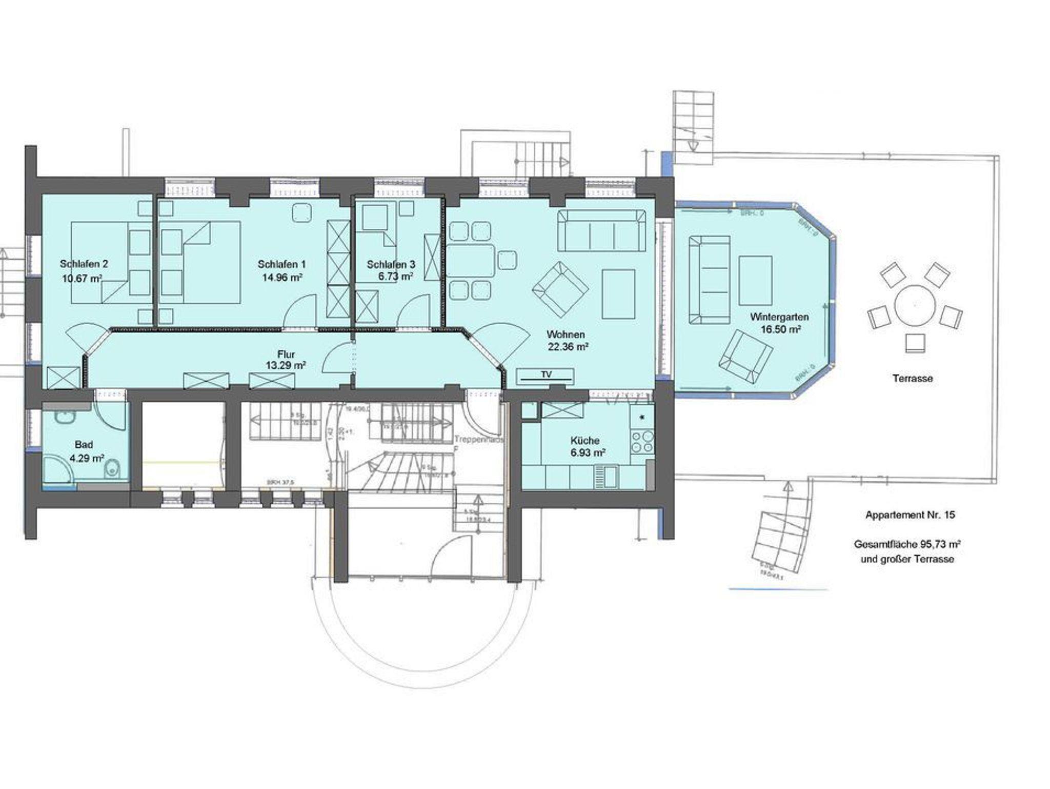 Das großzügige 4-Raum-Appartement befindet sich im Hochparterre des Süderhauses und bietet mit seinen 70 Quadratmetern ausreichend Platz für bis zu 5 Personen.[nbsp] Der kombinierte Wohn- und Essbereich ist mit einem gemütlichen Sofa, einem Flat-TV und einem Esstisch für 5 Personen ausgestattet. Vom angrenzenden Wintergarten und der Terrasse im Grünen können Sie in den Abendstunden einen unvergesslichen Sonnenuntergang bei einem schönen Glas Wein genießen.[nbsp] Die separate Küche lässt keine Wünsche offen und ist mit einem Kühlschrank mit Gefrierfach, Backofen mit Kochfeld mit 2 Platten,[nbsp] Wasserkocher, Toaster, Kaffeemaschine, Gläser, Besteck, sowie Kochutensilien ausgestattet.[nbsp] Das erste und das zweite Schlafzimmer verfügen jeweils über ein bequemes Doppelbett. Im dritten Schlafzimmer befindet sich eine Couch mit Auszieh- und Schlaffunktion.[nbsp] Im Badezimmer sind Dusche, WC und Haartrockner für Sie vorhanden.
