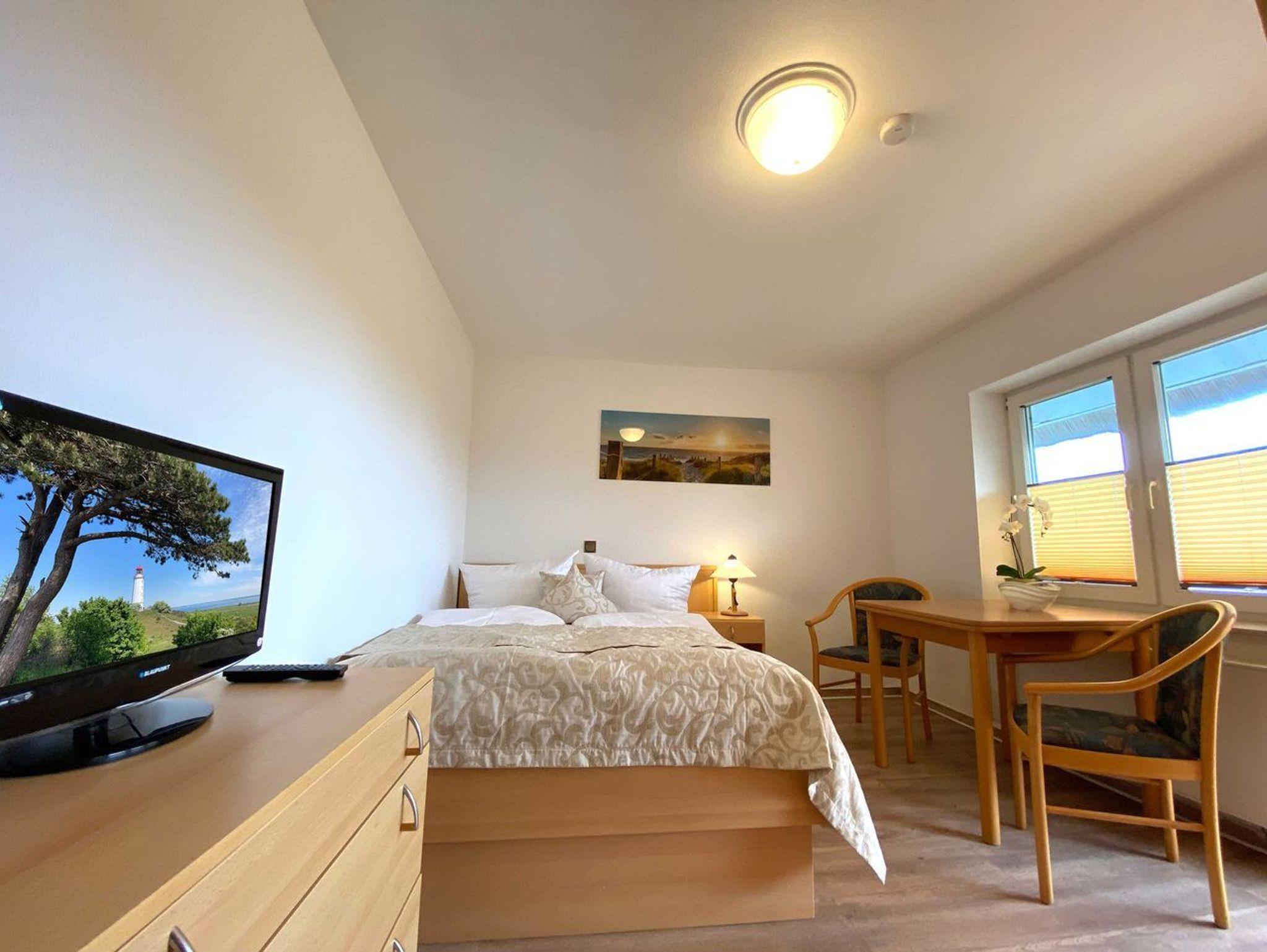 Der helle und freundliche Wohn-, Ess-, Koch und Schlafbereich ist ausgestattet mit einem Flat TV, einem Esstisch für zwei Personen, einer kleinen Pantryküche (Kühlschrank und 2 Platten, Wasserkocher, Toaster, Kaffeemaschine, Gläser, Besteck, Kochutensilien). Das bequeme Doppelbett lädt zu einer erholsamen Nachtruhe ein. Gönnen Sie sich auf der angrenzenden Terrasse eine schöne Tasse Kaffee und genießen Sie den weiten Blick über den Stralsunder Bodden. Das Badezimmer ist mit Dusche, WC und Haartrockner ausgestattet.