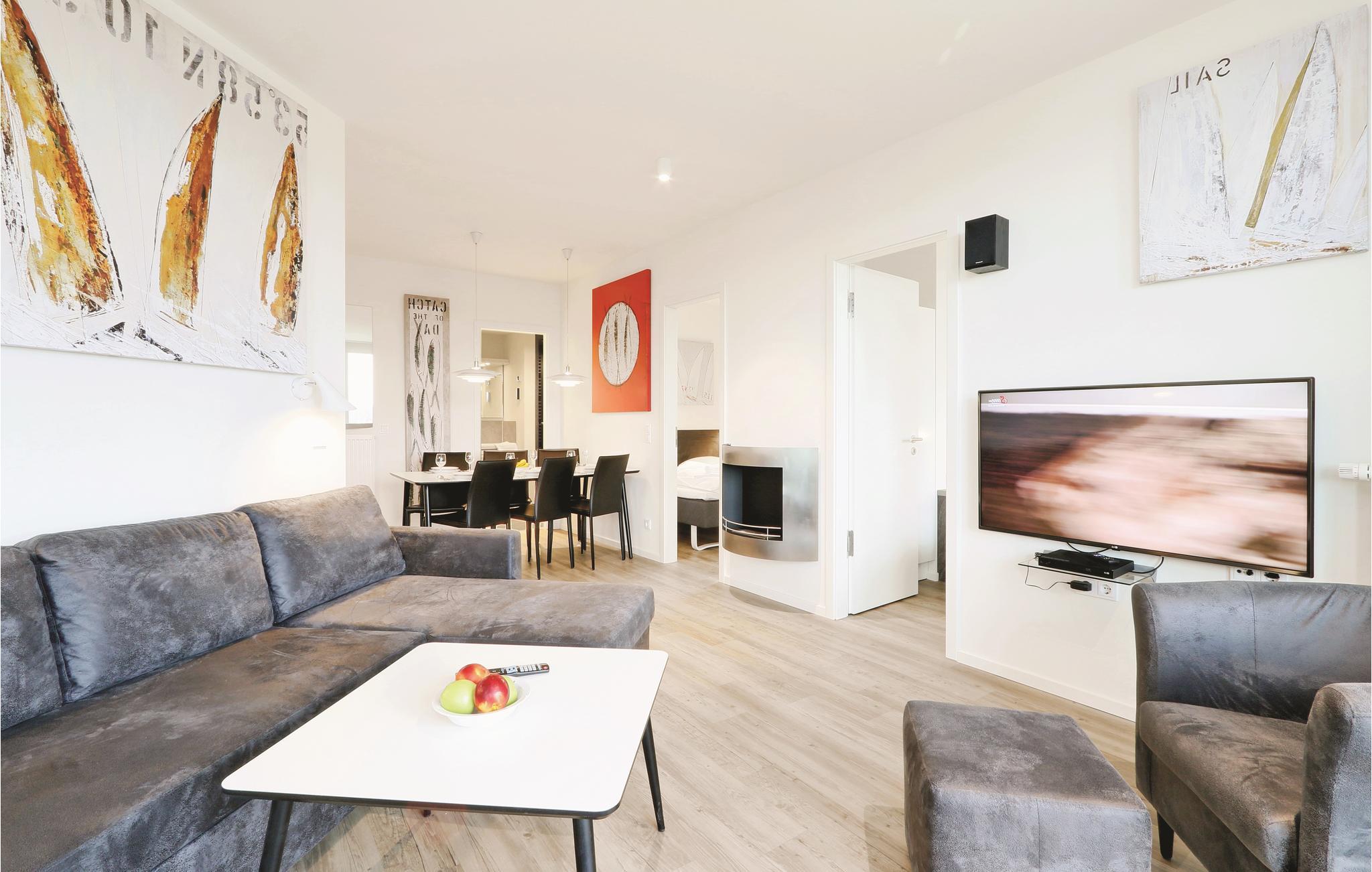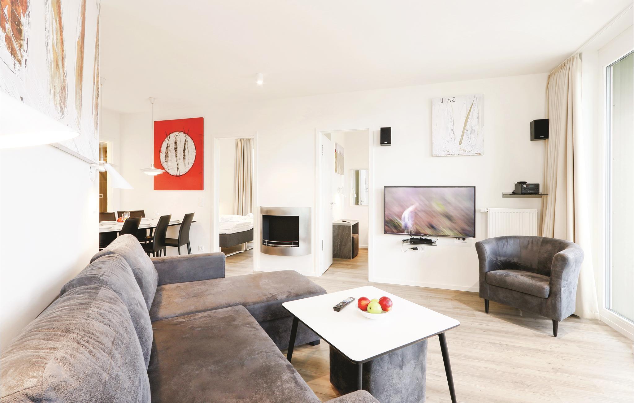 Jeres ferielejlighed ligger på 3. sal i anlægget, Jeres ferielejlighed ligger på tredje sal i anlægget med en fantastisk udsigt. Herfra kan I se over Travemünde, promenaden og den skønne sandstrand helt til Østersøen. Her er tre soveværelser, hver med en bekvem dobbeltseng. Det er kun muligt at stille barnesengen op i stuen, da der ikke er plads i soveværelset. I stuen kan I gøre jer det hyggeligt foran kaminen der opvarmes med bio-ætanol.