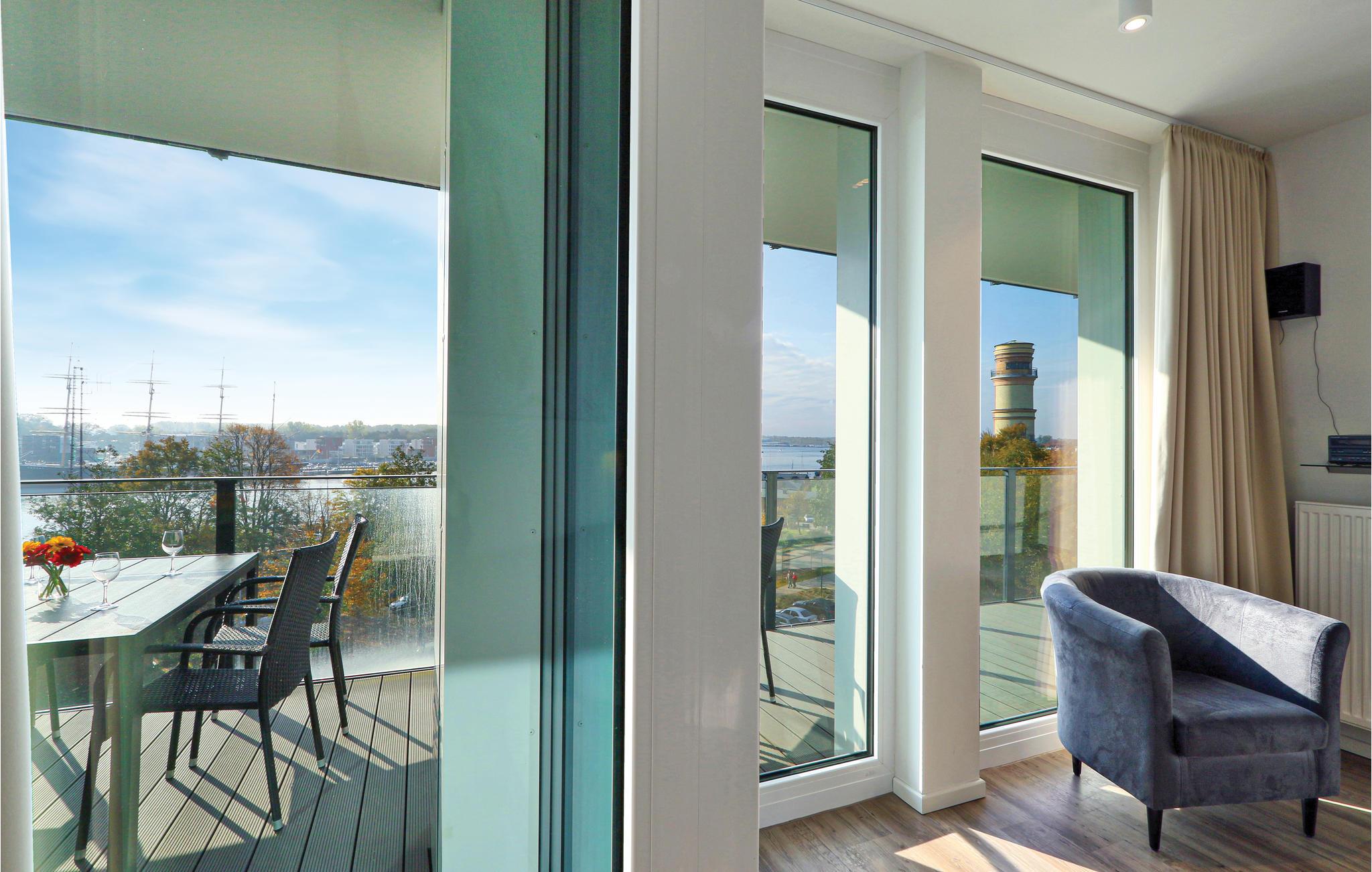 Jeres ferielejlighed ligger på 4. sal i anlægget, med en skøn udsigt. Herfra kan I nyde udsigten over Priwall, sandstranden Traves udløb og de mange skibe der sejler til og fra.