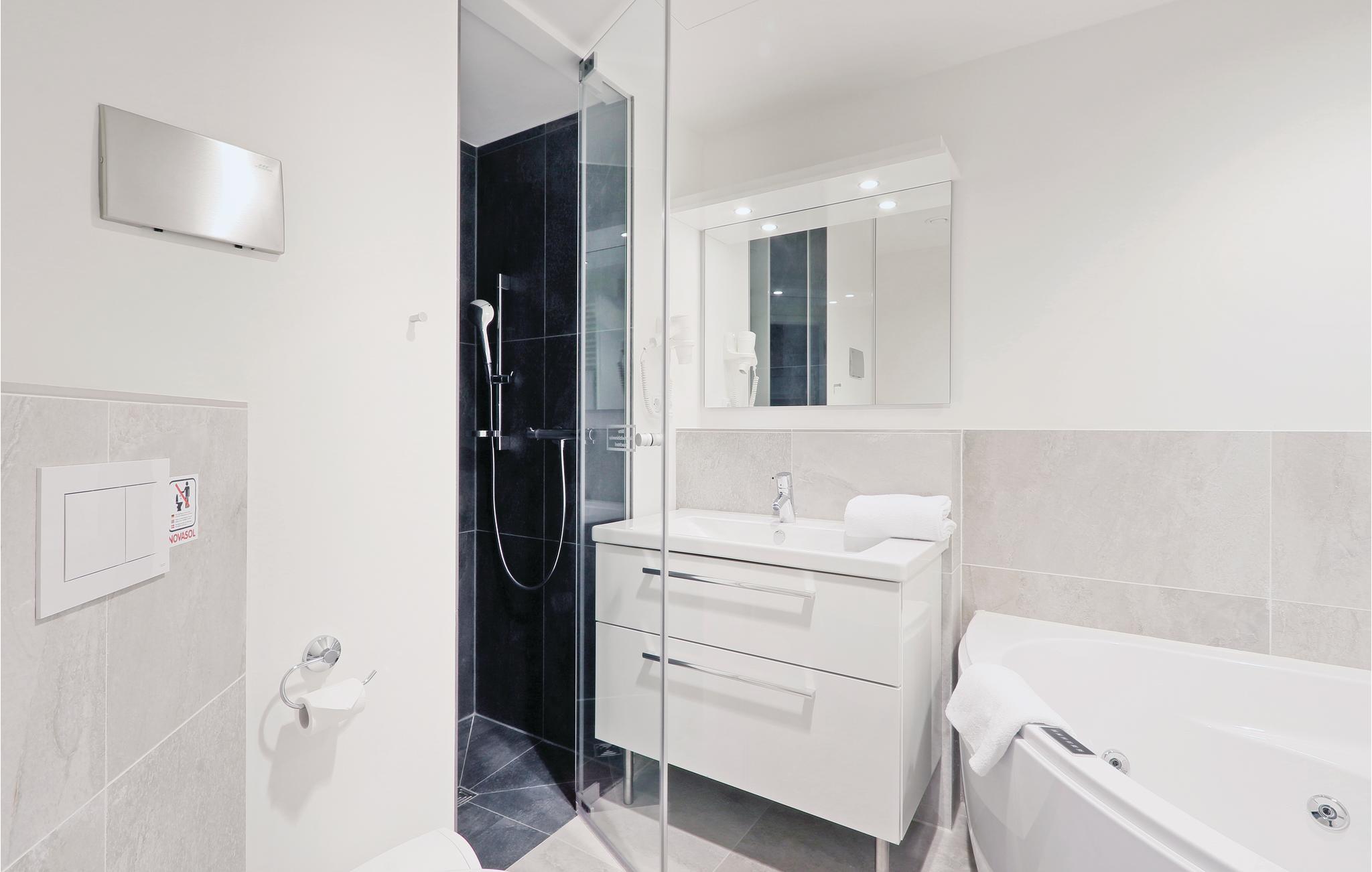 Badeværelserne er et privat wellness anlæg. Her kan I nyde at sidde i saunaen efter en lang tur langs vandet. Desuden er der et dampbad med regnvandsbruser og som toppen på kransekagen en dejlig whirlpool til to, hvor det er skønt at sidde og bare slappe af.