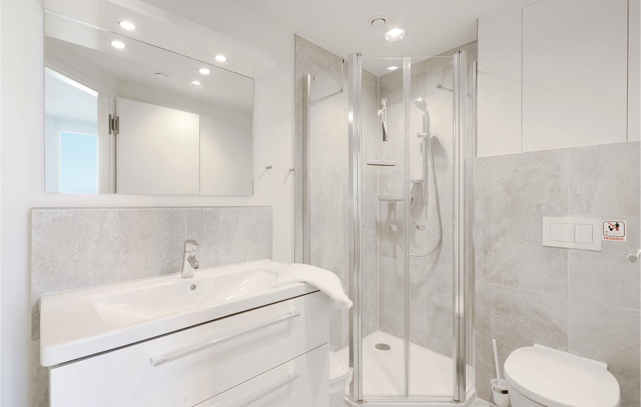 Badeværelset er et privat wellness anlæg. Her kan I nyde at sidde i saunaen efter en lang tur langs vandet. Desuden er der et dampbad med dobbelt regnvandsbruser. I det moderne åbne køkken er der god plads til at lave mad, ligesom det er forsynet med kvalitetsudstyr. F.eks. kan kaffeelskere se frem til Nespressomaskinen. Der er dog også termokande og filtertragt, hvis I foretrækker traditionel kaffe - husk selv kapsler eller kaffe.