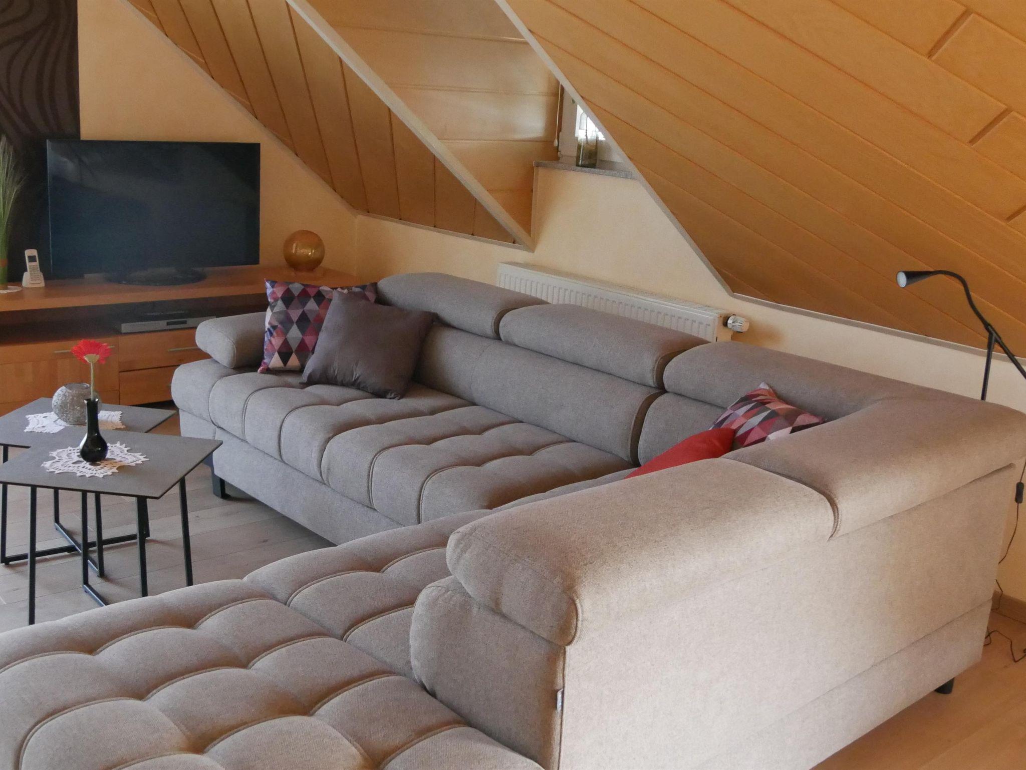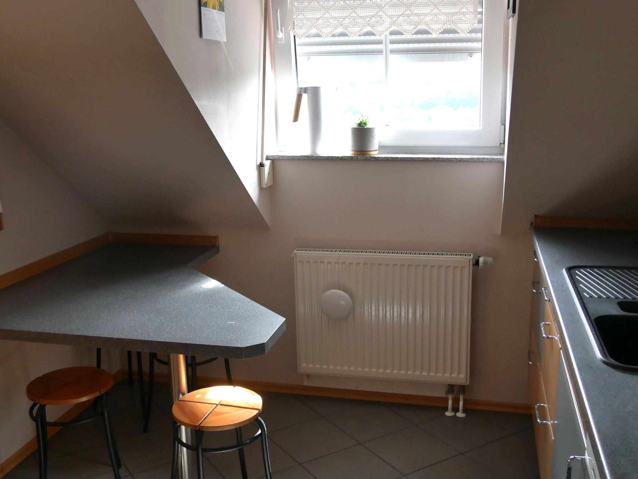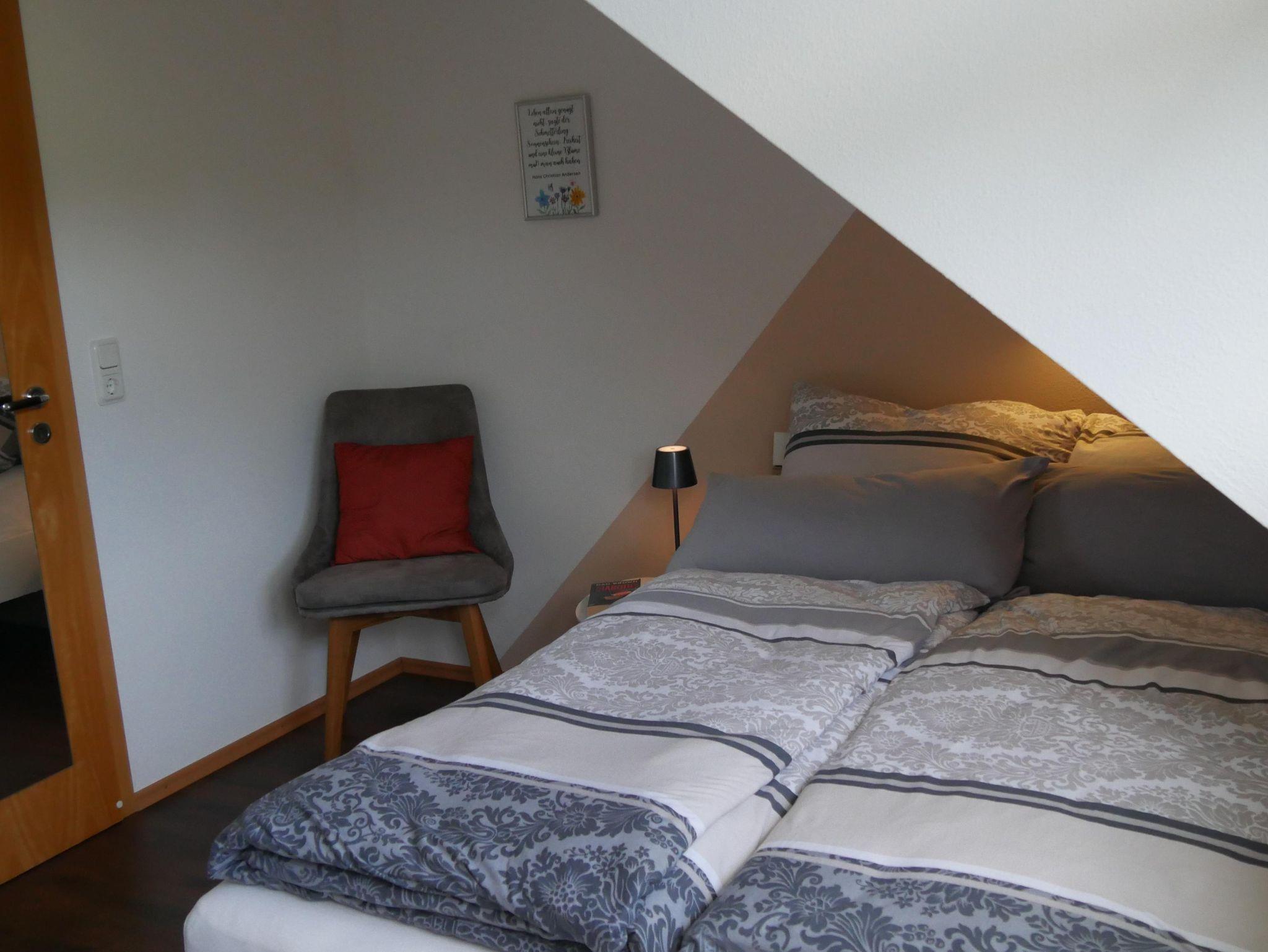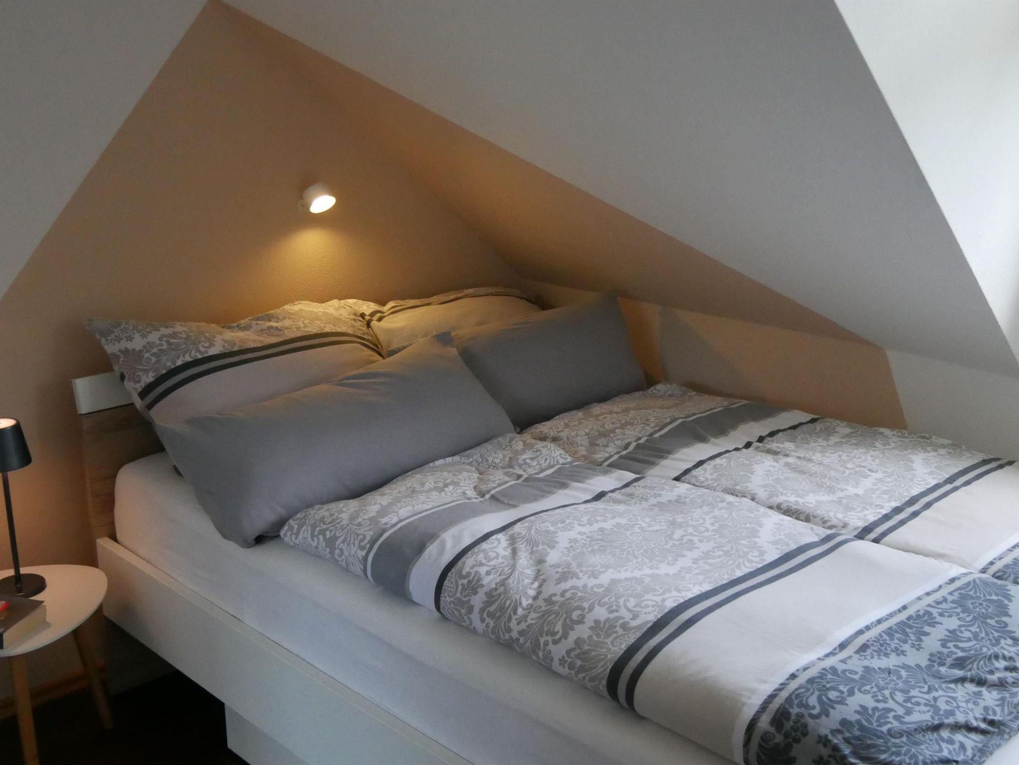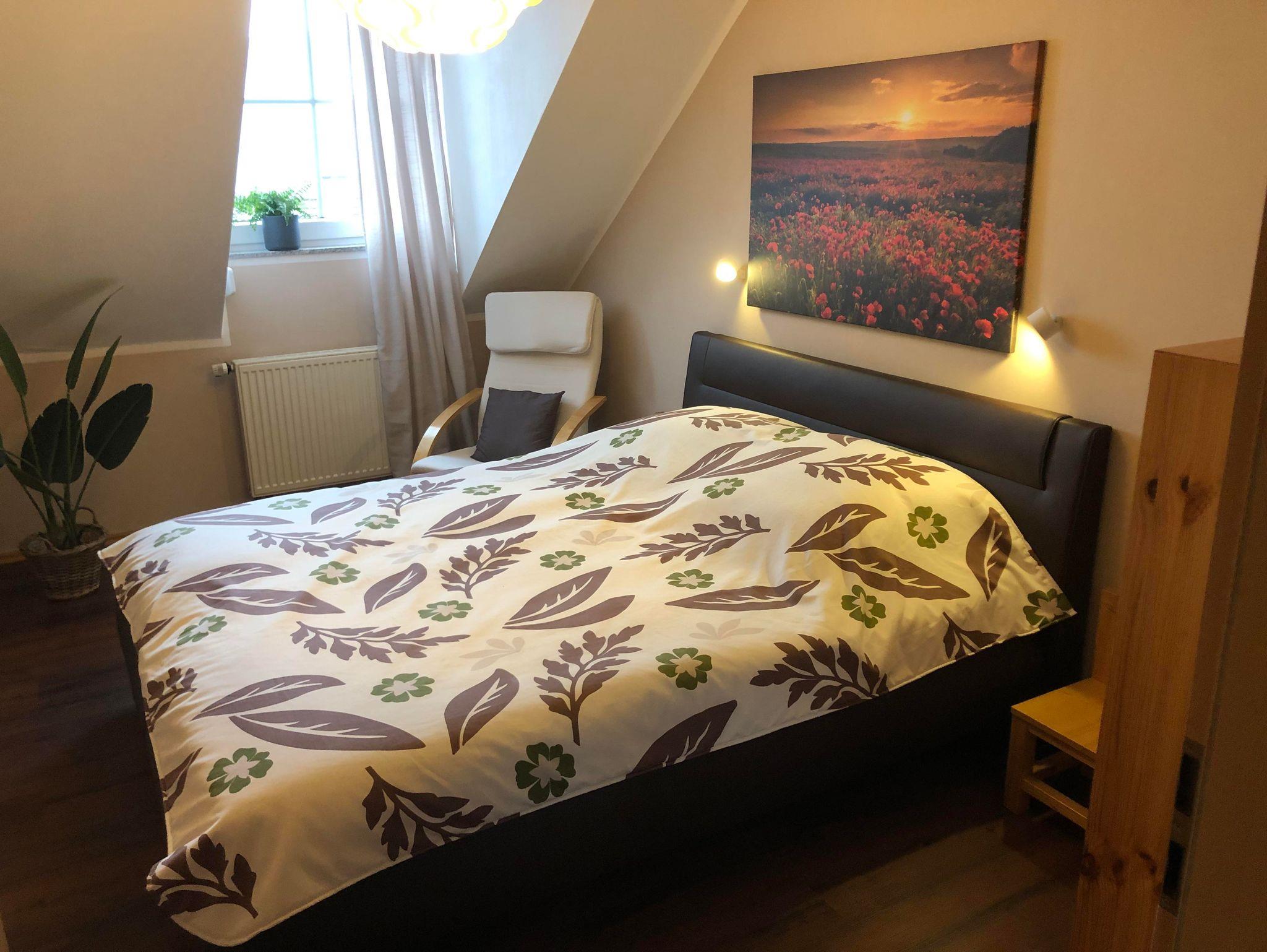 Die großzügige und helle Ferienwohnung (Nichtraucherwohnung) befindet sich im Dachgeschoss unseres Hauses und bietet auf etwa 80 Quadratmetern ausreichend Platz für bis zu vier Personen. Hier finden Sie alles, was das Herz begehrt, um einen erholsamen Urlaub zu genießen. Die Wohnung verfügt über zwei separate Schlafzimmer – eines mit einem Doppelbett (1,60 x 2 m), das andere mit einem französischen Bett (1,40 x 2 m). Das Badezimmer ist mit einer Dusche, WC und Waschbecken ausgestattet. Dort befindet sich ebenfalls eine Waschmaschine. Ein Wäschetrockner steht kostenfrei bereit. Die Küche lässt keine Wünsche offen und bietet neben einem Herd, einen Backofen, eine Mikrowelle, Kaffeemaschine und einen Wasserkocher. Zwei Balkone – einer in Südost-, der andere in Südwestausrichtung – laden dazu ein, die Sonne von morgens bis abends zu genießen und dabei den herrlichen Ausblick in die Weite zu erleben. Für Unterhaltung sorgen ein Flachbildfernseher, kostenloses WLAN, eine Auswahl an deutsch- und englischsprachiger Urlaubslektüre sowie verschiedene Gesellschaftsspiele. Der Garten mit mehreren Sitzgelegenheiten kann ebenfalls gerne mitbenutzt werden. Bei einer Belegung mit mindestens drei Personen steht auf Wunsch ein zusätzliches Badezimmer mit Dusche, Badewanne und WC gegen einen Aufpreis zur Verfügung. Für eine fünfte Person kann zudem die Couch als Schlafcouch genutzt werden – ebenfalls auf Anfrage und gegen Aufpreis.
