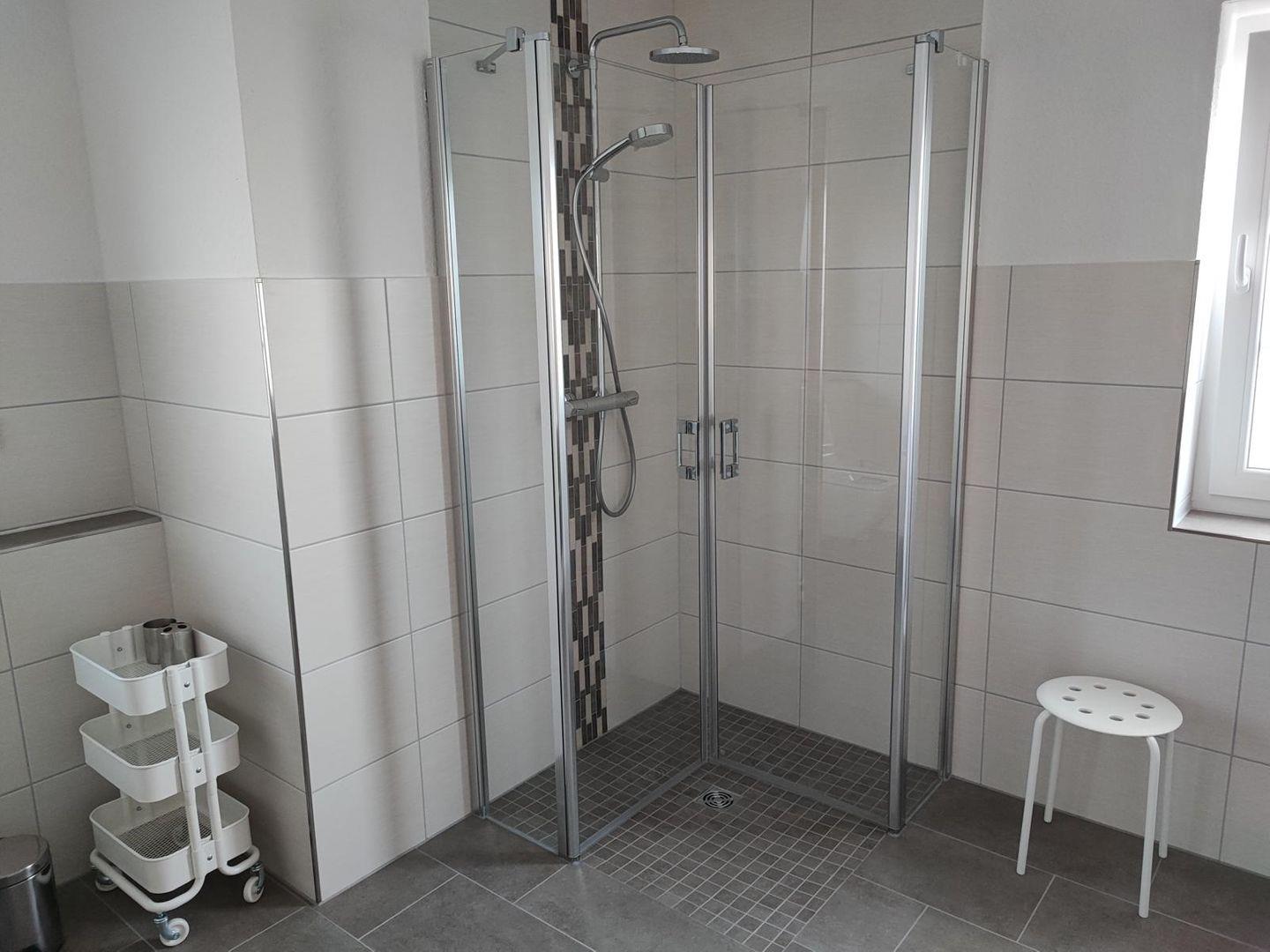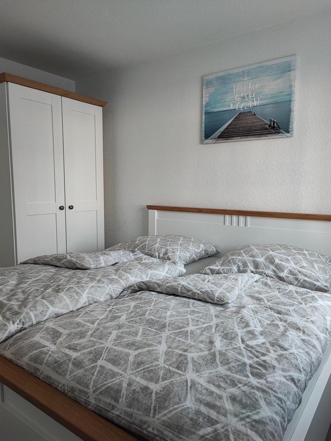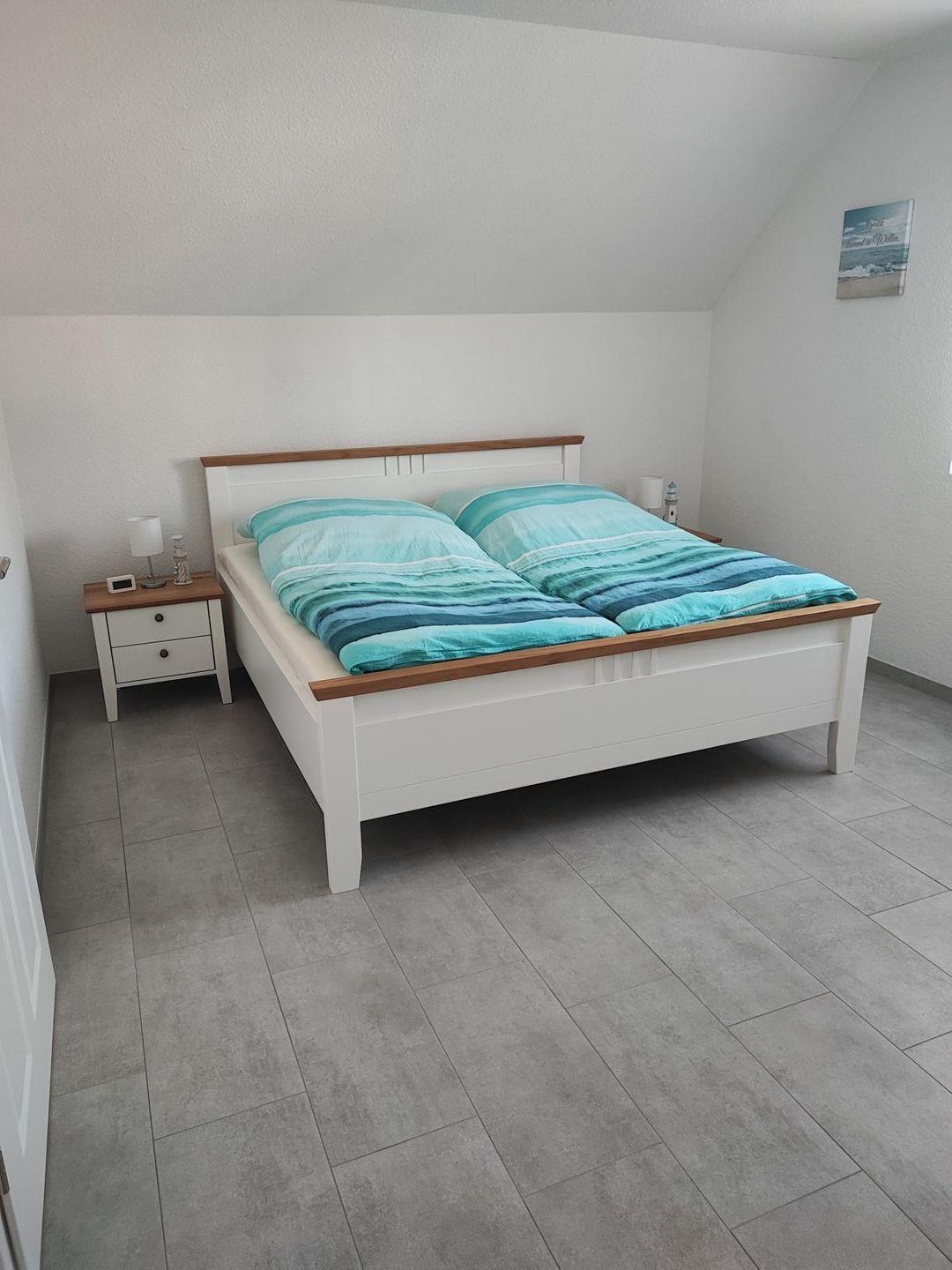 Ebenfalls im Erdgeschoss finden Sie ein großes Duschbad mit Waschmaschine, Trockner und ebenerdiger Dusche. Direkt angrenzend befindet sich das erste Schlafzimmer mit Doppelbett und Kleiderschrank.