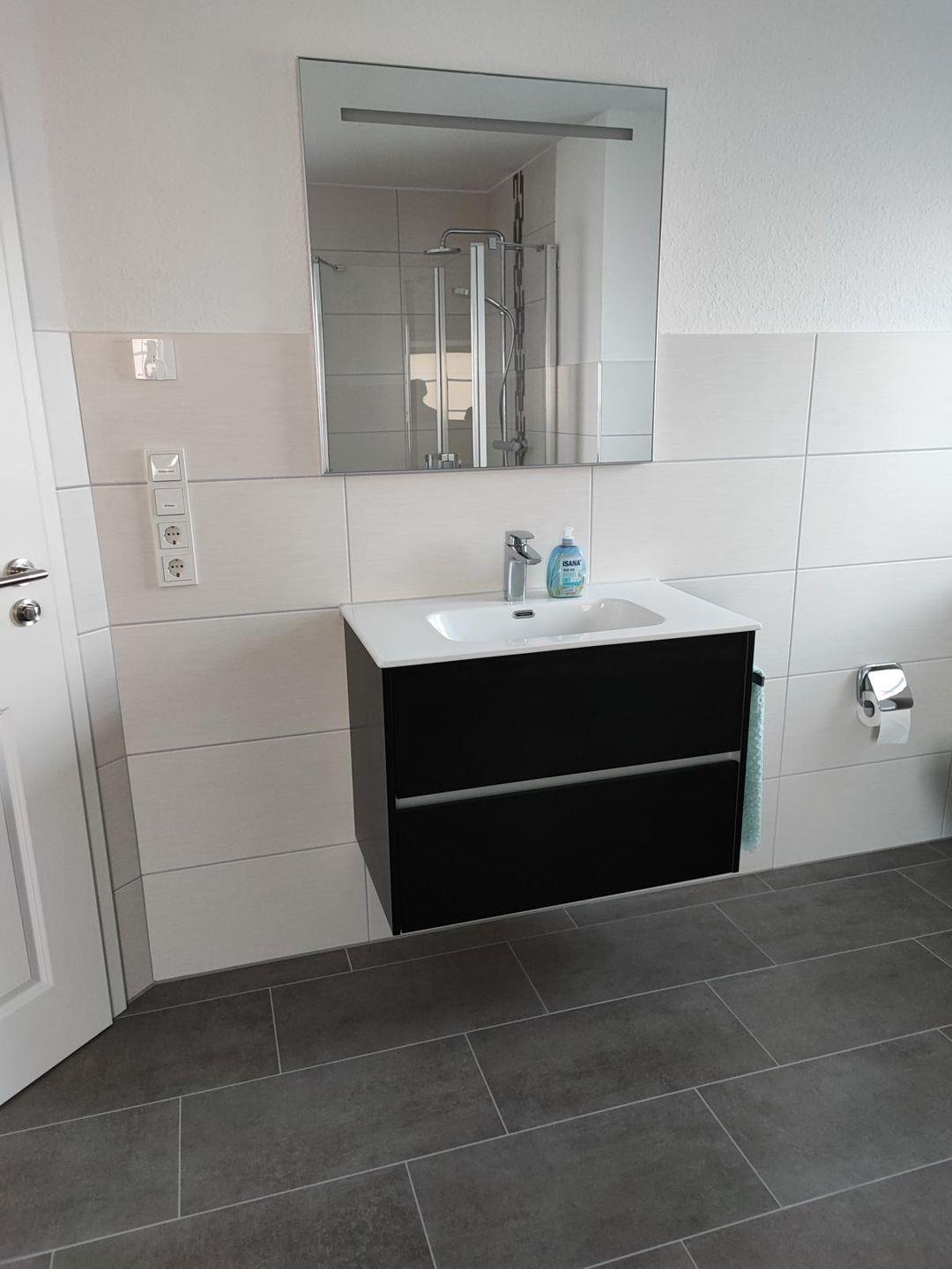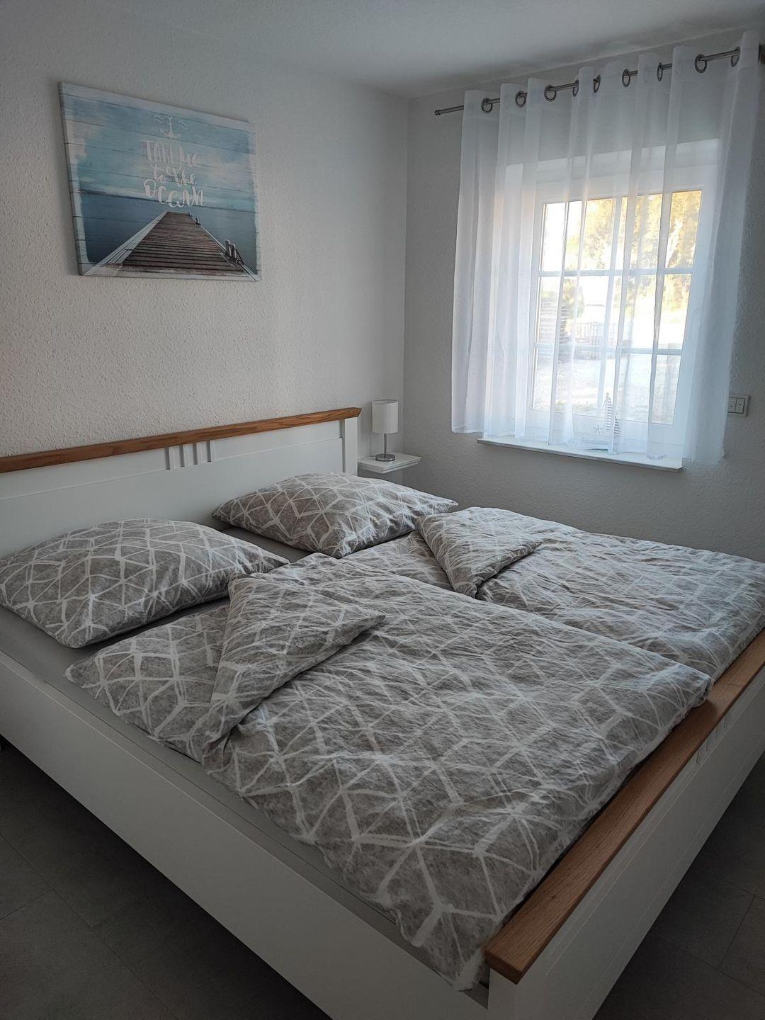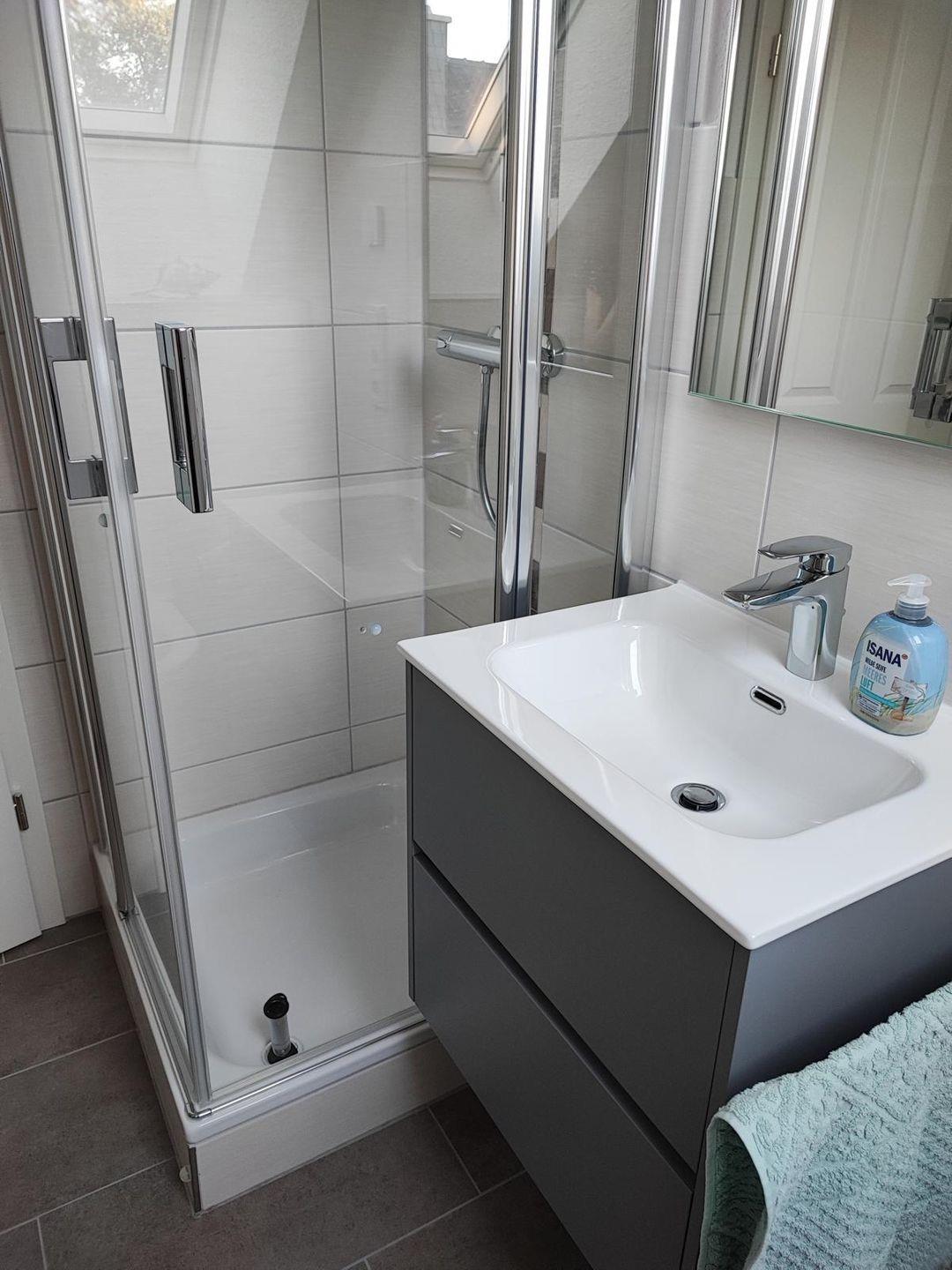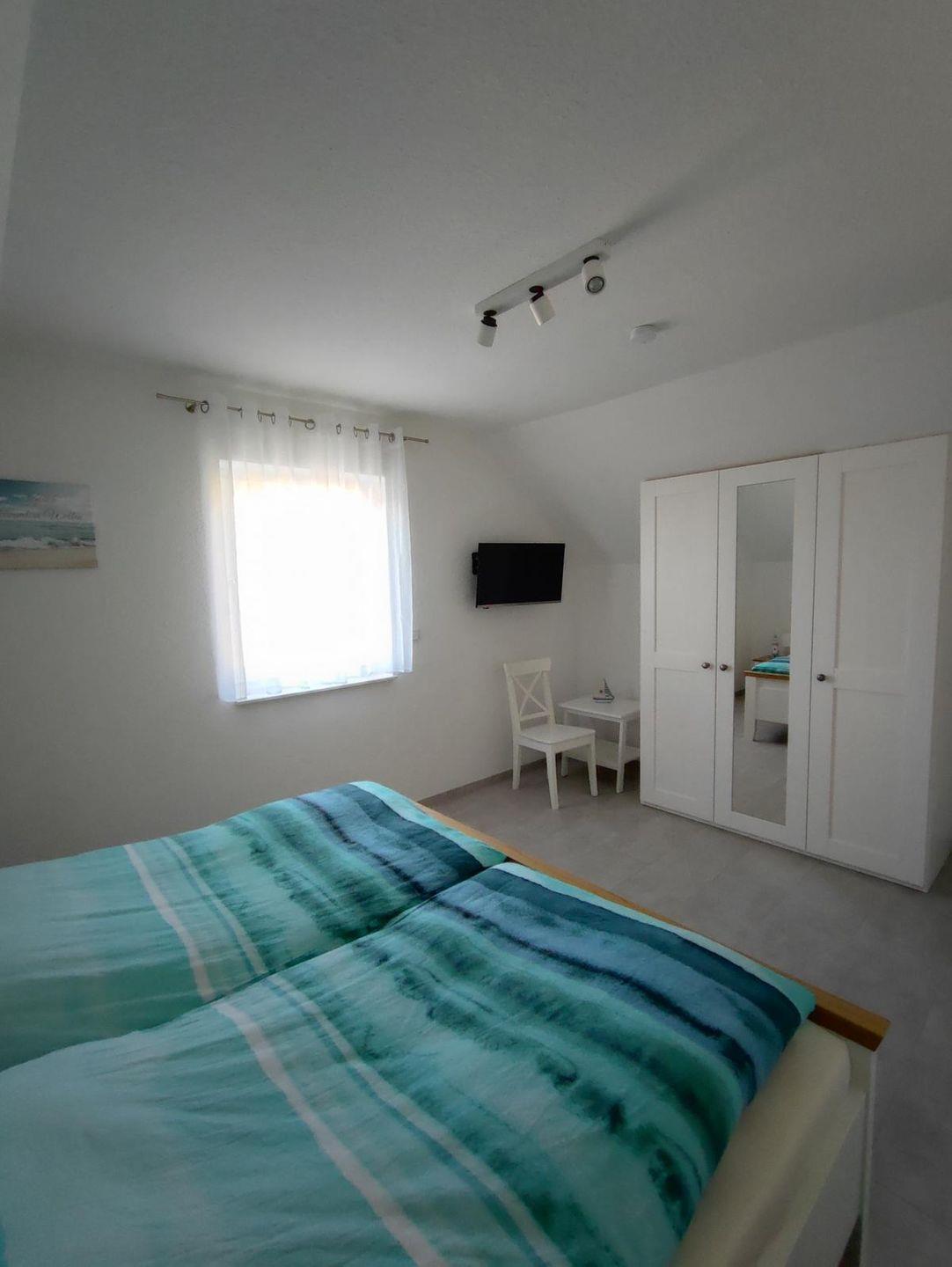 Ebenfalls im Erdgeschoss finden Sie ein großes Duschbad mit Waschmaschine, Trockner und ebenerdiger Dusche. Direkt angrenzend befindet sich das erste Schlafzimmer mit Doppelbett und Kleiderschrank.