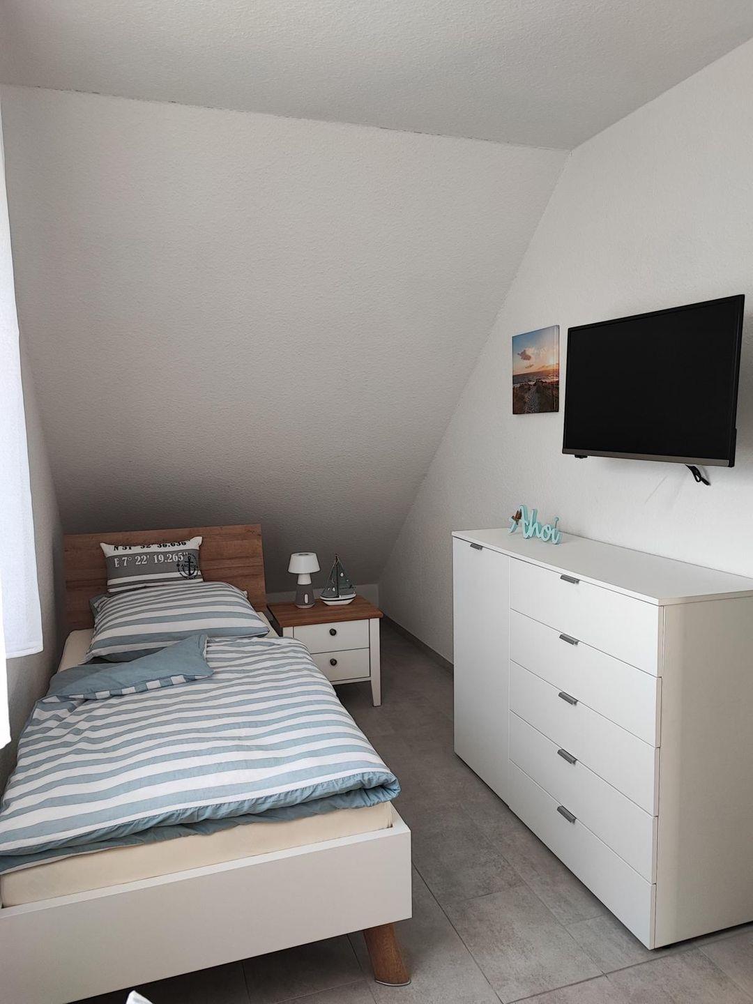 Im Obergeschoss finden Sie zwei weitere Schlafzimmer, jeweils mit Kleiderschrank und Fernseher: Ein Schlafzimmer bietet ein weiteres Doppelbett, in dem anderen Zimmer finden Sie zwei Einzelbetten. Auch im Obergeschoss befindet sich noch ein Badezimmer mit ebenerdiger Dusche.