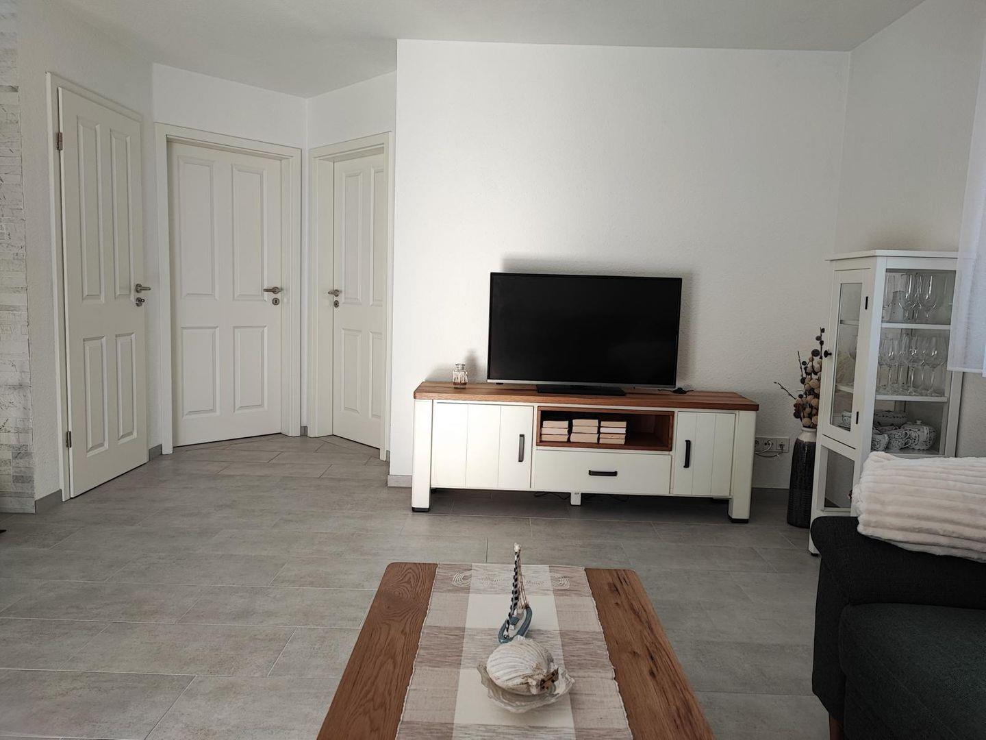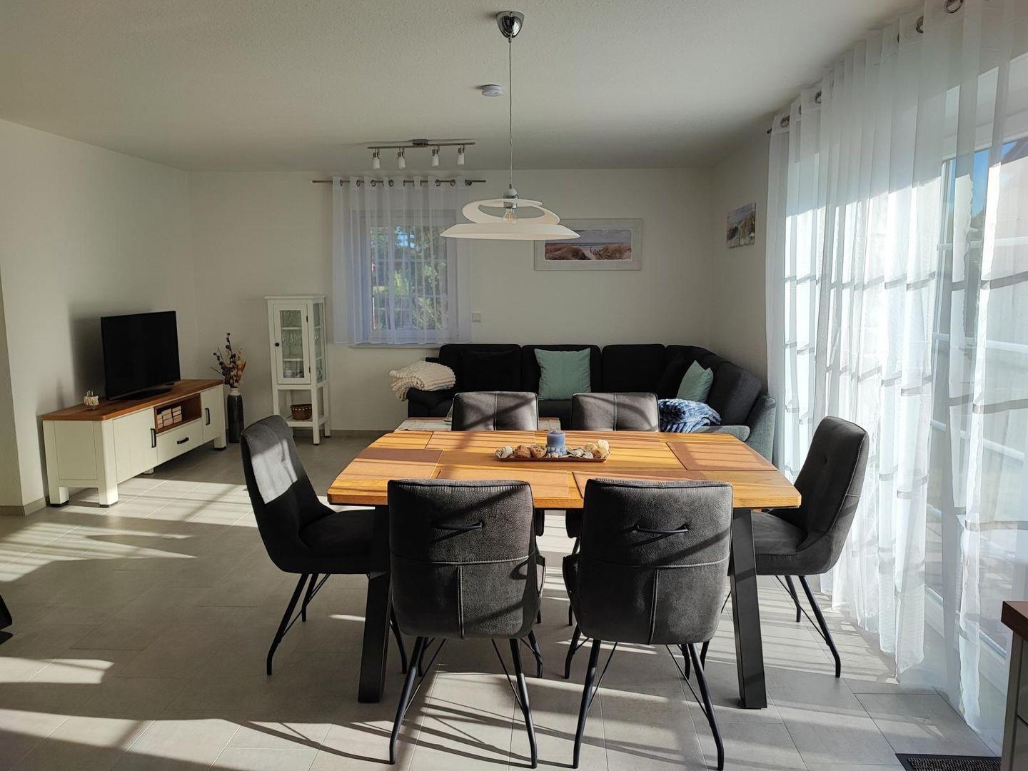 Dieses tolle Haus überzeugt auf 100qm mit vielen Annehmlichkeiten: Durch den Flur kommen Sie direkt in den offenen und hellen Wohnbereich mit Küche. In der Küche finden Sie alle notwendigen Geräte und Ausstattungsmerkmale für Ihren Urlaub: Kühlschrank mit Gefrierfach, Cerankochfeld, Backofen, Kaffeemaschine, Wasserkocher, Spülmaschine etc. Die Küche geht direkt über in den Wohn-/Essbereich mit Stühlen und Esstisch und einem großzügigen L-Sofa. Auch ein großer Flachbildfernseher sowie ein Kaminofen sind hier vorhanden. Von hier aus können Sie auch auf die möblierte Terrasse mit angrenzendem Garten hinaustreten, der auch eingezäunt ist.