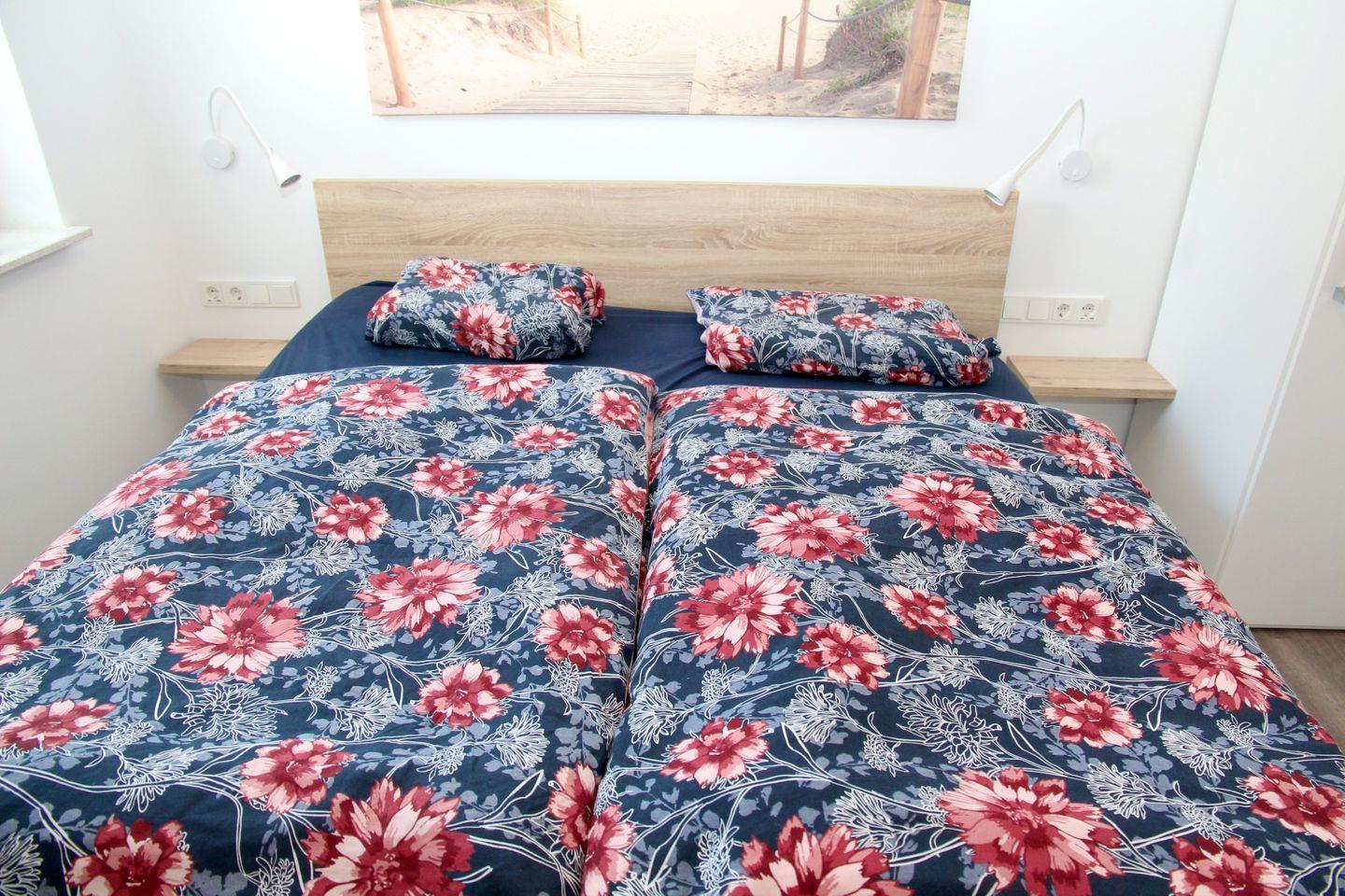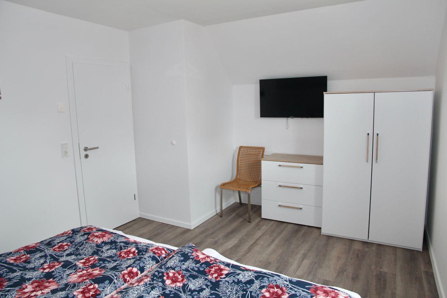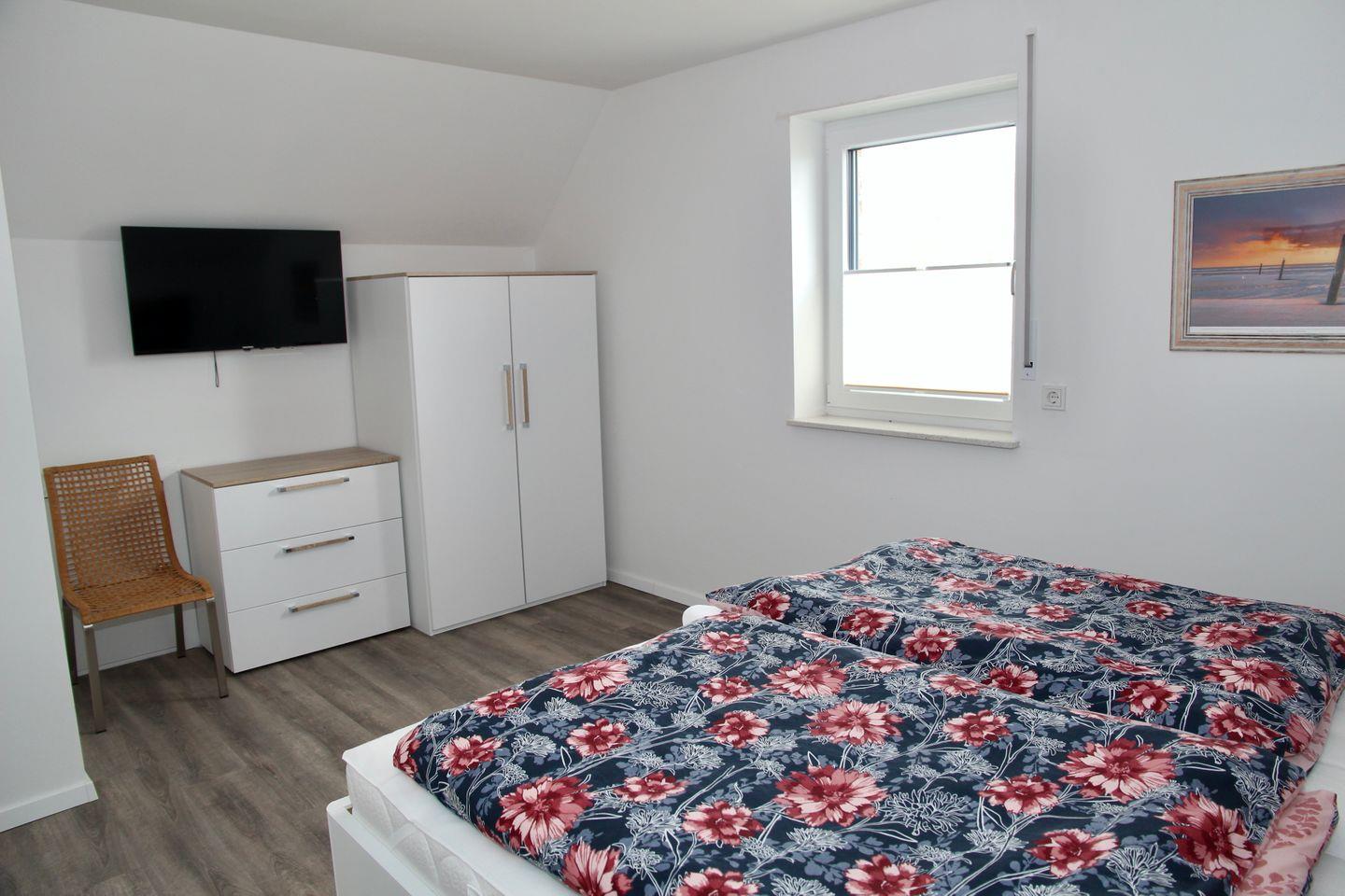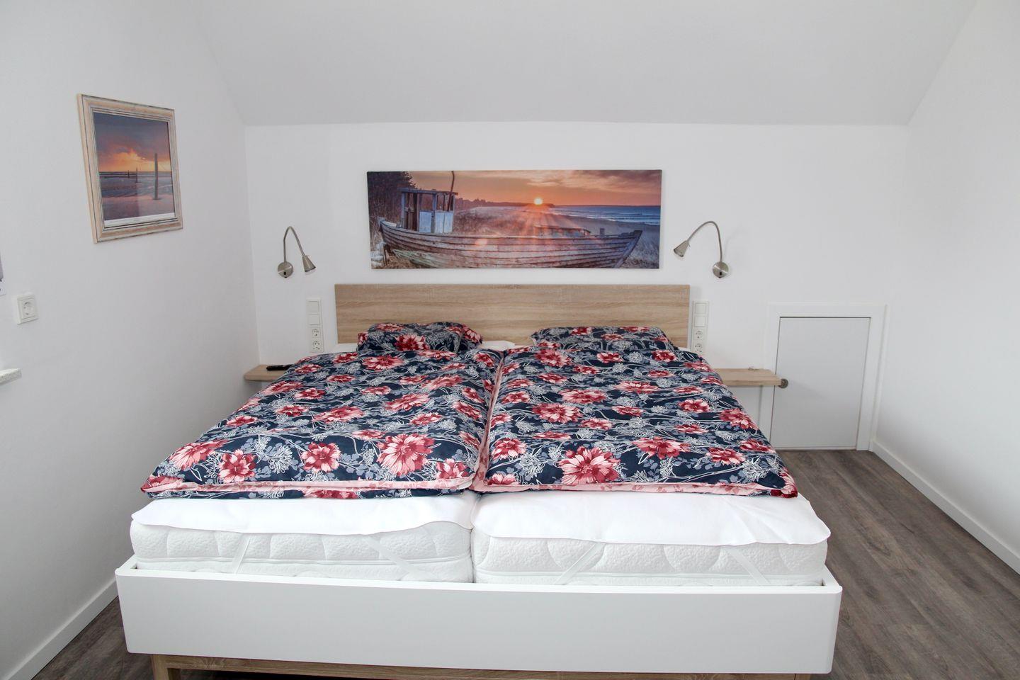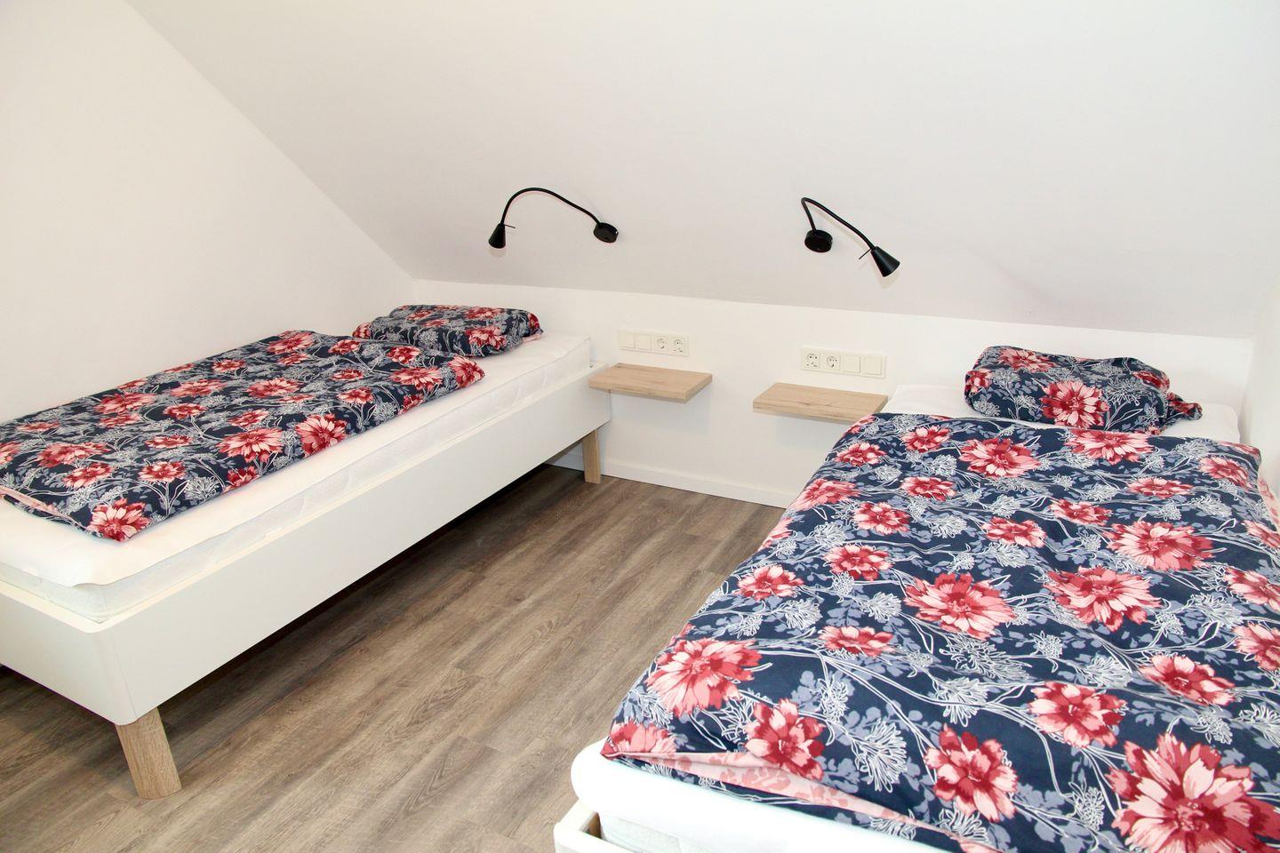 Im Obergeschoss befinden sich zwei weitere Schlafzimmer jeweils mit Kleiderschrank und Fernseher, eines mit Doppelbett, eines mit zwei Einzelbetten. Ebenfalls befindet sich hier ein weiteres Duschbad mit Handtuchheizkörper und Fön.