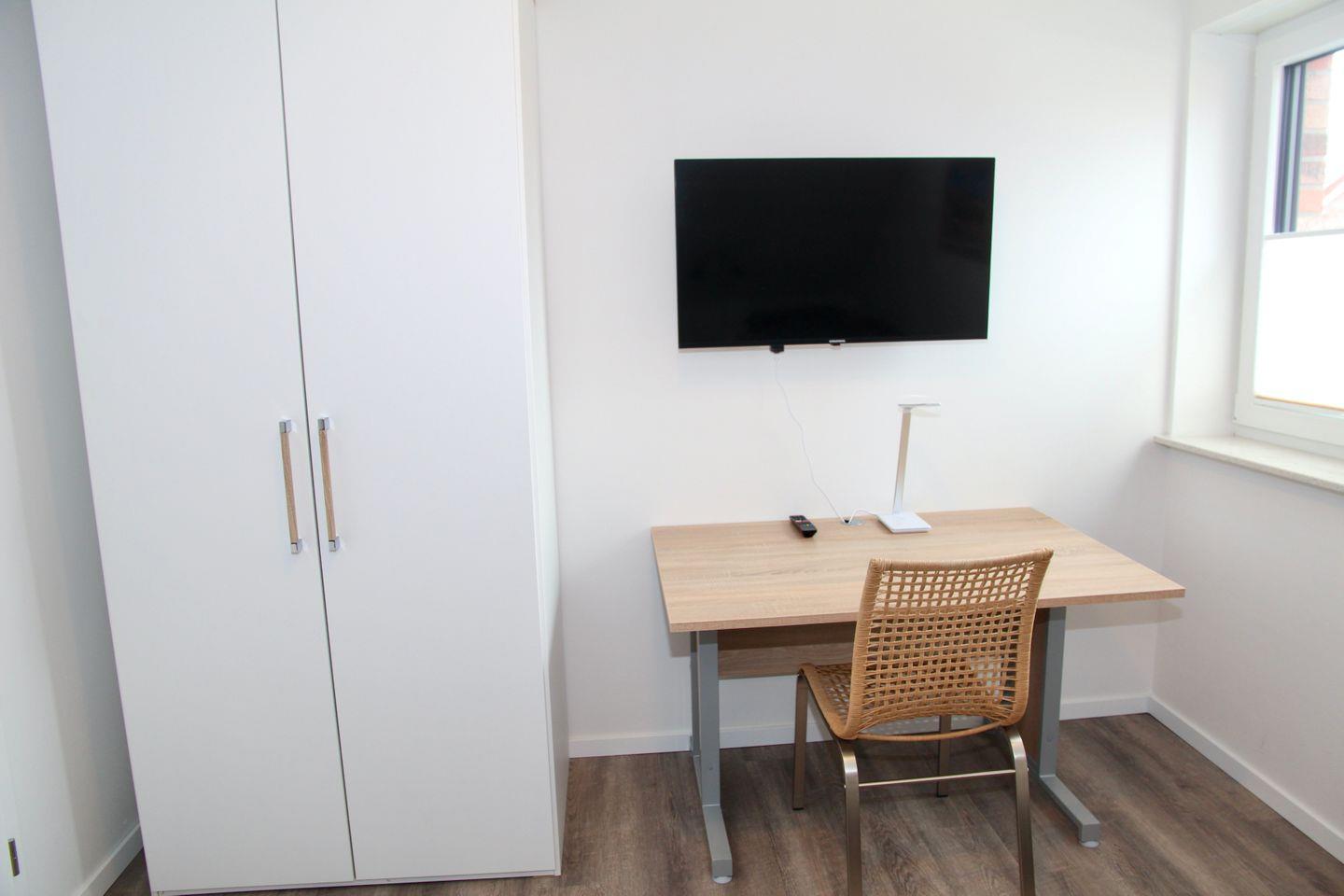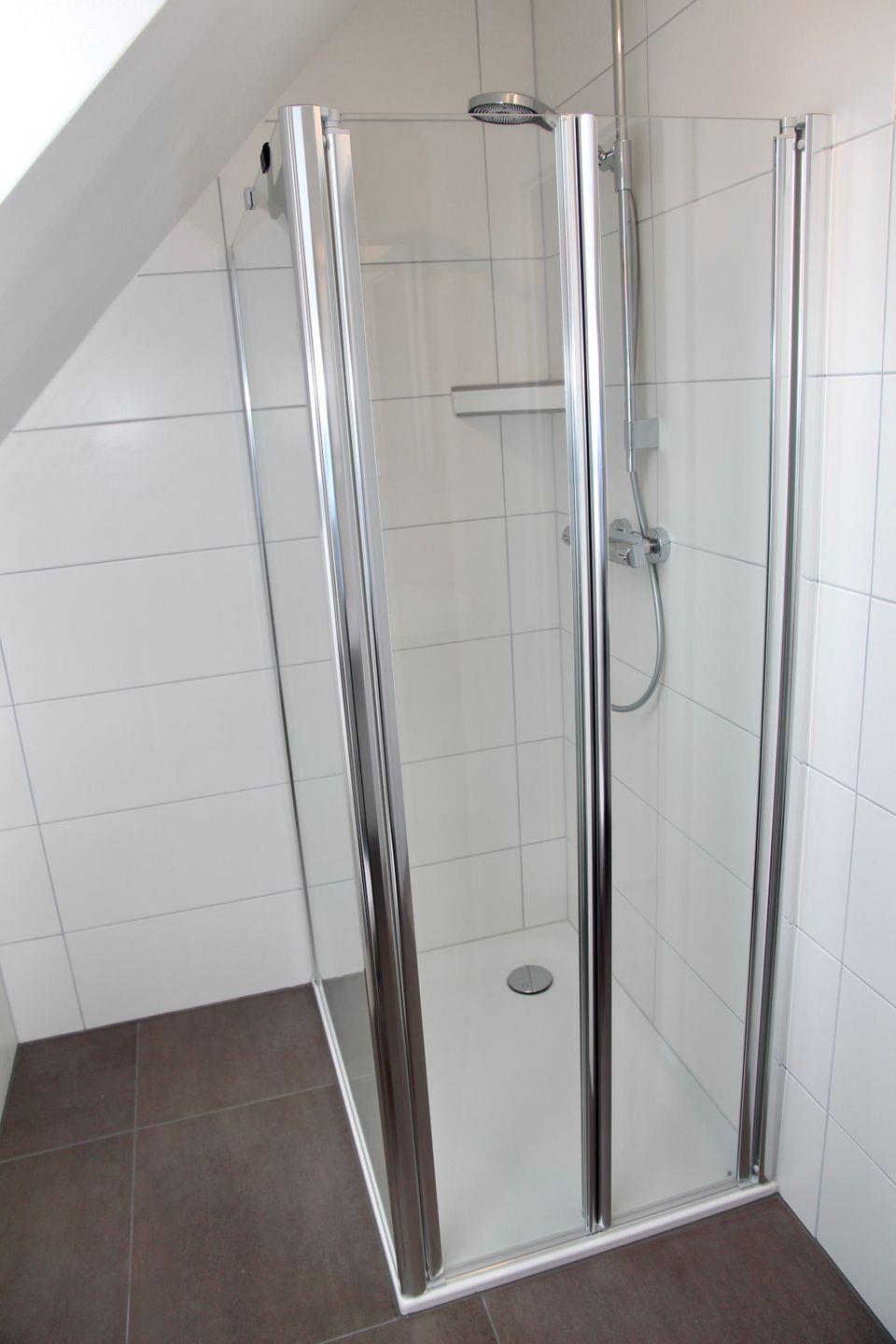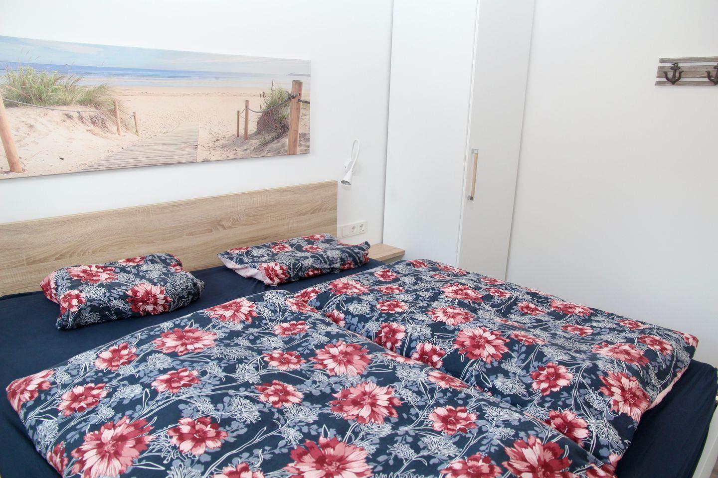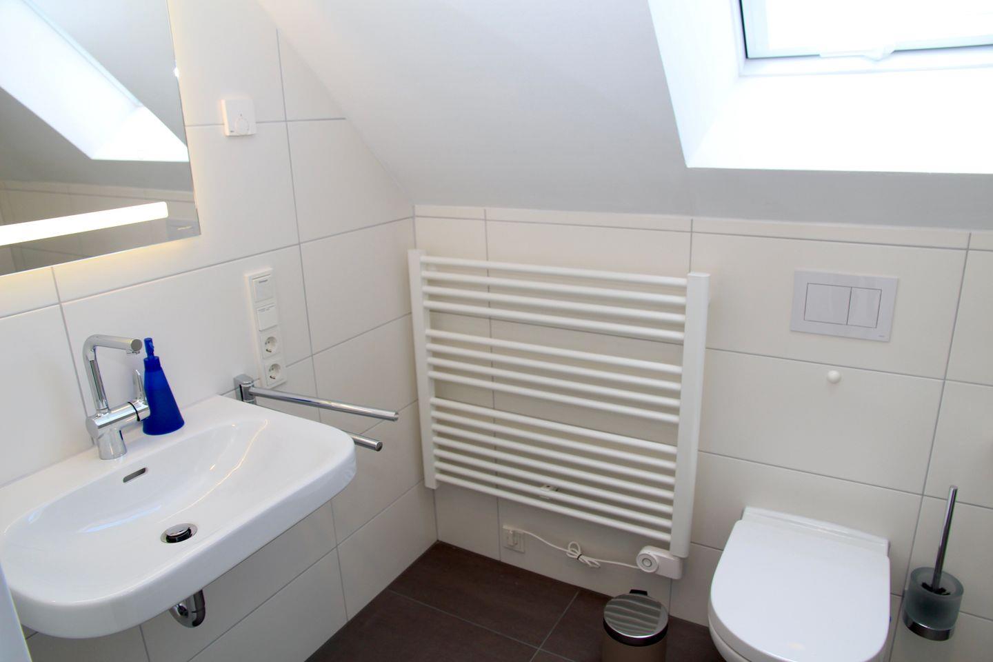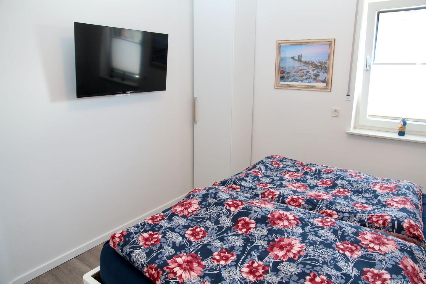 Im Obergeschoss befinden sich zwei weitere Schlafzimmer jeweils mit Kleiderschrank und Fernseher, eines mit Doppelbett, eines mit zwei Einzelbetten. Ebenfalls befindet sich hier ein weiteres Duschbad mit Handtuchheizkörper und Fön.
