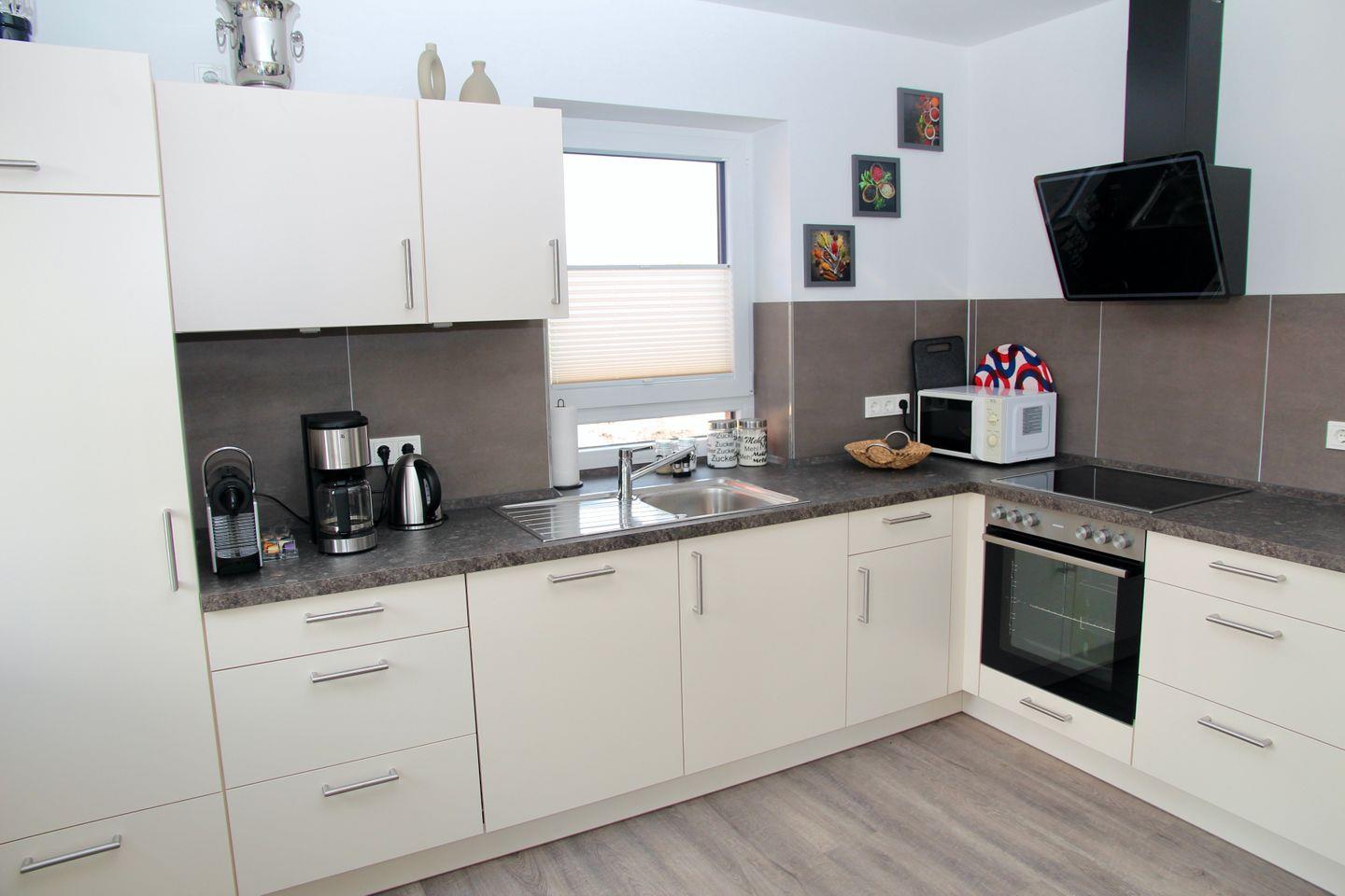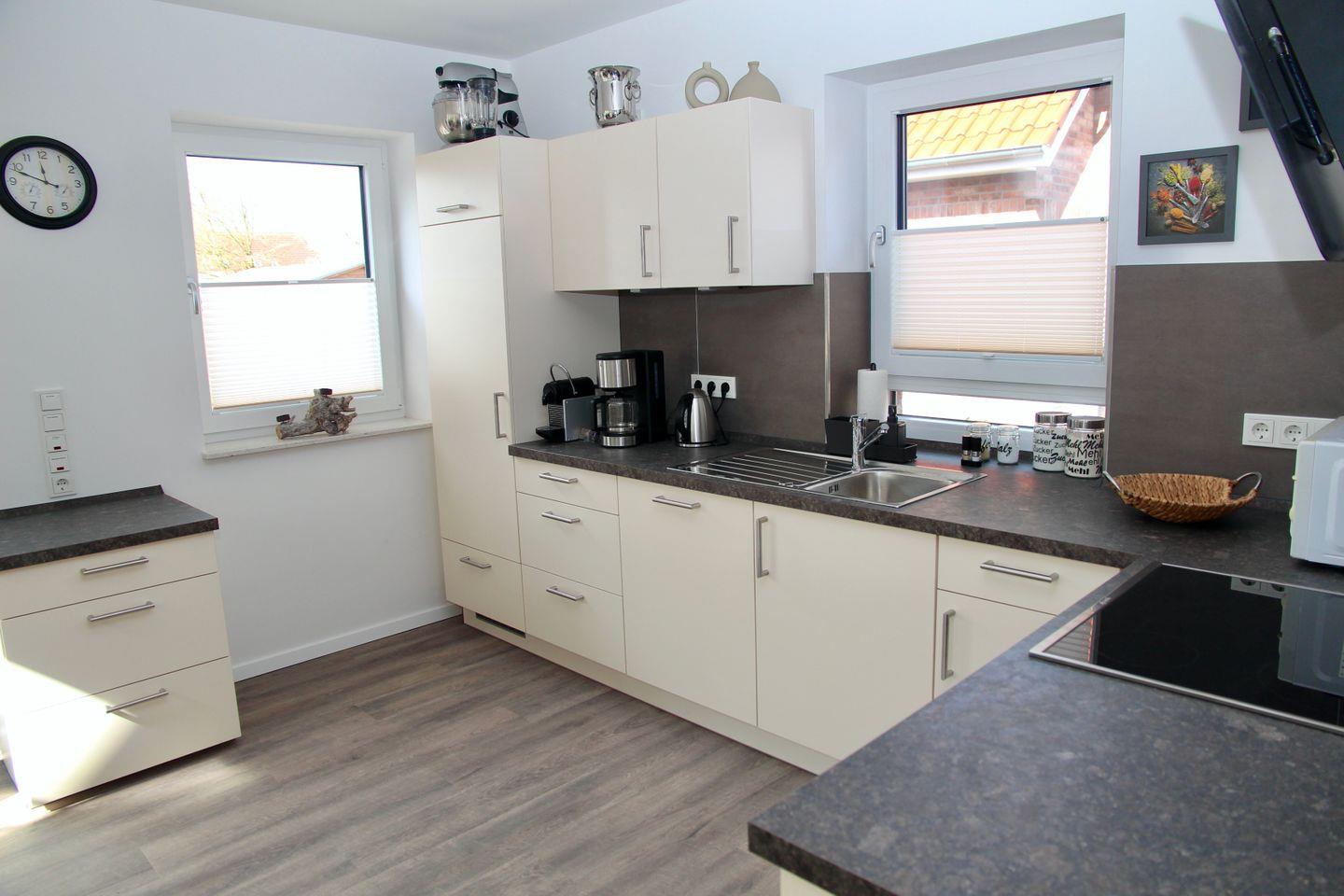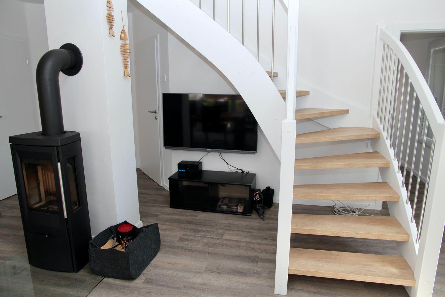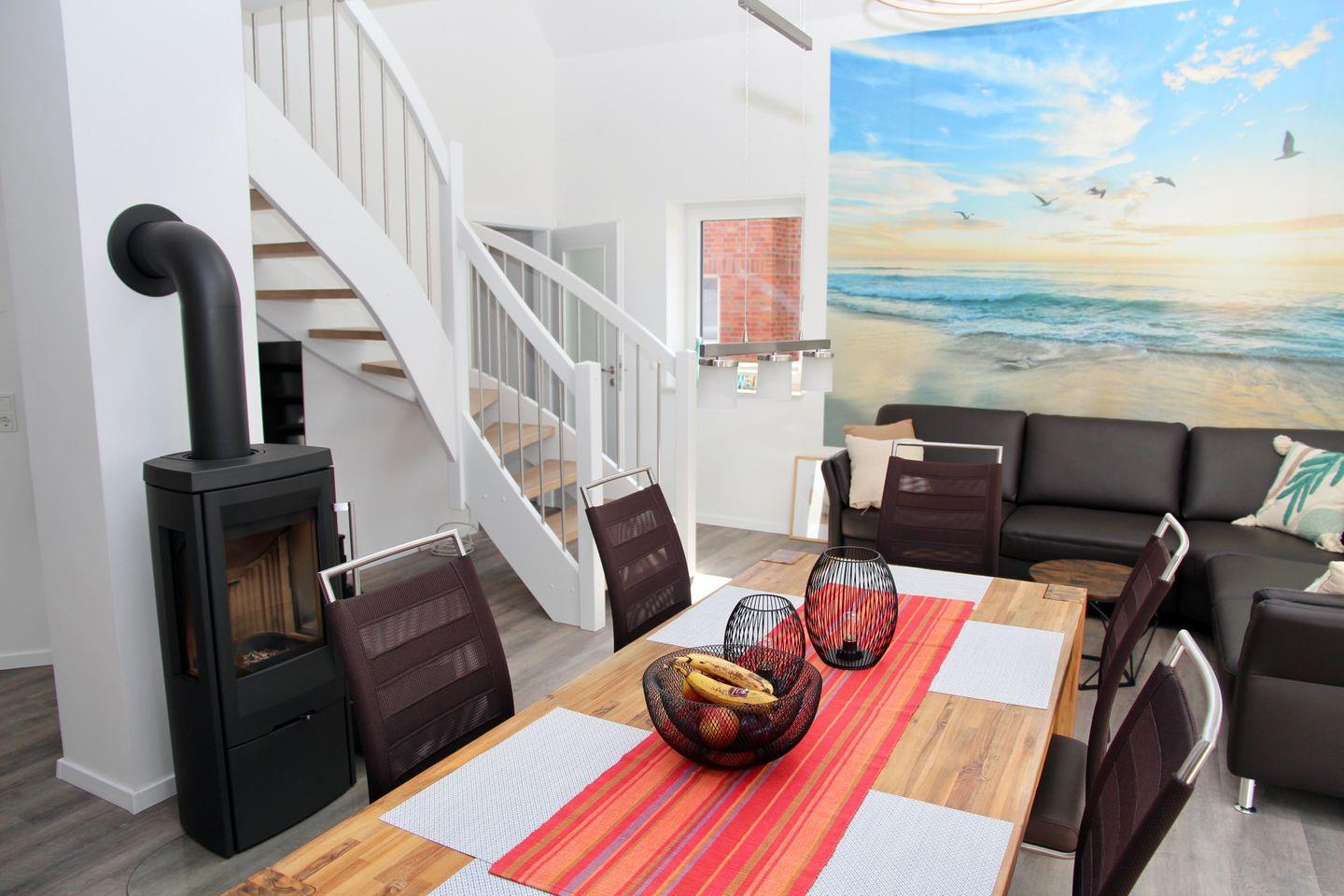 Das besondere Highlight dieses Hauses erleben Sie direkt beim Betreten des Hauses: Die offene Galerie mit hoher Decke und großem Dachfenster im Wohnbereich. Hier finden Sie ein gemütliches L-Sofa mit großem Fernseher und Kaminofen. Direkt angrenzend befindet sich der Essbereich mit Tisch und sechs Stühlen, sowie die vollständig ausgestattete Küche. Hier finden Sie u.a. Kühlschrank mit Gefrierfach, Spülmaschine, Backofen, Cerankochfeld, Toaster, Kaffeemaschine, Mikrowelle, Nespresso-Kapselmaschine, Wasserkocher und eine Küchenmaschine.