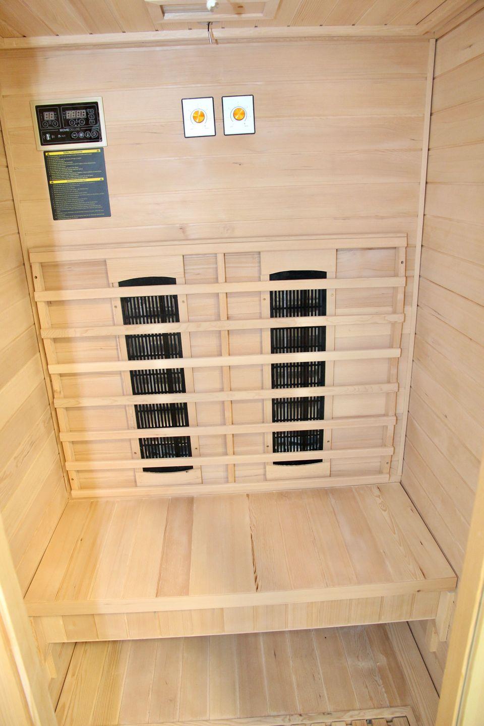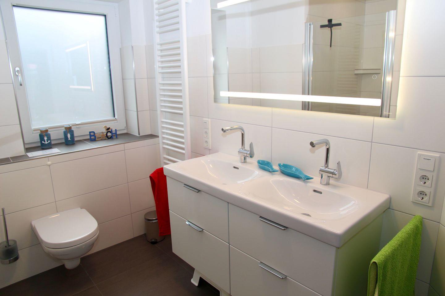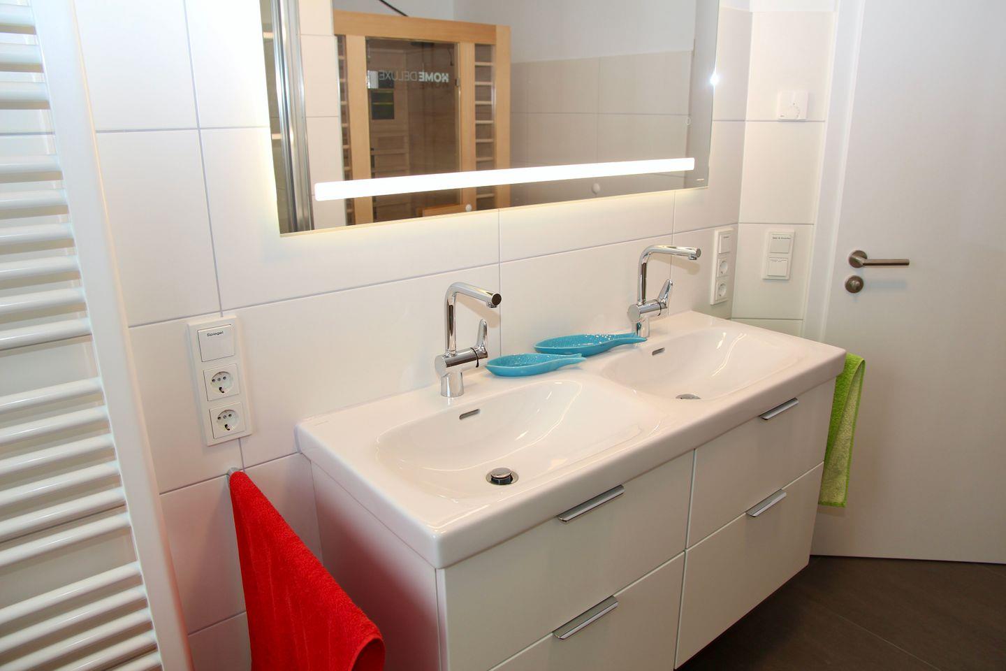 Ebenfalls im Erdgeschoss befindet sich ein Schlafzimmer mit Doppelbett, Fernseher und Kleiderschrank, sowie das großzügige Badezimmer mit Doppelwaschbecken, ebenerdiger Dusche, Toilette, elektrischem Handtuchheizkörper und der Infrarotkabine.