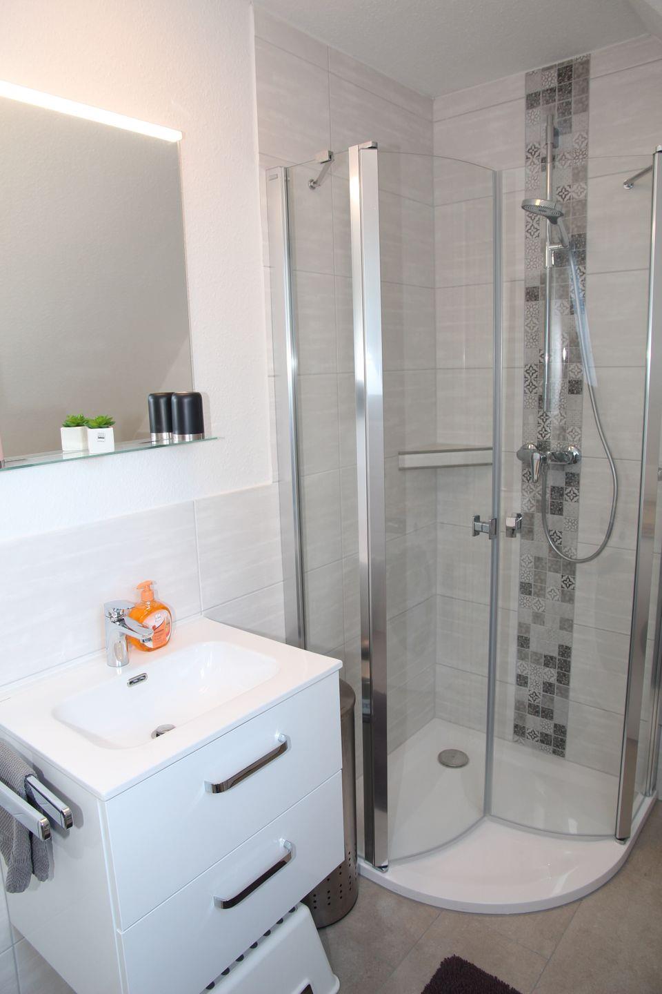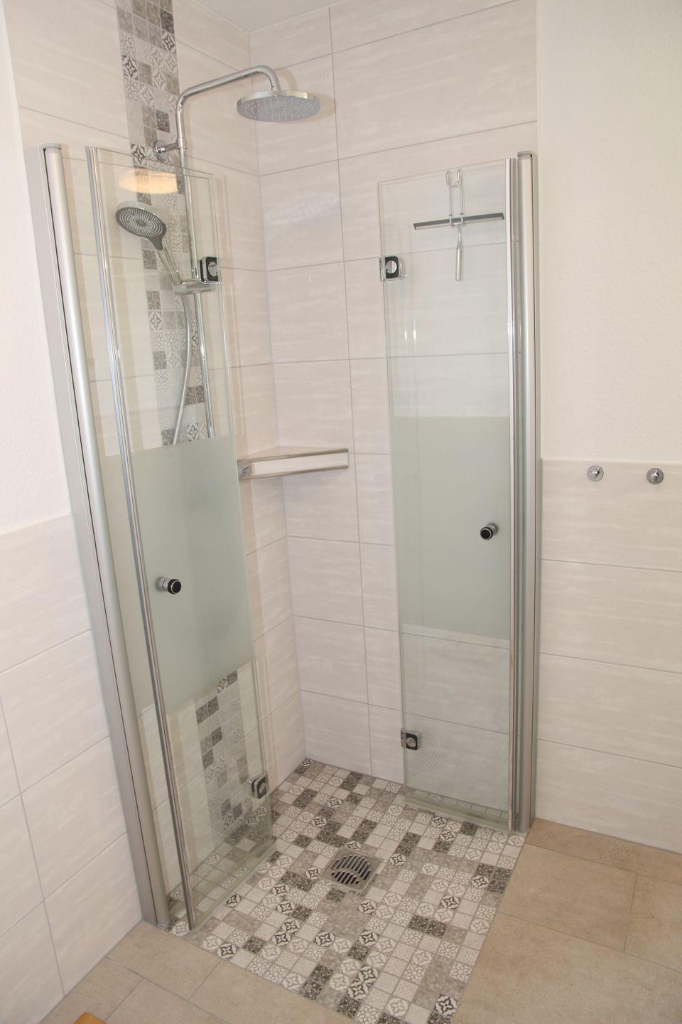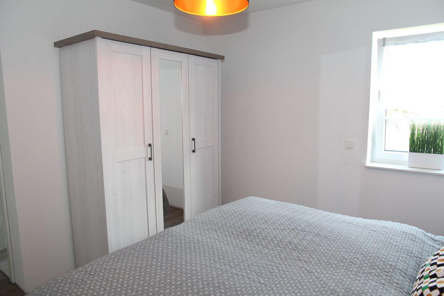 Im Erdgeschoss finden Sie ein großes Badezimmer mit ebenerdiger Dusche. Direkt angrenzend (Bad en Suite) befindet sich das erste Schlafzimmer mit Doppelbett und Kleiderschrank.