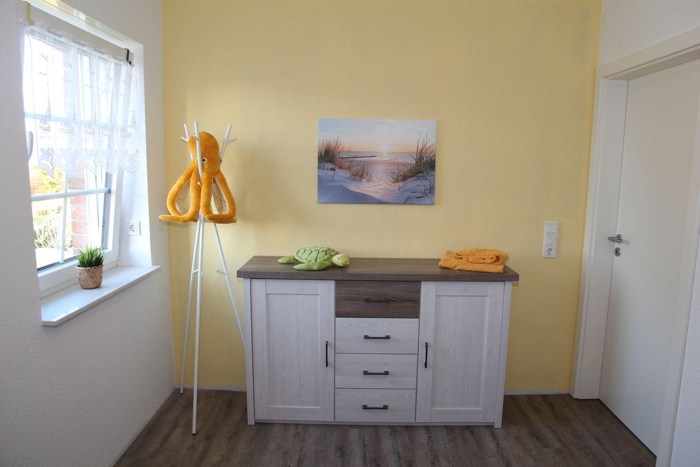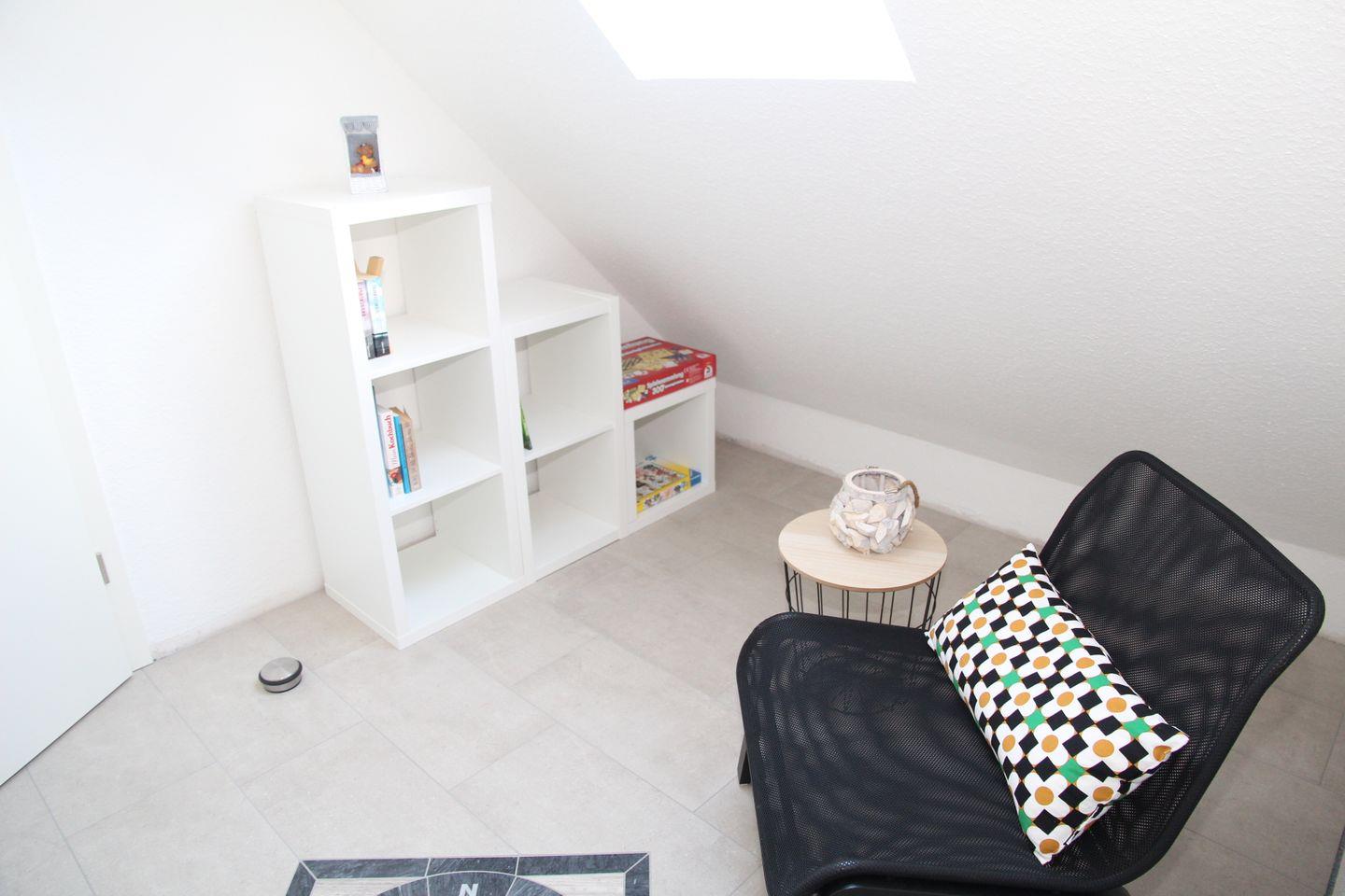 Im Obergeschoss finden Sie zwei weitere Schlafzimmer: Ein Schlafzimmer bietet ein weiteres Doppelbett mit Sessel, Kleiderschrank und Flachbildfernseher, in dem anderen Zimmer finden Sie zwei Einzelbetten und eine Kommode. Auch im Obergeschoss befindet sich noch ein Badezimmer mit ebenerdiger Dusche, Waschmaschine und Trockner. Aus den Dachfenstern im Obergeschoss hat man einen schönen Blick auf den Deich!