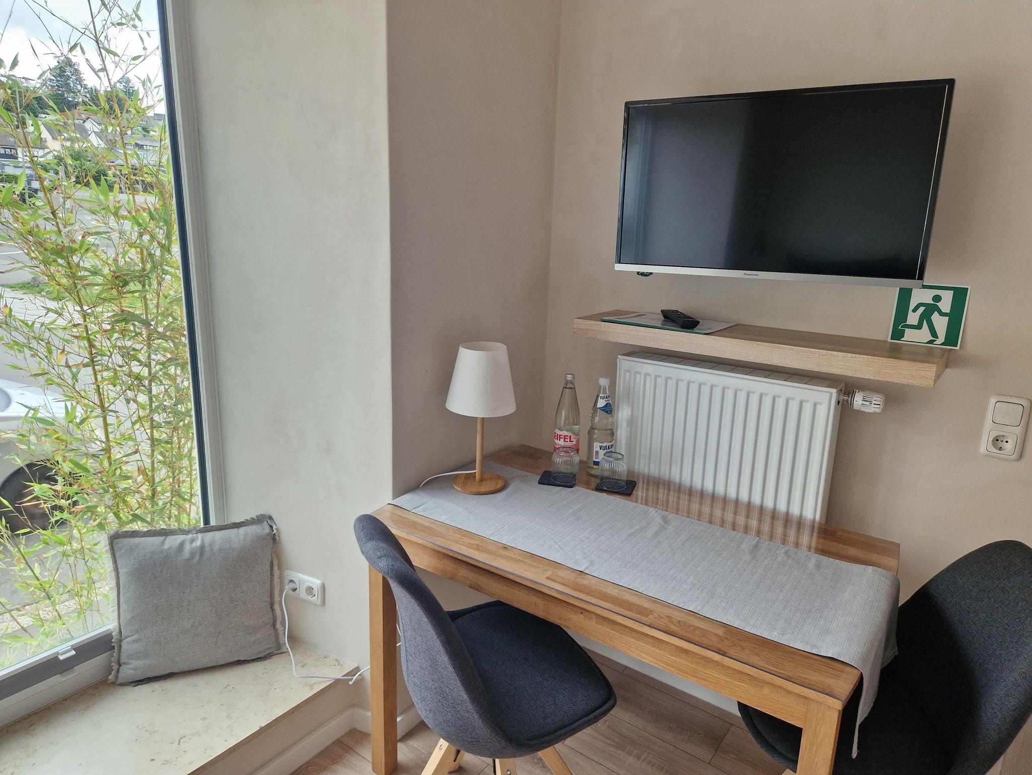 Zwei traumhaft schöne Appartments, zum Viehmarkt gelegen, laden Sie ein, Urlaub im reizvollen, charmanten Krimistädtchen Hillesheim zu machen. Auf ca 14m² Wohnfläche (über eine Treppe zu erreichen) finden Sie alles, was Sie für einen Urlaub oder Kurztrip benötigen. Beide Appartments sind ausgestattet mit einem Doppelbett, TV, WLAN, einer kleinen Küchenkombination mit 2 Herdplatten, Spüle, Wasserkocher, Kühlschrank sowie einer Mikrowelle. Am Tisch können Sie bequem Ihr selbst zubereitetes Frühstück einnehmen. Außerdem lassen sich auf dem geräumigen Tisch Brettspiele spielen oder auch Bürotätigkeiten erledigen- daher sind die Appartements auch hervorragend für Geschäftsreisende geeignet. Die Badezeile ist zweckmäßig mit einer Dusche, Waschbecken, WC und einem Fön + Duschbad bestückt. Vor dem Haus befinden sich auch kleine, in Bambus eingebettete Sitzkombinationen, aus welchen Sie, mit einer Tasse Kaffee oder einem Glas Wein, das Treiben auf der Straße beobachten können. Für die Zeit des Aufenthaltes stellen wir Ihnen 1 Badehandtuch, 1 Handtuch sowie 1 Gästehandtuch zur Verfügung. Ebenso stehen 1 Flasche Wasser p.Person, eine kleine Auswahl an unterschiedlichsten Teesorten sowie das erste Pulver für den Willkommenskaffee bei Ankunft, für Sie bereit.