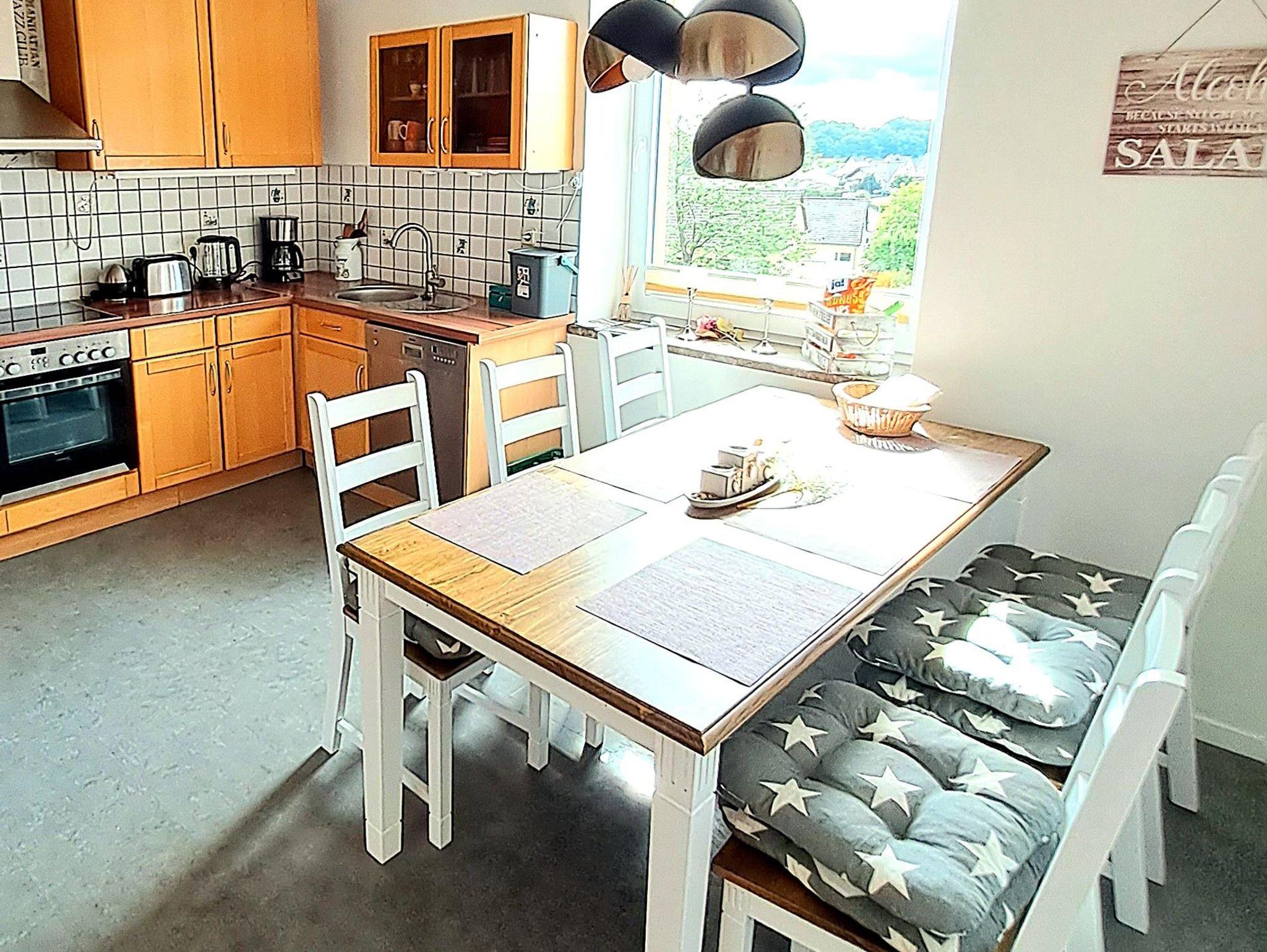 Sie ist 74 m² groß und verfügt über 2 Schlafzimmer, 1 Wohnzimmer, 1 Küche, 1 Bad. Das geräumigere Schlafzimmer verfügt über ein Doppelbett und einen 3.- türigen Kleiderschrank sowie einer Kofferablage. Hier, im Schlafzimmer, besteht auch die räumliche Möglichkeit, das Kinder- Reisebettchen aufzustellen. Das kleinere Schlafzimmer ist ausgestattet mit einem ausziehbaren Etagenbett für Erwachsene und einem Bürotisch+ Stuhl. Beide Zimmer sind vom Gästeflur begehbar. Das Wohnzimmer lädt Sie, mit seiner geräumigen, ausziehbaren Couch ein, einfach mal die Beine hochzulegen und den Abend bei guter Musik oder dem TV ausklingen zu lassen. Schauen Sie aus den Wohnzimmerfenstern, bietet sich Ihnen ein hervorragender Blick auf den direkt angrenzenden Viehmarkt, an dem jeden Donnerstag ein reges Treiben (Markttag) herrscht. Außerdem befindet sich auf der gegenüberliegenden Straßenseite die Eifel- Alm, eine Erlebnisgastronomie. Alle drei Zimmer sind zusätzlich mit Außenrollläden ausgestattet, die eine hervorragende Abdunkelung der Zimmer gewährleisten. Die geräumige Küche bietet einen fantastischen Ausblick auf die ehemalige Stadtmauer aus dem 13. Jhd. sowie einen Ausblick in das Bolsdorfer Tälchen, mit seinem 1,5 km langen Barfußweg und seinen 22 Stationen sowie zahlreichen Wanderwege. Außerdem, aus dem Küchenfester geschaut, lassen sich traumhafte Sonnenuntergänge genießen. Der geräumige Küchentisch biete Platz für 6 Personen + einem Kinderstuhl, so dass hier bequem die gesamte Familie Platz hat um nach dem Abendessen Brettspiele zu spielen. Das Badezimmer ist ausgestattet mit einer Badewanne, WC, WB, Fön sowie einem Kindertöpfchen. Eine Wickelunterlage ist ebenso vorhanden, wie eine Babywanne und Kindergeschirr in doppelter Anzahl. Eine Waschmaschine und ein Trockner befinden sich im kleinen Hauswirtschaftsraum der Gästewohnung und sind unentgeltlich nutzbar. Die Touristenabgabe von 1,50€ pro Person ist ebenso enthalten wie 1 Flasche naturell pro Person und einer Flasche Wein bei Ankunft sowie die Energiekosten. Bettwäsche und ein großes + ein kleines Handtuch pro Person (zur Nutzung während des Aufenthaltes) werden mit € 15,- pro Person berechnet.