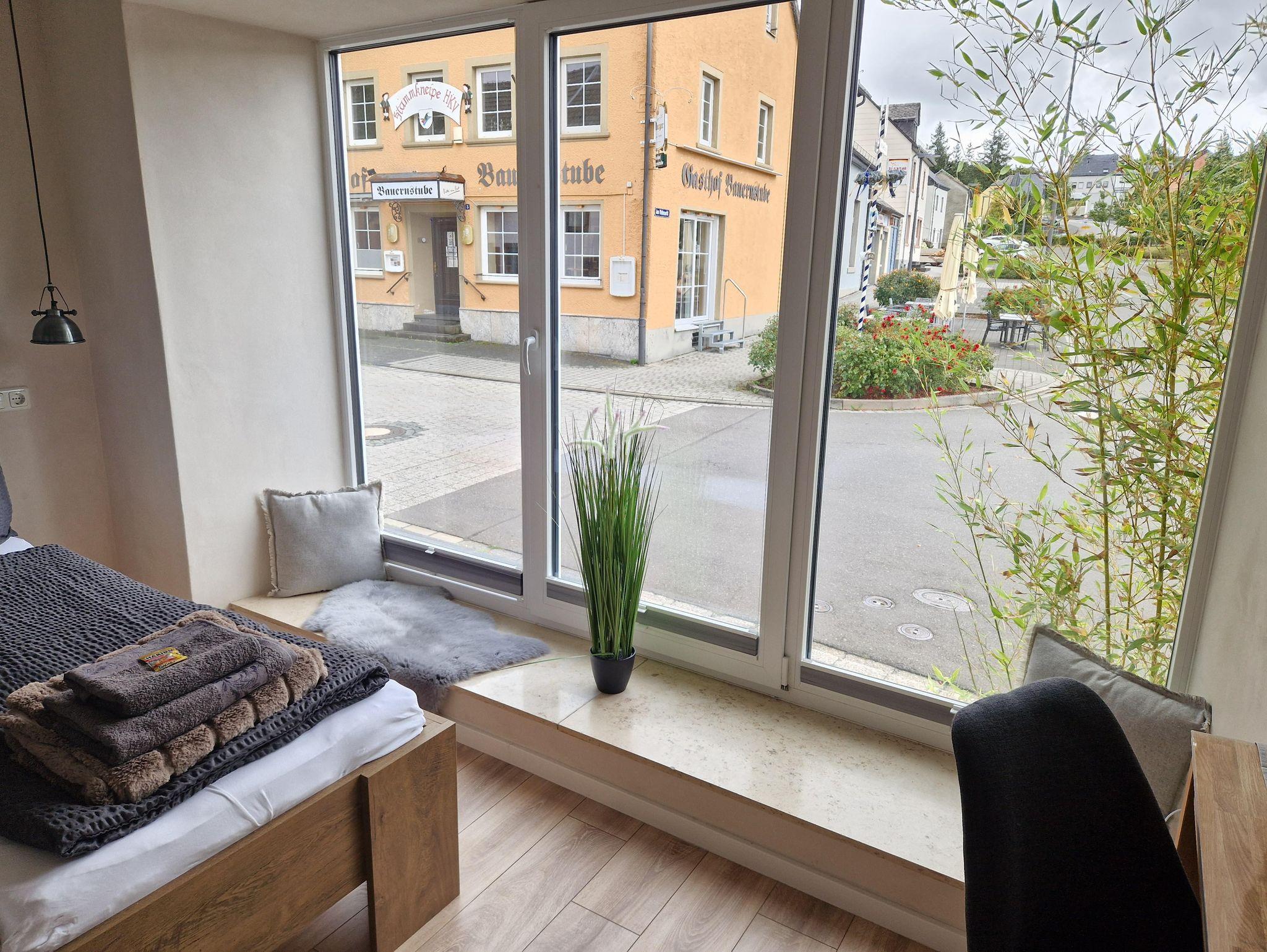 Zwei traumhaft schöne Appartments, zum Viehmarkt gelegen, laden Sie ein, Urlaub im reizvollen, charmanten Krimistädtchen Hillesheim zu machen. Auf ca 14m² Wohnfläche (über eine Treppe zu erreichen) finden Sie alles, was Sie für einen Urlaub oder Kurztrip benötigen. Beide Appartments sind ausgestattet mit einem Doppelbett, TV, WLAN, einer kleinen Küchenkombination mit 2 Herdplatten, Spüle, Wasserkocher, Kühlschrank sowie einer Mikrowelle. Am Tisch können Sie bequem Ihr selbst zubereitetes Frühstück einnehmen. Außerdem lassen sich auf dem geräumigen Tisch Brettspiele spielen oder auch Bürotätigkeiten erledigen- daher sind die Appartements auch hervorragend für Geschäftsreisende geeignet. Die Badezeile ist zweckmäßig mit einer Dusche, Waschbecken, WC und einem Fön + Duschbad bestückt. Vor dem Haus befinden sich auch kleine, in Bambus eingebettete Sitzkombinationen, aus welchen Sie, mit einer Tasse Kaffee oder einem Glas Wein, das Treiben auf der Straße beobachten können. Für die Zeit des Aufenthaltes stellen wir Ihnen 1 Badehandtuch, 1 Handtuch sowie 1 Gästehandtuch zur Verfügung. Ebenso stehen 1 Flasche Wasser p.Person, eine kleine Auswahl an unterschiedlichsten Teesorten sowie das erste Pulver für den Willkommenskaffee bei Ankunft, für Sie bereit.