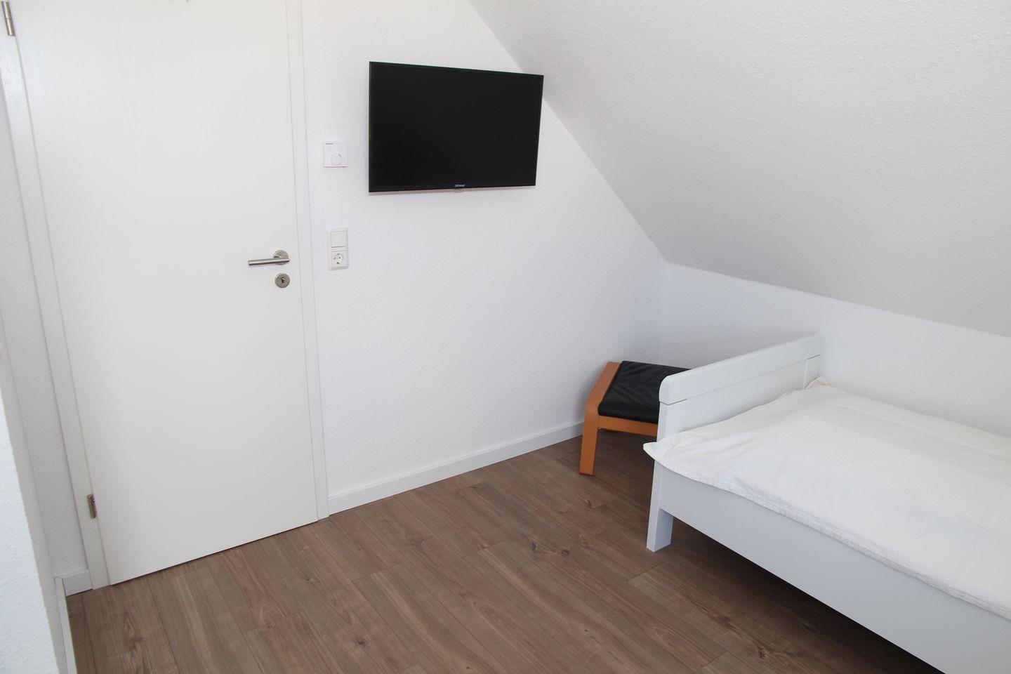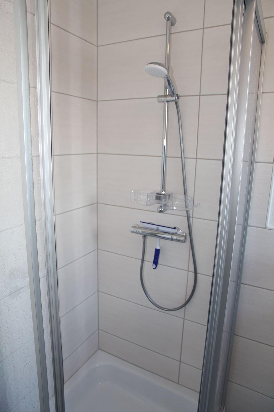 In der oberen Etage befinden sich zwei weitere Schlafzimmer und ein modernes Duschbad. In einem der Schlafzimmer befindet sich ein Doppelbett, ein Schrank sowie ein kleineres Ankleidezimmer, in dem zweiten Schlafzimmer befinden sich zwei Einzelbetten und ein Schrank. Beide Zimmer verfügen über einen weiteren Flachbildfernseher.