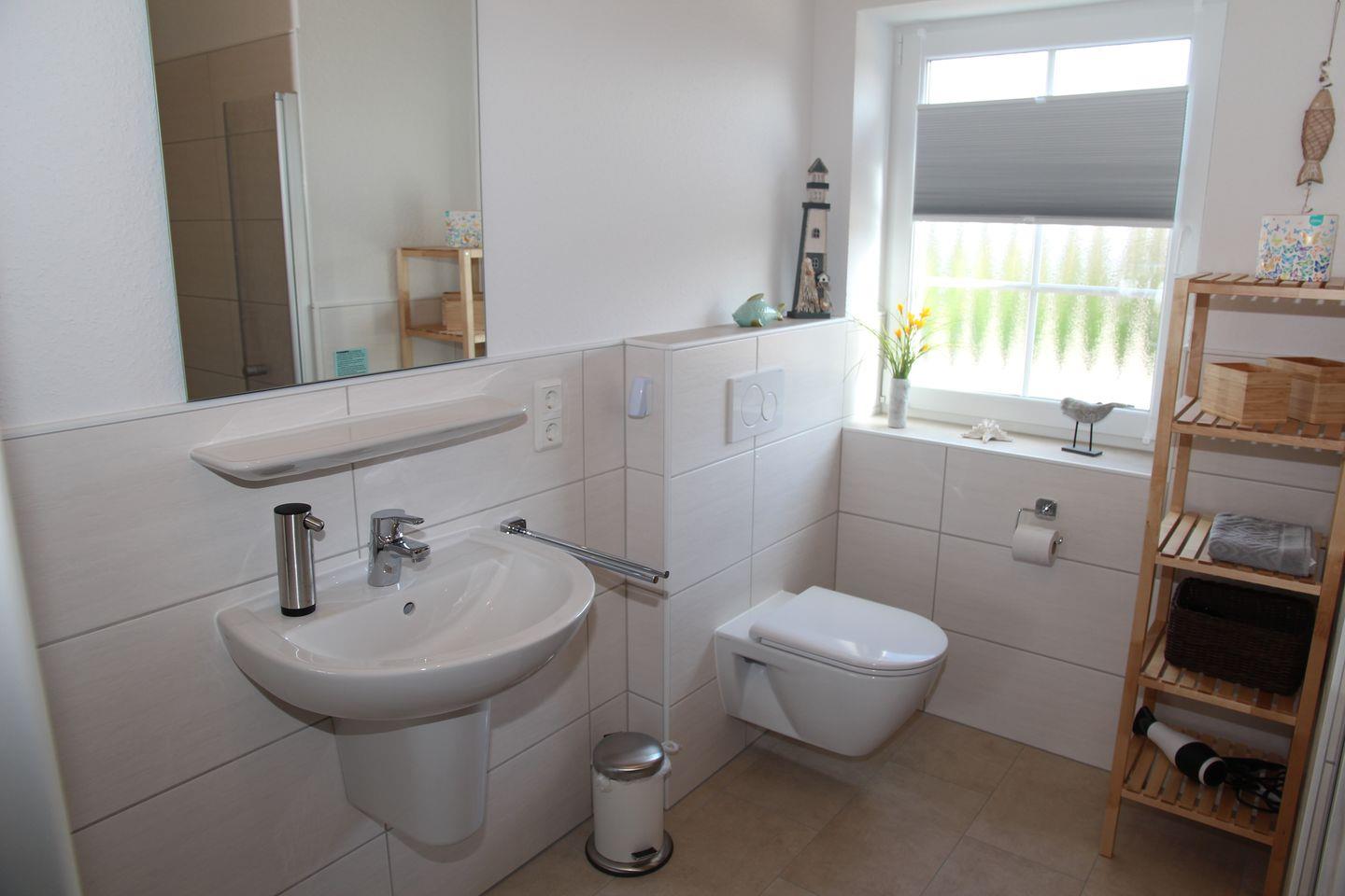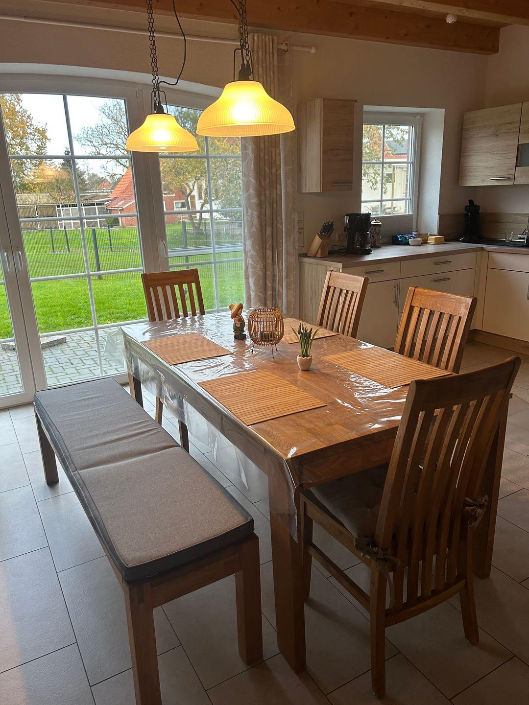 Das Erdgeschoss ist freundlich und modern eingerichtet. Die Küche ist komplett ausgestattet (Geschirrspülmaschine, Backofen, Mikrowelle, Cerankochfeld, Filterkaffee/Padmaschine, Kühlschrank, separates Gefrierfach, Wasserkocher, Toaster u.v.m.). Am Tisch haben 6 Personen bequem Platz (4 Stühle und eine Bank, der Tisch ist ausziehbar), von hier aus haben Sie einen traumhaften Blick in den Garten und auf das Wasser. Die möblierte Terrasse und der Grill laden zum Aufenthalt im Freien ein.