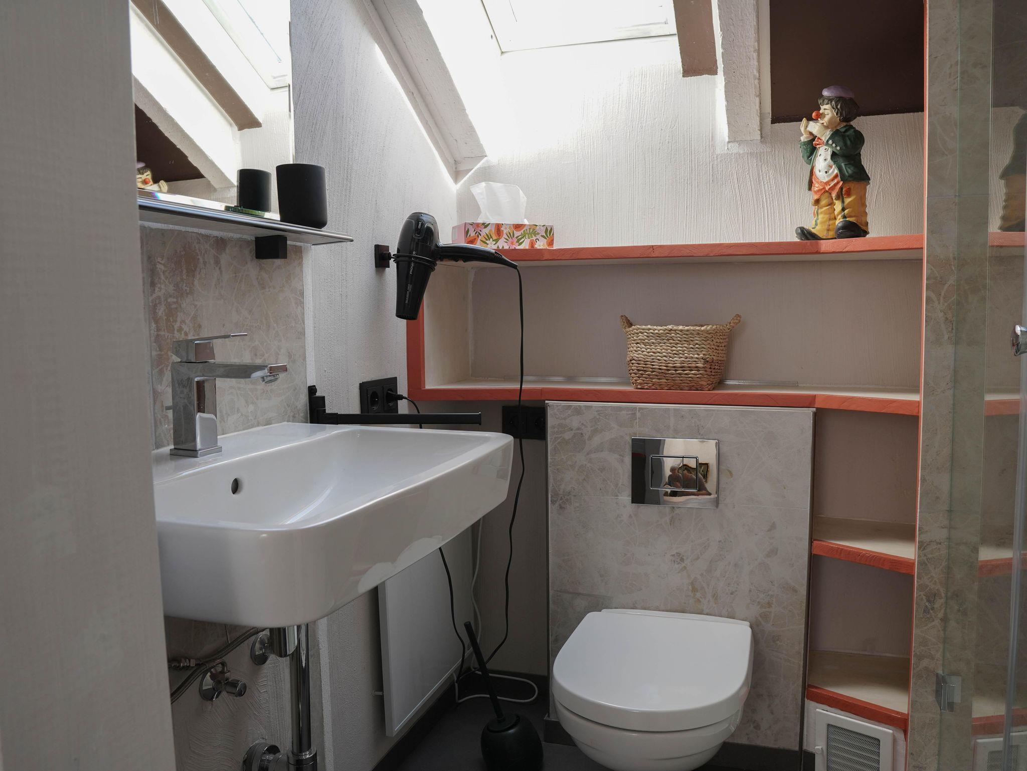 Auf rund 80 qm finden bei mir bis zu vier Personen Platz. Im Obergeschoss gibt es zwei Schlafzimmer: eines mit gemütlichem Boxspringbett (1,60 m) und Balkon, das andere mit zwei Einzelbetten (1 x 2 m) – beide mit eigenem Fernseher. Das Tageslichtbad befindet sich ebenfalls im Obergeschoss.