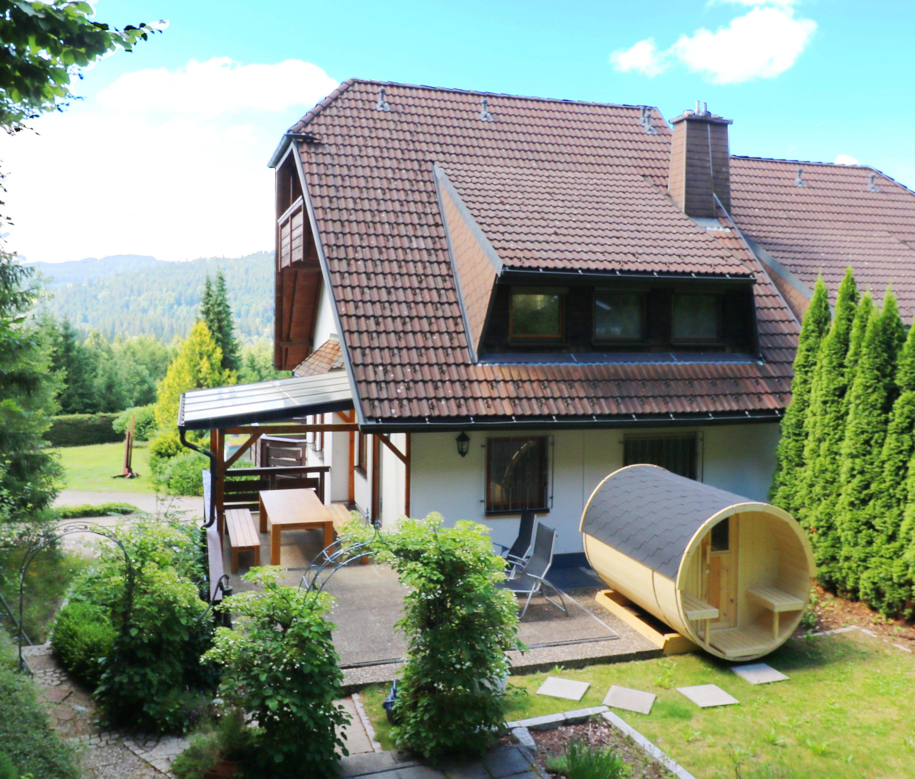 On this level there is also a large terrace covered with safety glass that invites you to linger comfortably. The terrace is open to the garden and ends directly at the edge of the forest. In the garden is a new barrel outdoor sauna with additional seating.The sauna reaches a maximum temperature of 60-70 degrees after one hour of warming up. If necessary, the temperature of the sauna can be increased with an infusion.