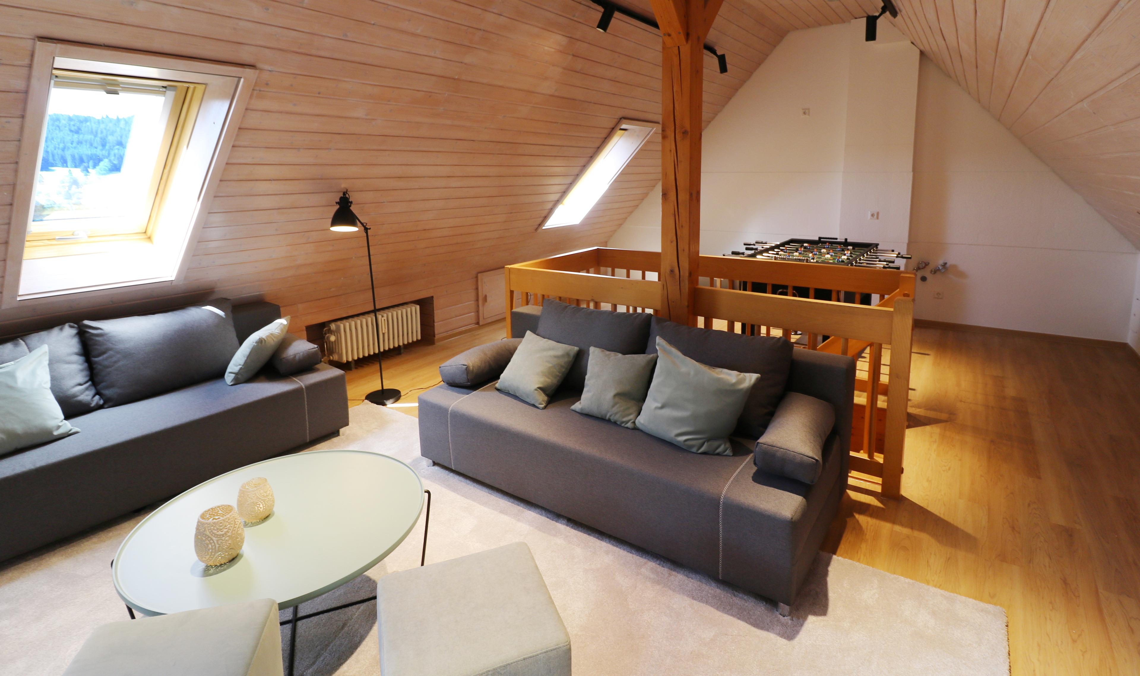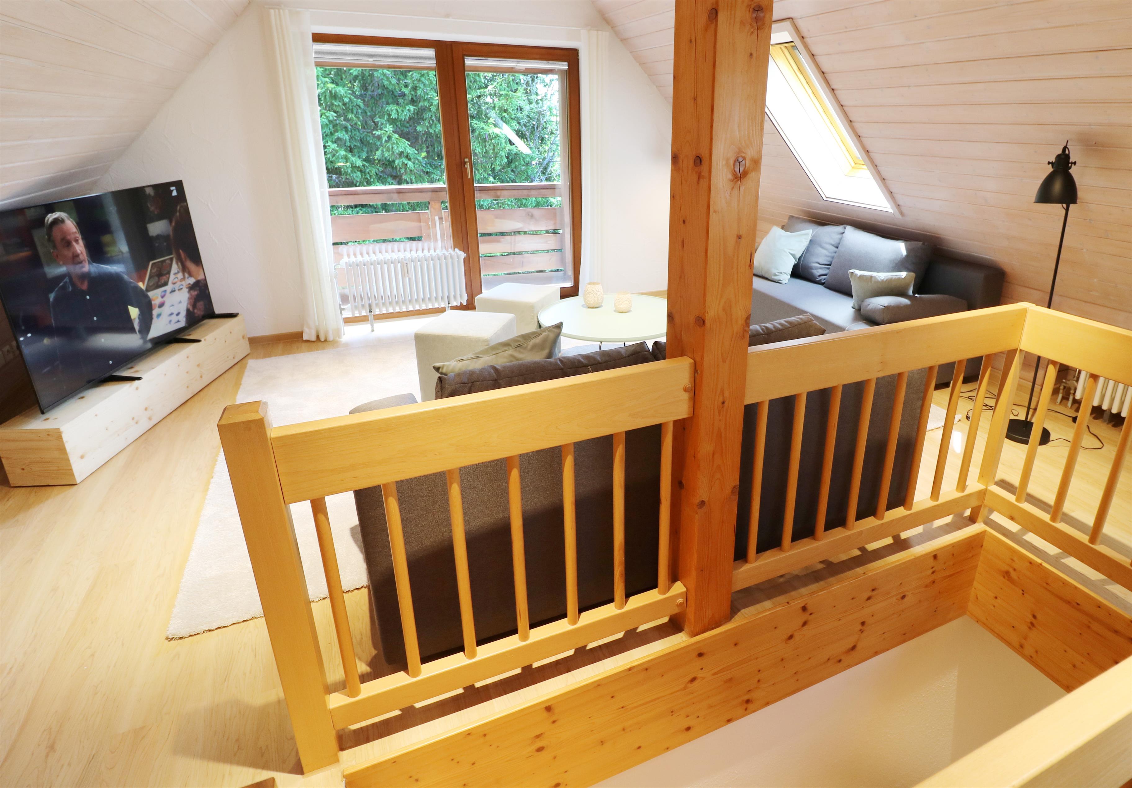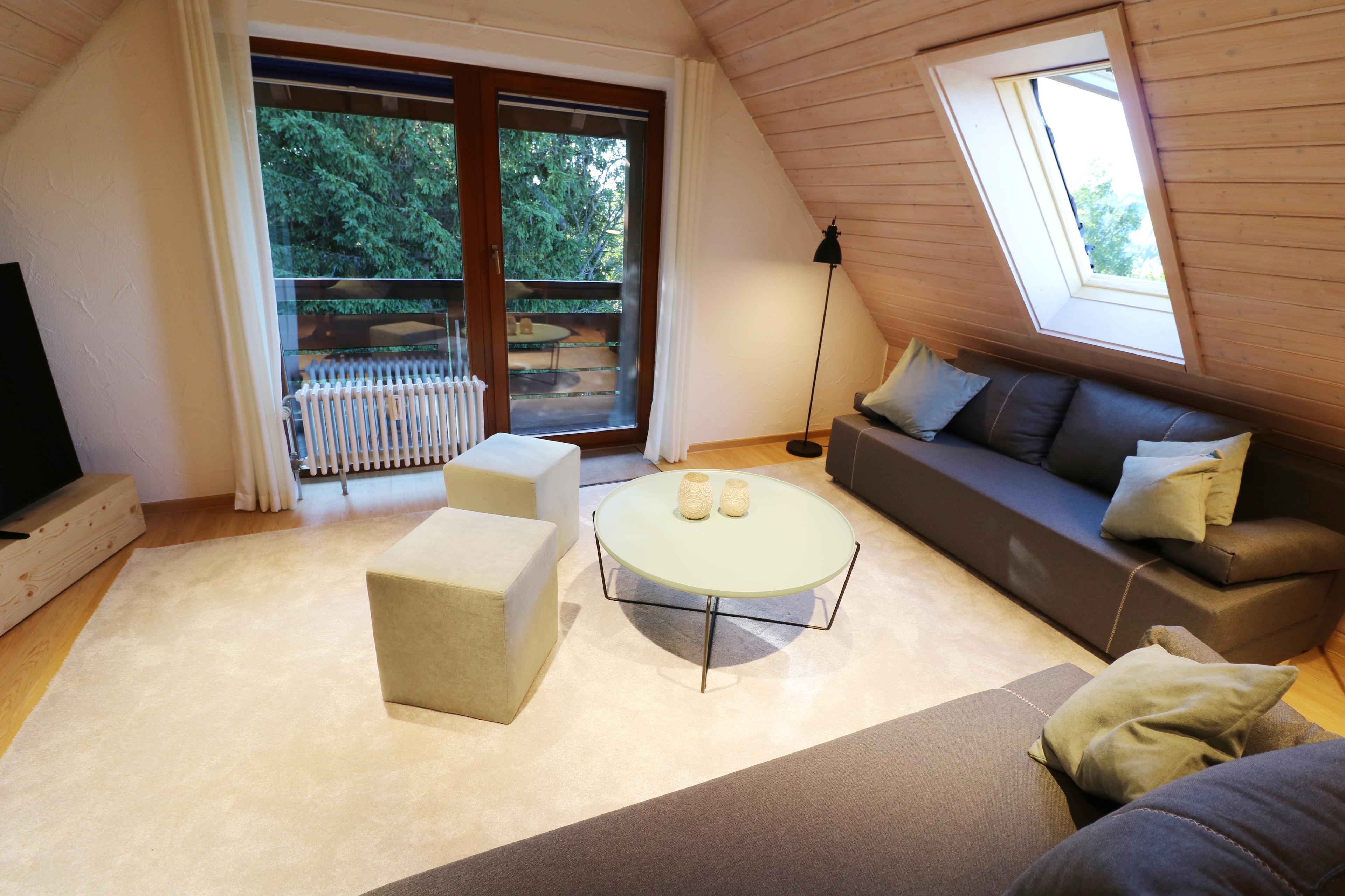 - open living and dining area with cozy chill lounge with TV, tiled stove and large south-facing balcony with magnificent views of the idyllic mountain landscape of the Black Forest