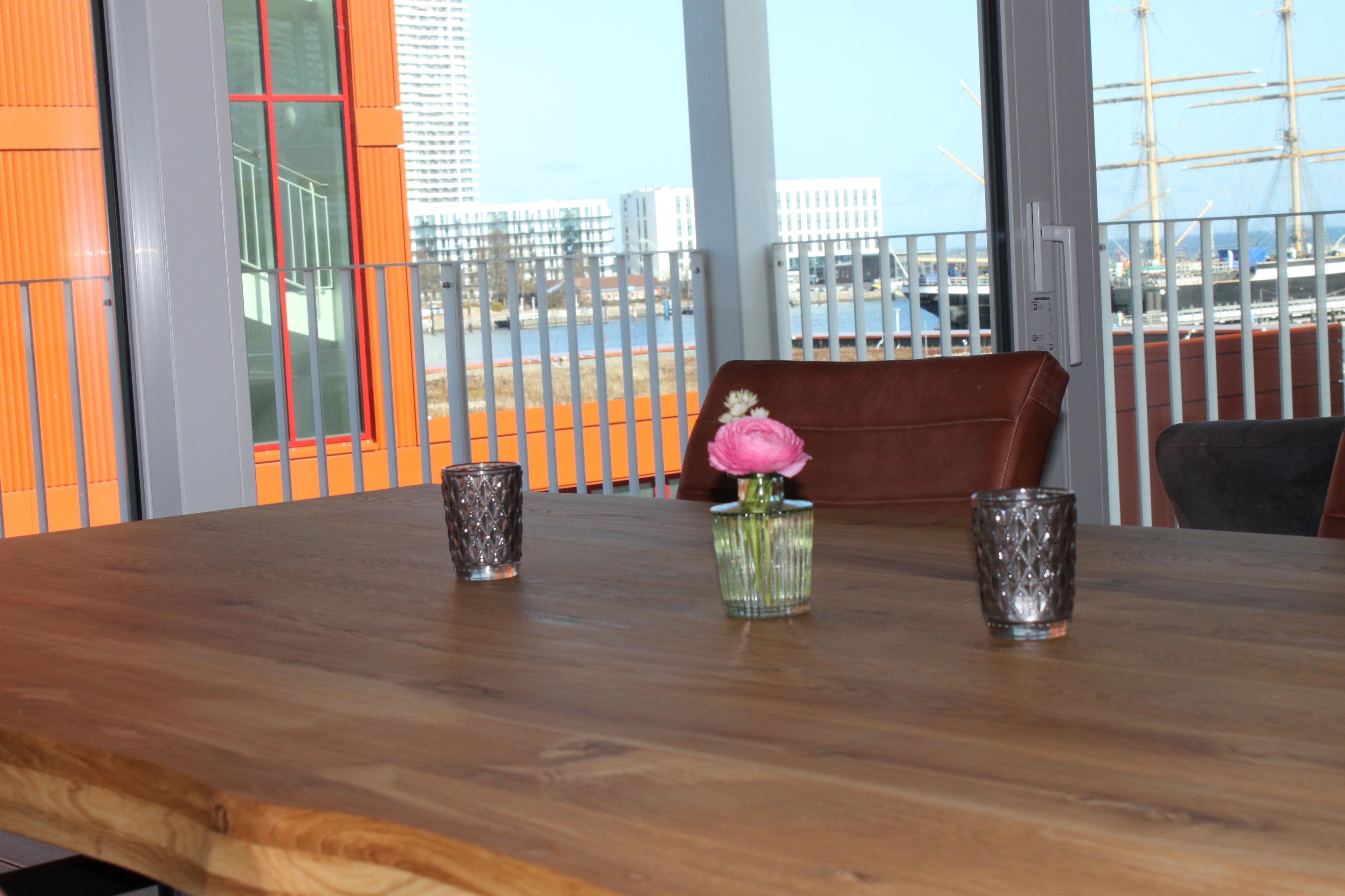 Regendusche. Im Wohnbereich sorgen am Abend die Flammen des Bioethanolkamins für eine gemütliche Atmosphäre, ebenso wie die vorbeifahrenden großen Schiffe mit ihrer eindrucksvollen nächtlichen Beleuchtung.