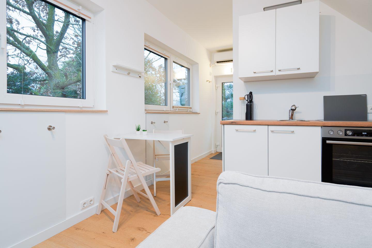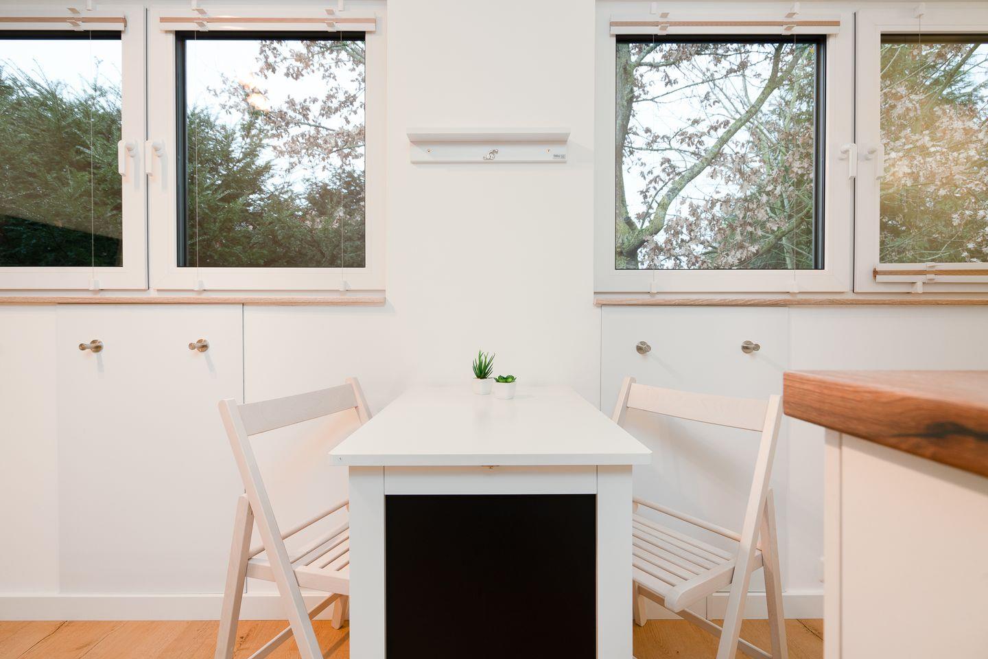 Bis zu zwei Personen (plus 1 Kleinkind) finden hier auf rund 45 m² einen Ort der Erholung. Von dem hellen Wohn-/Essbereich mit offener Küche haben Sie eine herrliche Sicht ins Grüne. Das komfortable Sofa lädt zu gemütlichen Fernsehabenden ein. Bei schönem Wetter können Sie Ihr Essen oder ein Glas Wein, mit Blick auf einen kleinen Teich, auf der Terrasse in vollen Zügen genießen.