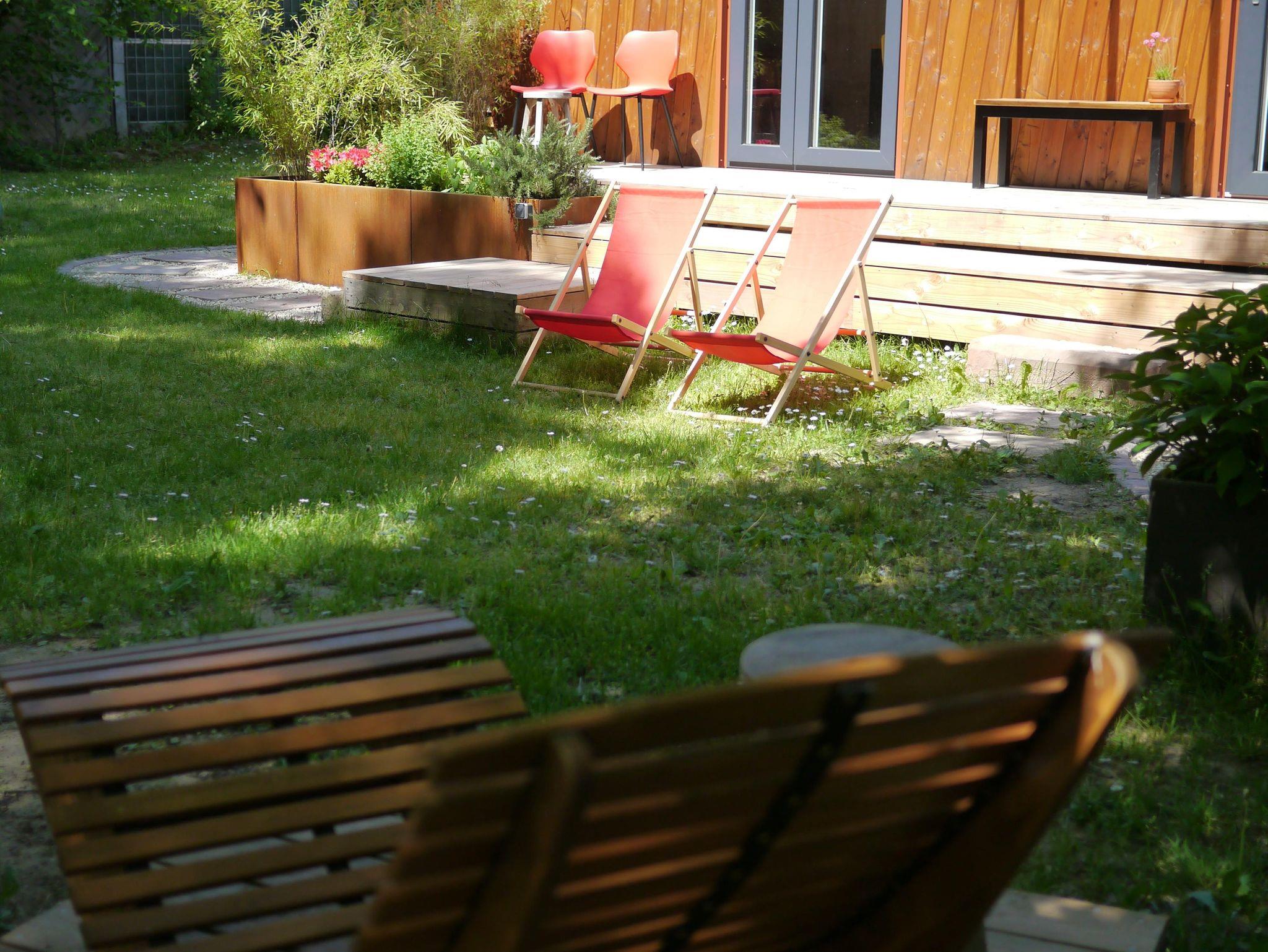– Privater Sitzbereich im Grünen mit Liegestühlen, Gartenmöbeln & Marktschirm