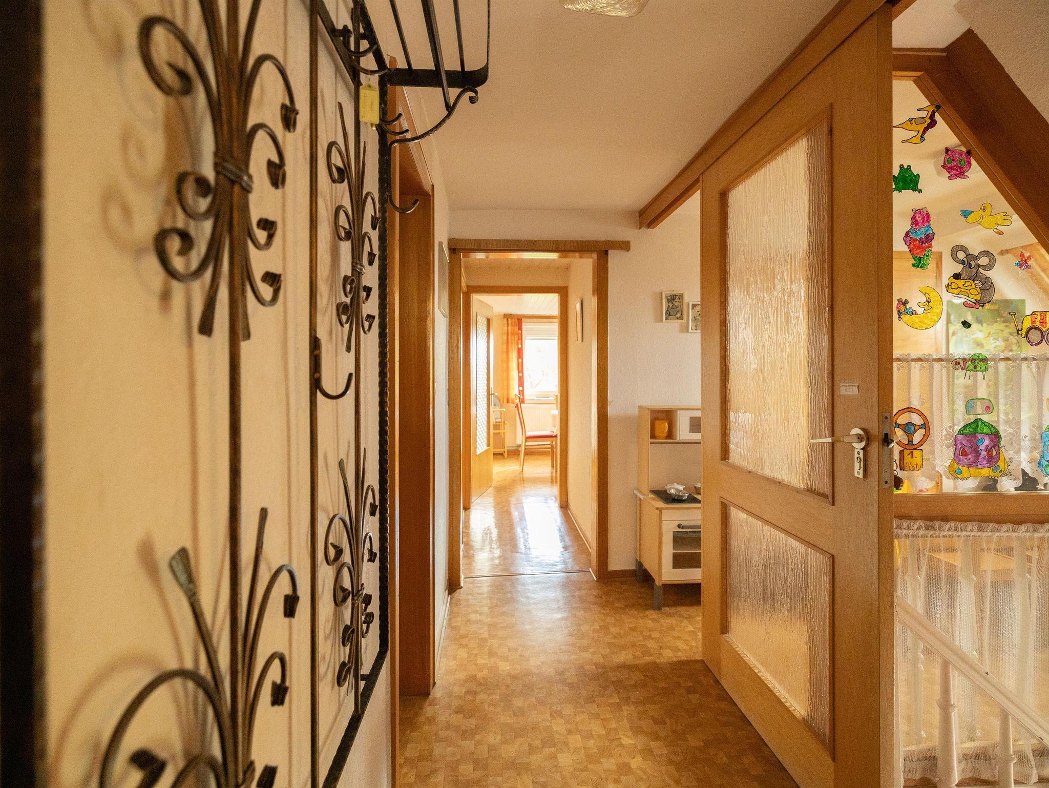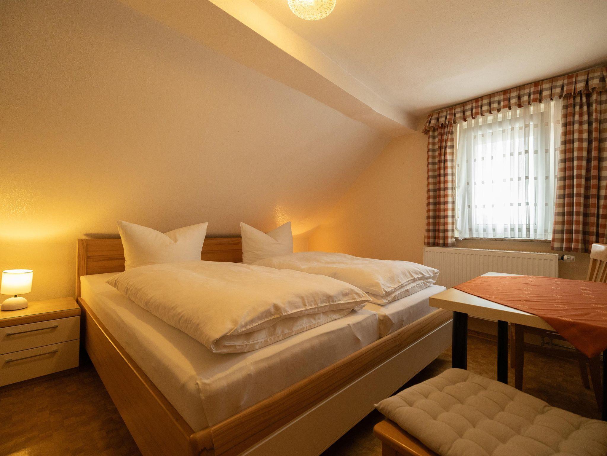 Großzügige 70 m² große Ferienwohnung im ersten Obergeschoss des Fachwerkferienhauses – ideal für Familien bis sechs Personen. Die Wohnung verfügt über vier Zimmer, Küche und Bad. Drei Schlafzimmer mit jeweils einem Doppelbett sowie zwei Kinderbetten bieten ausreichend Platz für Eltern und Kinder. Die Wohnküche mit Esstisch, Couch und Flat-TV ist komplett ausgestattet. Dort finden Sie Kaffeemaschine, Toaster, Wasserkocher, Haarfön und Kinderstuhl. Das Badezimmer umfasst Duschkabine, Waschbecken und WC. Bettwäsche, Geschirr- und Handtücher, WLAN und Endreinigung sind inklusive.