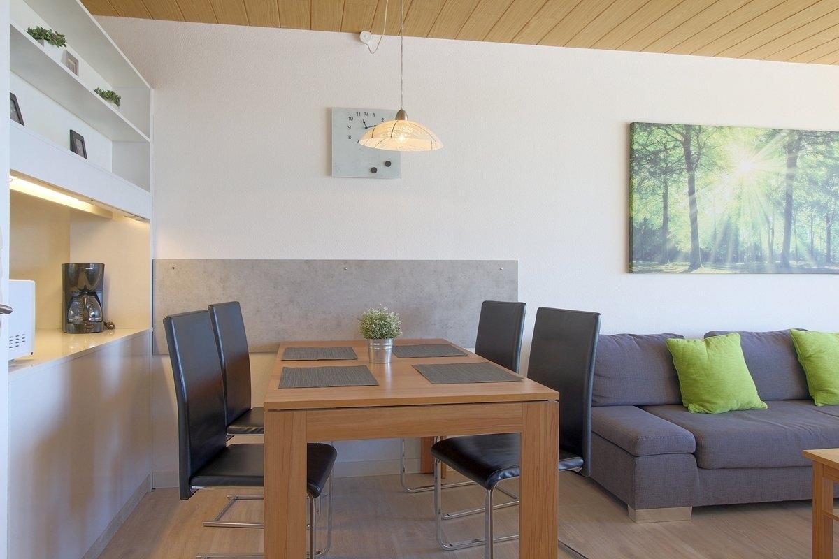 Komfortabel ausgestattete, Nichtraucher- Ferienwohnung mit einem Schlafraum mit Doppelbett und 40 Zoll-SmartTV, sowie Stockbett für die Kinder im zweiten Schlafraum, Küchenzeile mit Essecke und Wohnraum mit bequemer Sitzgarnitur und 55 Zoll-SmartTV. Der Wohn-und Schlafbereich ist mit Laminatboden ausgestattet.