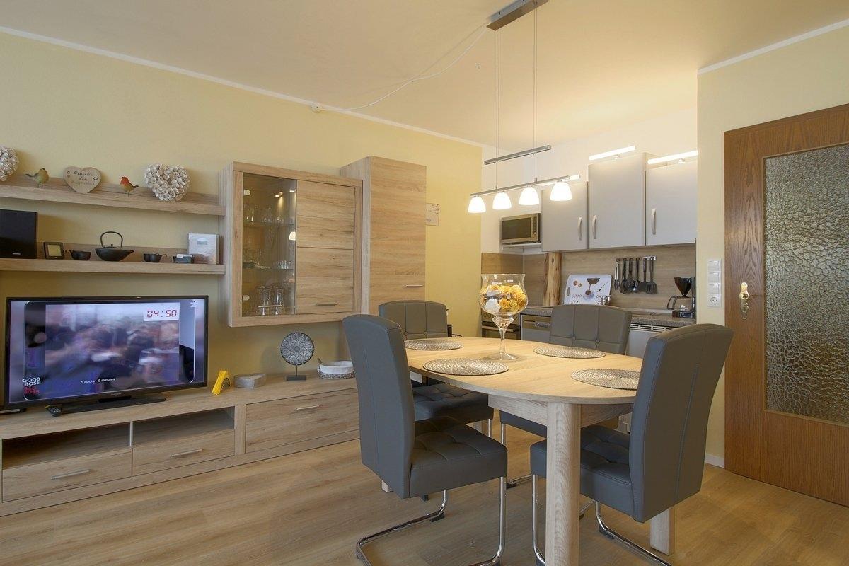 Modern und gemütlich ausgestattete, Nichtraucher- Ferienwohnung mit einem Schlafraum mit zwei Einzelbetten (0,90 x 2,00 m) und einem Schrankbett (1,40 x 2,00 m) im Wohnraum. Offener Wohn- und Essbereich mit moderner Küchenzeile mit Geschirrspüler. Die Wohnung ist mit Vinylboden ausgestattet. Hunde sind erlaubt.