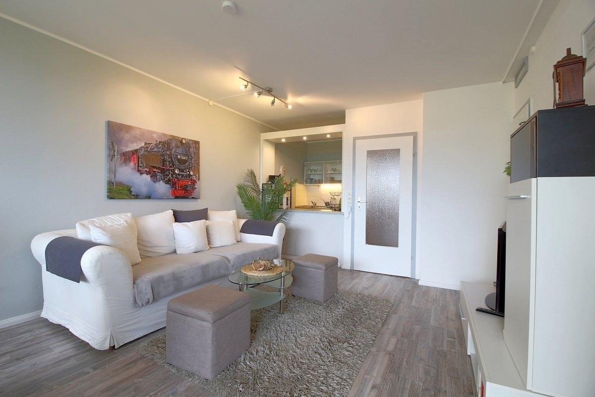 Modern eingerichtete, Nichtraucher- Ferienwohnung mit einem Schlafraum mit Doppelbett (1,80 x 2,00 m) und Stockbett für Kinder im zweiten Schlafraum, moderne Küchenzeile, Essecke und Wohnraum.