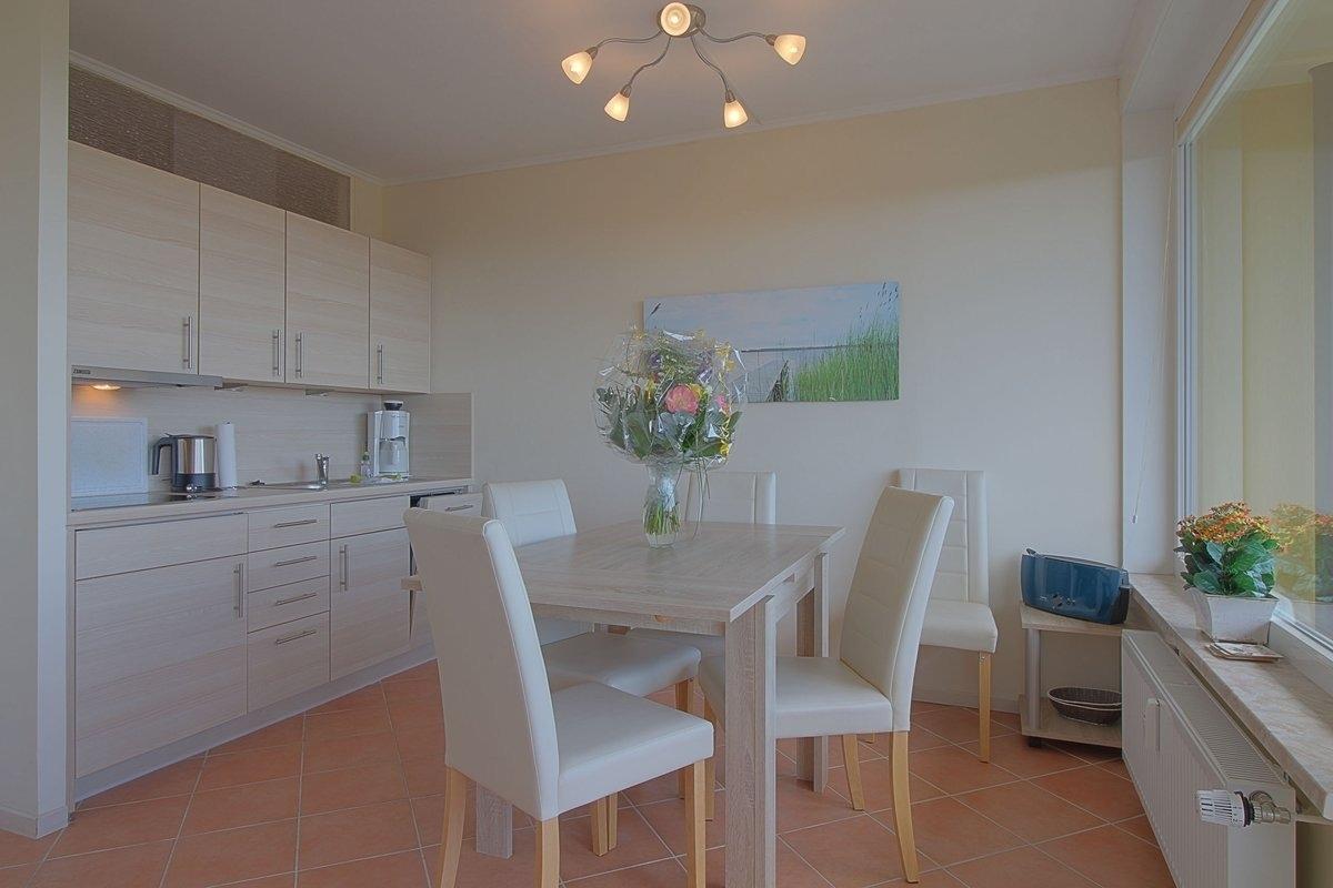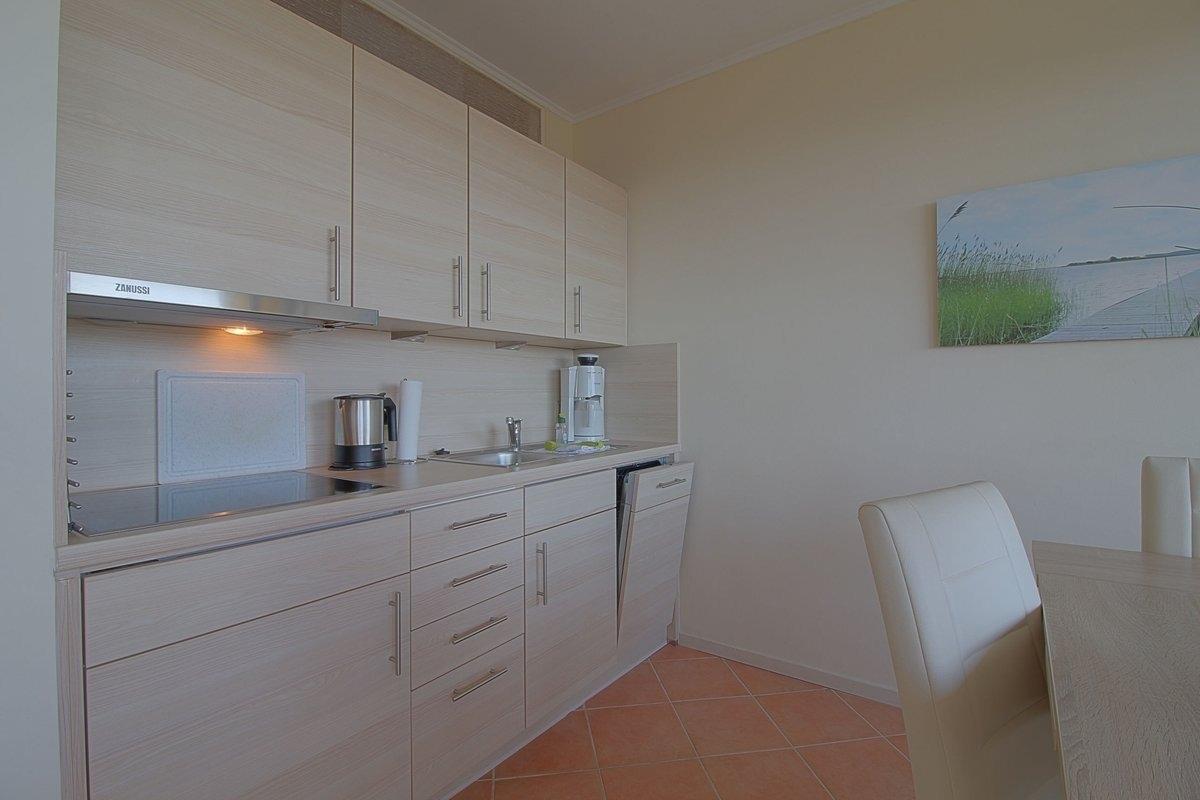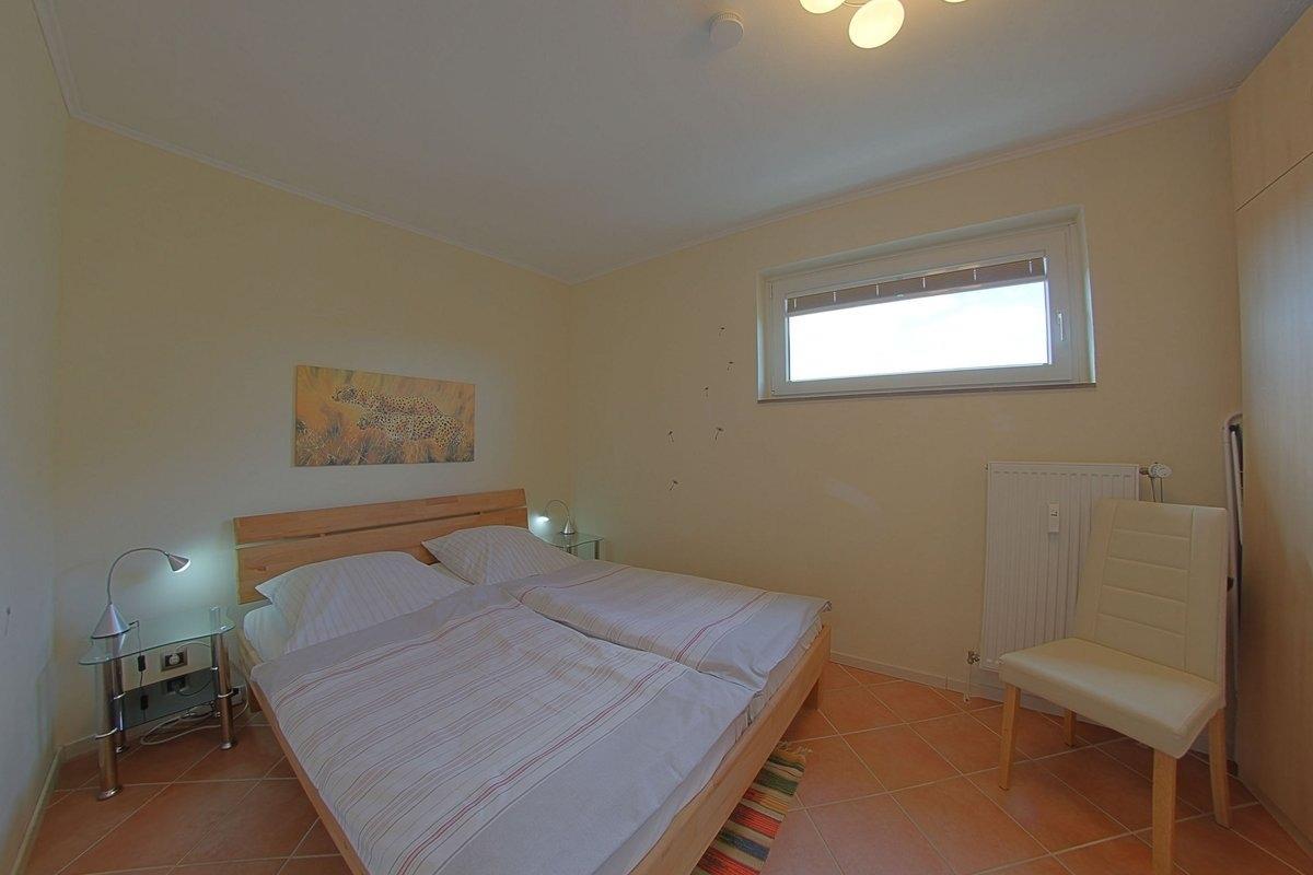 Moderne, hochwertig eingerichtete Nichtraucher- Ferienwohnung mit einem Schlafraum mit Doppelbett (1,80 x 2,00 m) und Stockbett für die Kinder im zweiten Schlafraum, Küchenzeile mit Essecke und Wohnraum. Der Wohn-und Schlafbereich ist mit Fliesenboden ausgestattet. Modernisiertes Duschbad