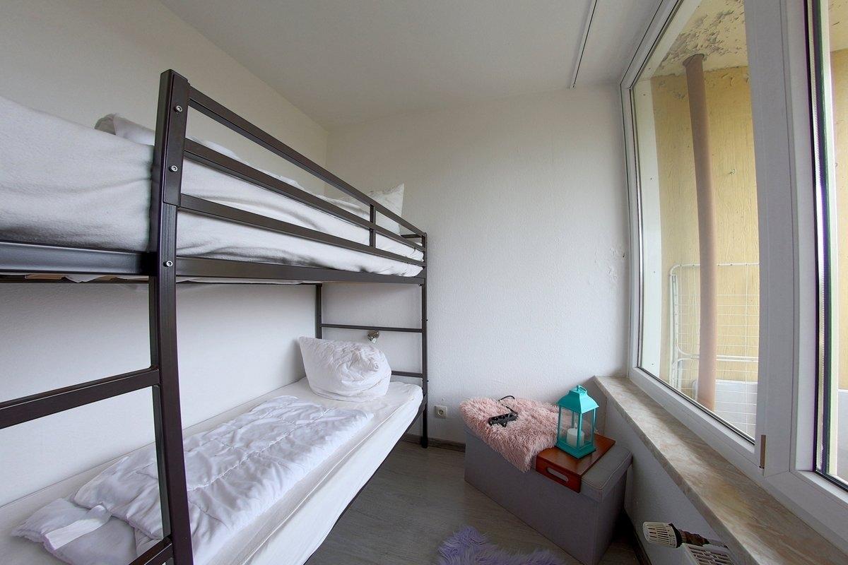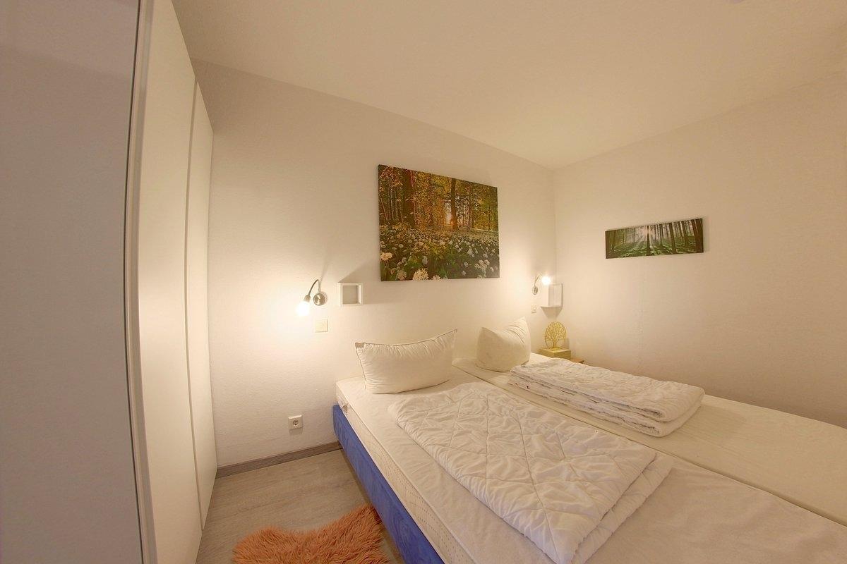 Komfortabel ausgestattete, Nichtraucher- Ferienwohnung mit einem Schlafraum mit Doppelbett (1,60 x 2,00 m) und Stockbett für die Kinder im zweiten Schlafraum, schicke neue Küche,[nbsp] Essecke und Wohnraum mit bequemer Sitzgarnitur. Der Wohn-und Schlafbereich ist mit Laminatboden ausgestattet. Kostenloses W-Lan in der Wohnung vorhanden.