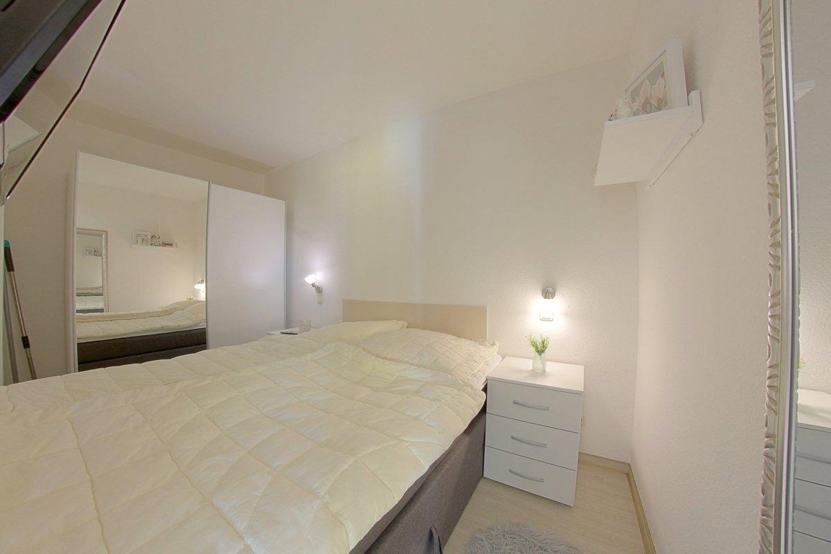 Hell und freundlich präsentiert sich diese schick renovierte Nichtraucher- Ferienwohnung mit einem Schlafraum mit Boxspringbett (1,80 x 2,00 m) und TV und im zweiten Schlafraum ein kleines Doppelbett (1,20 x 2,00m).[nbsp] Moderne Einbauküche mit Essecke und Wohnraum mit großem Ecksofa. Die Wohnung ist mit pflegeleichten PVC-Bodenbelägen im Wohn- und Schlafbereich ausgestattet. Modernes Wannenbad
