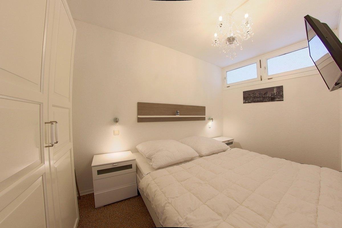 Komplett modernisierte Nichtraucher- Ferienwohnung mit einem Schlafraum mit Doppelbett (1,80 x 2,00 m) und TV. Im zweiten Schlafraum steht ein Einzelbett (0,90 x 2,00 m) mit einem kleinen Tisch z. B für Laptop.